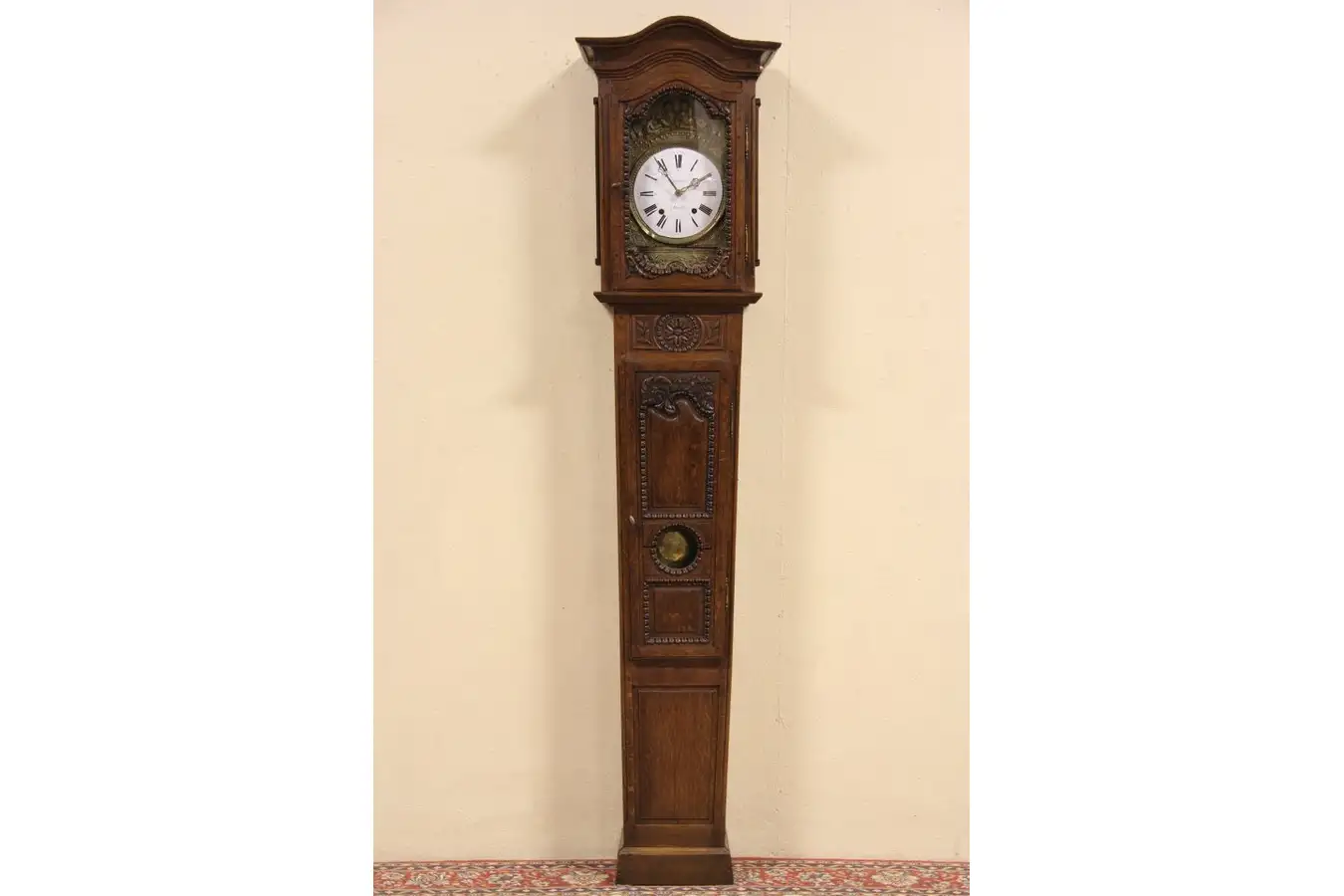 An authentic Country French tall case or grandfather clock from around 1830 has a wonderfully detailed hand carved oak case, and the porcelain dial is signed by the maker, "Legrand a (of) Fauville." Fauville is a village in Normandy, northwest of Paris.