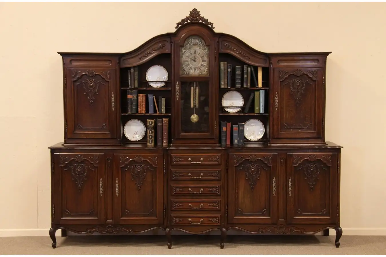 Richly carved of solid fine-grained oak in classic Country French design, this large sideboard has lots of storage, display and a clock. The deep brown finish is excellent on this exemplary vintage furniture from about 40 years ago.