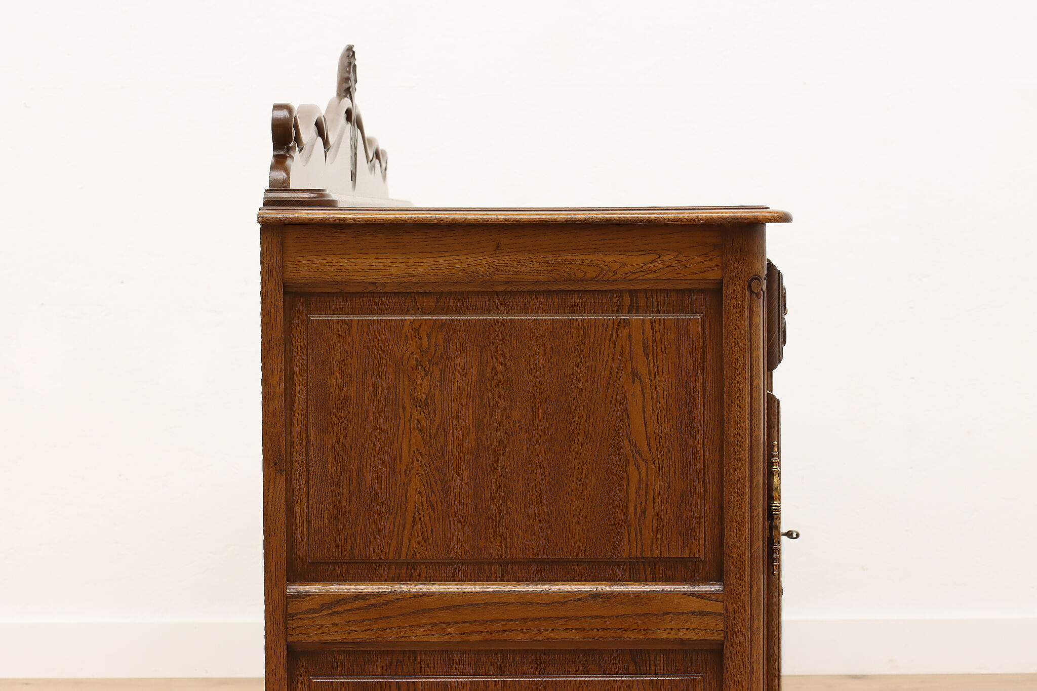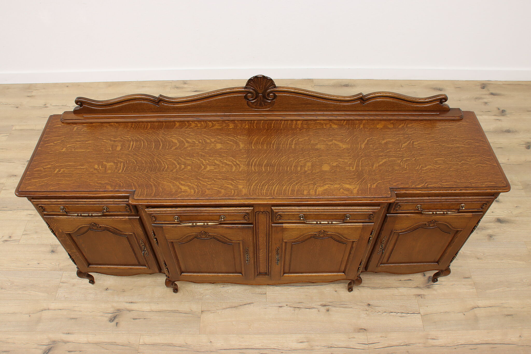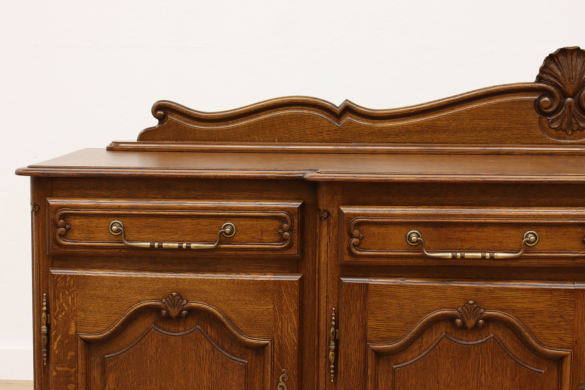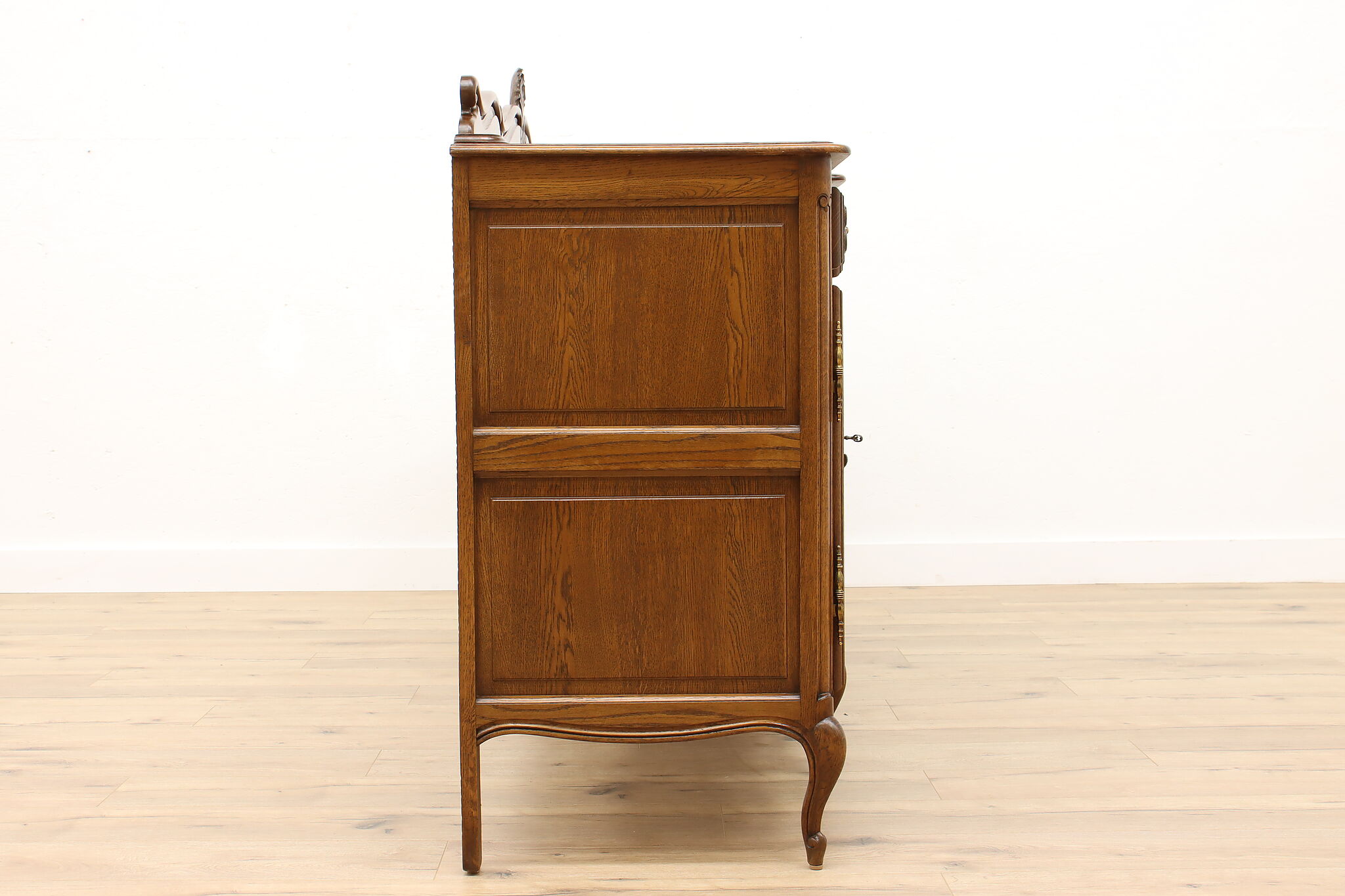 A Country French buffet, bar cabinet, hall or TV Console has charming carved details and shell motifs.