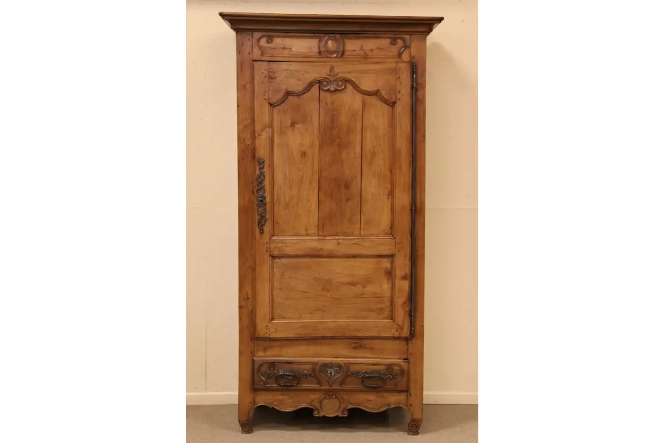 Authentic country French or provincial furniture from about 1780, a magnificent one door armoire was hand-crafted of solid chestnut hardwood.