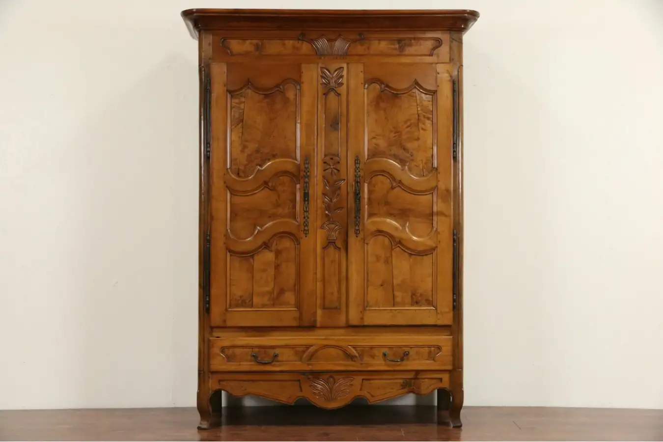 An authentic Country French armoire was hand crafted about 1780 of solid wormy fruitwood with ash burl panels. The old finish is very well preserved with warm antique patina on this antique furniture from France. Waxed and buffed, all that is needed to maintain its luster is an occasional wipe with a soft dry cloth.