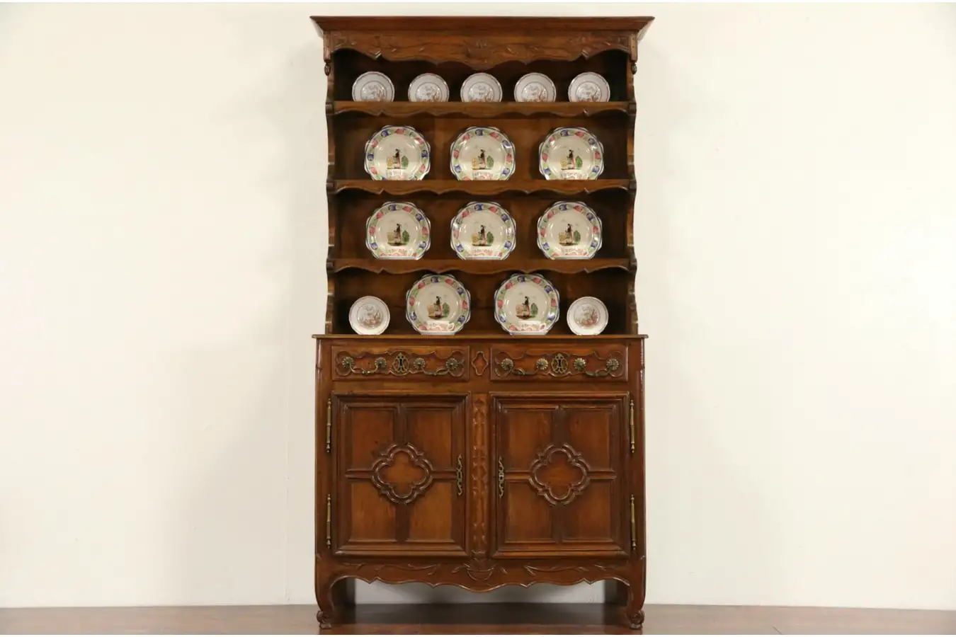 An authentic Country French pewter cupboard from about 1860 was often called a "Welsh Dresser" in England. Hewn of solid oak and chestnut, there are chisel marks from a master carver on every surface.