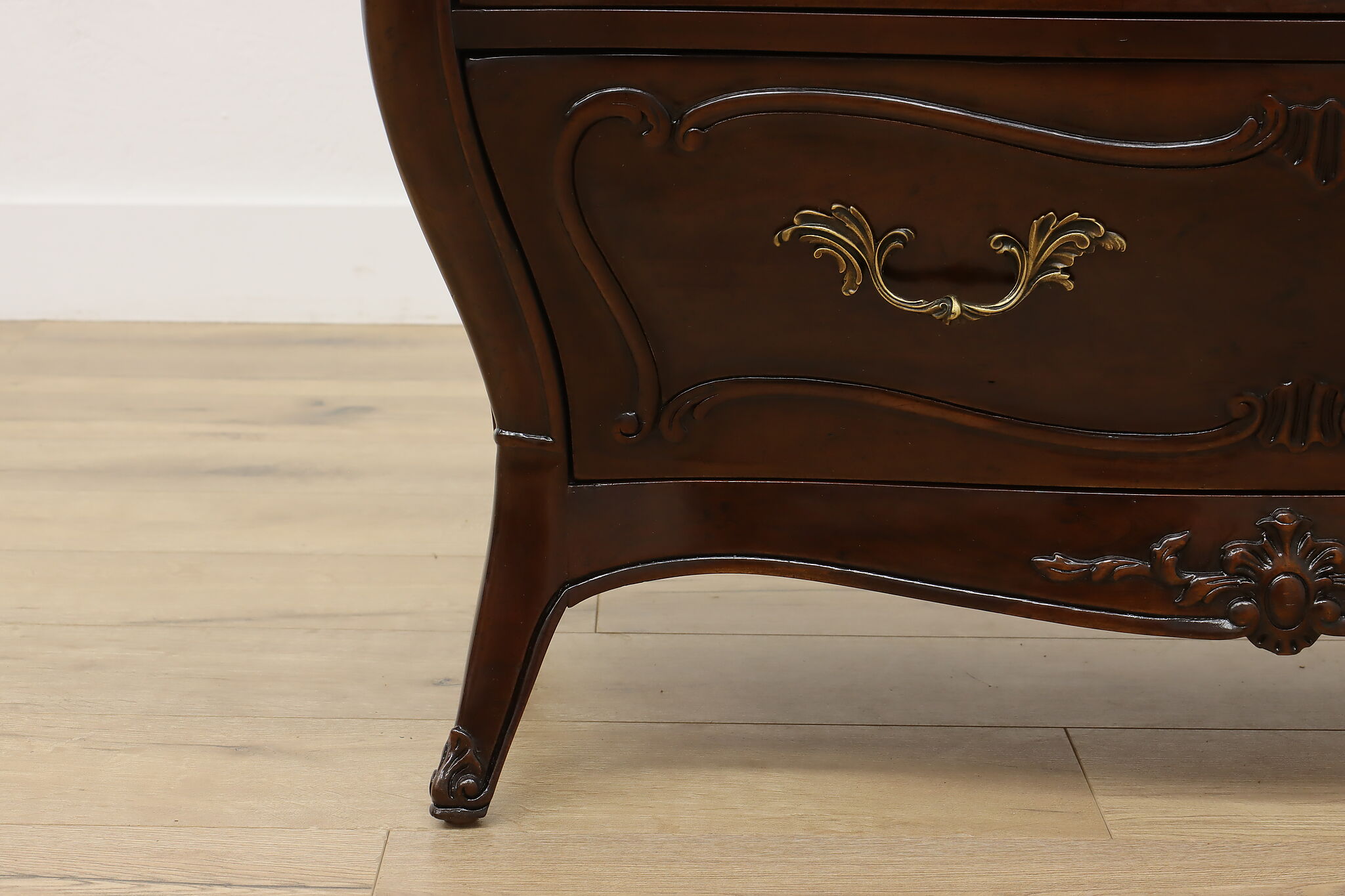 This Country French or Provincial design "bombe" chest or dresser is signed "Henredon."