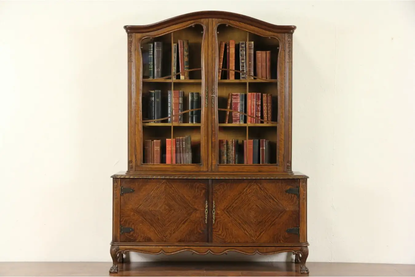 Waxed and buffed, all that is needed to maintain the antique patina is an occasional wipe with a soft dry cloth. There is color variation on this finely crafted furniture, see photos. Quarter matched doors and claw and ball feet are authentic. Original locks and keys still work.