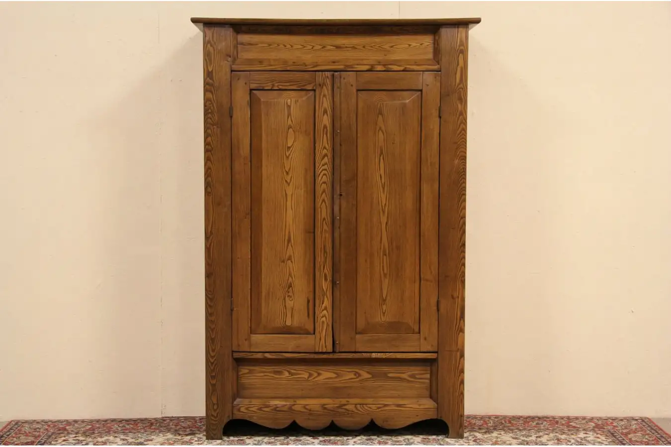 This country armoire, wardrobe or linen cabinet was hand crafted about 1860 of solid oak and ash planks over 1" thick. Cut square nailheads are visible on this American made furniture.