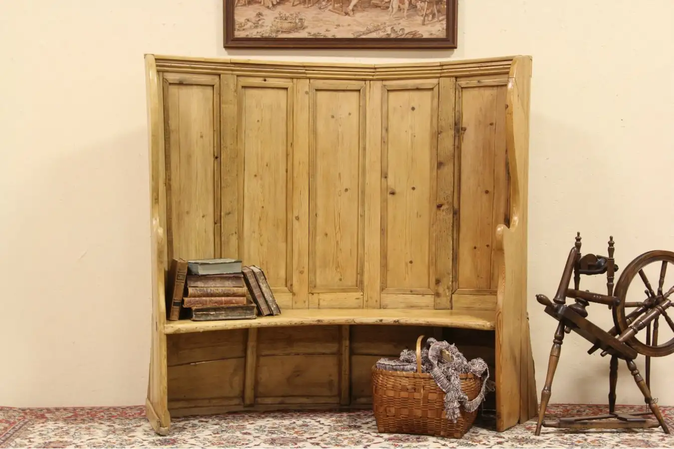 Wonderful country pine furniture from around 1800, this curved bench has a tall back to concentrate heat and comfort from a fireplace.