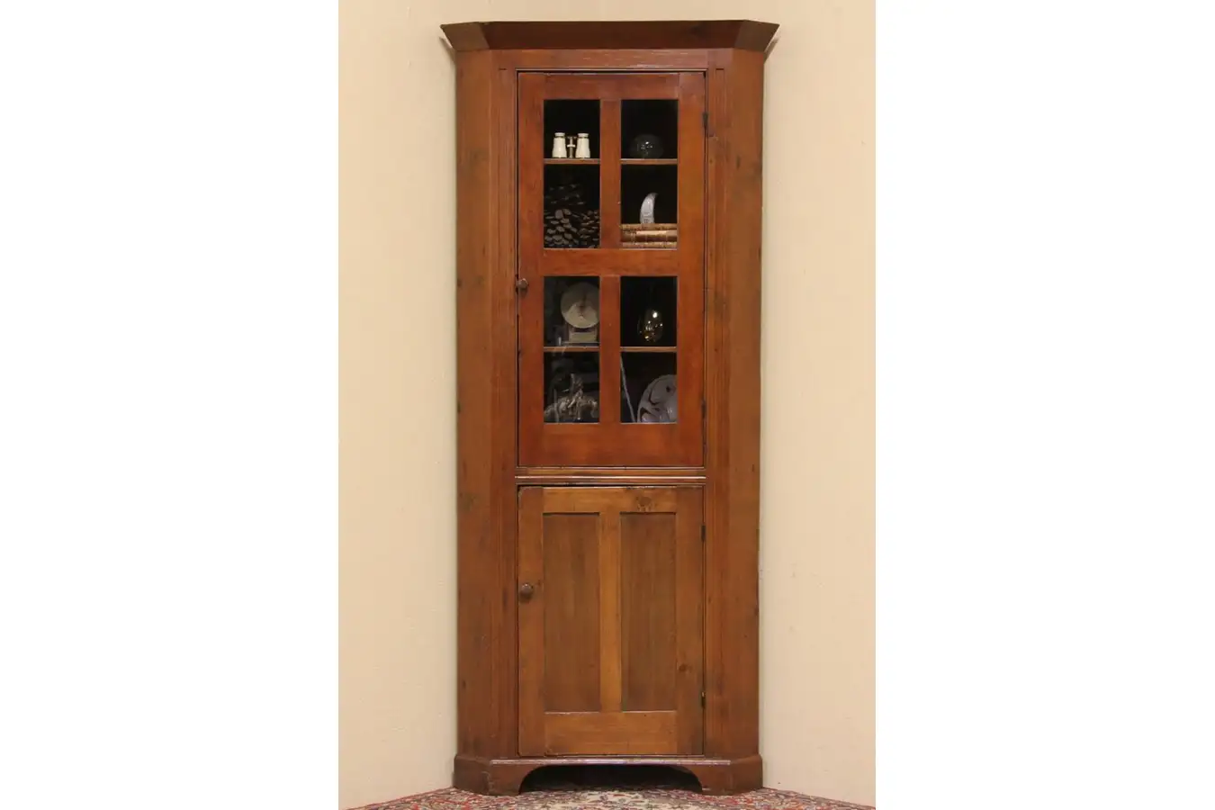 A tall country pine corner cabinet has a classic flat crown, it was hand crafted about 1840, and said to be from Pennsylvania.