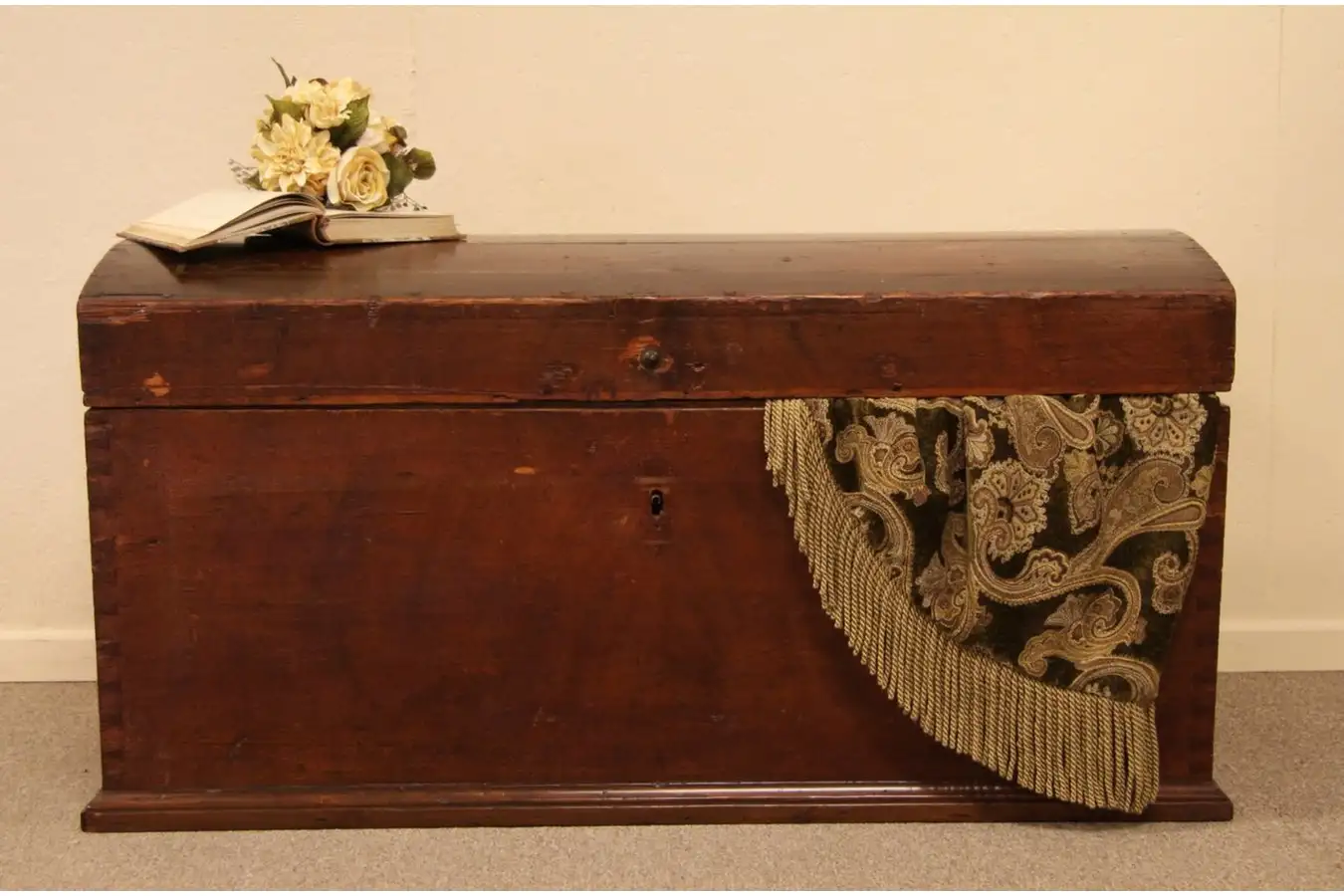 Entirely crafted by hand about 1840, a curved top pine trunk or "treasure" chest was probably brought to America from northern Europe by an immigrant.