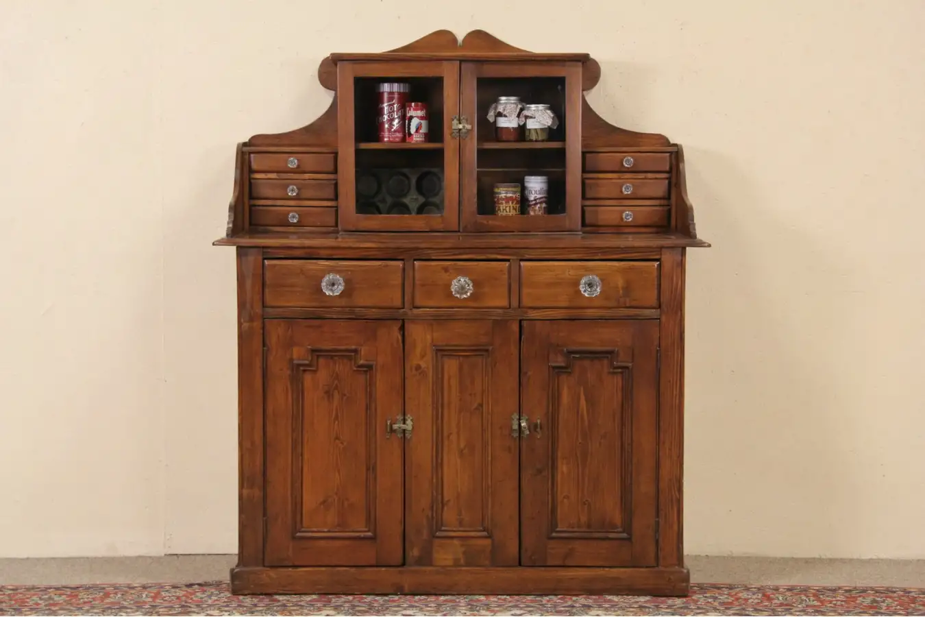 Every surface is hand planed, even the tiny drawers have hand cut dovetail joints and chamfered bottoms. Doors have old wavy glass. Cut square nails are visible. The center glass knob is of the era but a replacement, the others all are original with threaded glass screw threads.