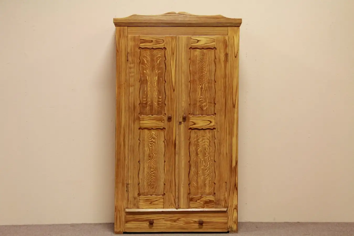 The inside is empty except for a few hand carved clothes hooks, and could be fitted as desired with shelves or a closet pole. Measurements of this picturesque armoire are 44" wide, 19" deep and 75" tall.