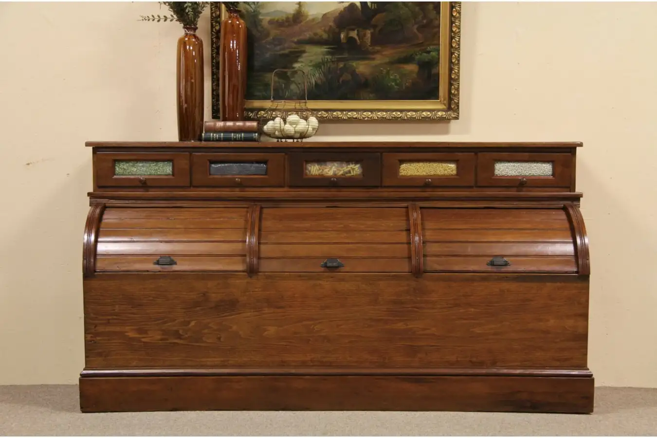 This wonderful grain bin was originally used to store grains and feed in a Wisconsin general store, this triple roll top grain bin has three sections. This spectacular piece would be perfect in a kitchen or pantry for extra storage space. It would also work well in a back hall or mud room for coat and shoe storage, or children's toys.