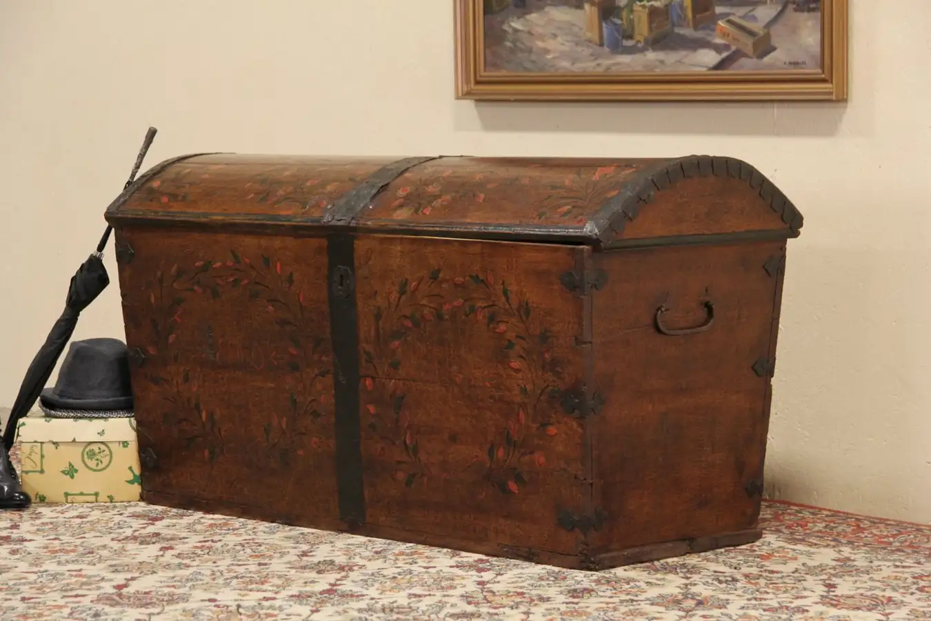 Hand crafted in northern Europe in the 1840's, this picturesque immigrant trunk or chest is wormy pine with hand painted floral motifs resembling traditional Scandinavian rosemaling.