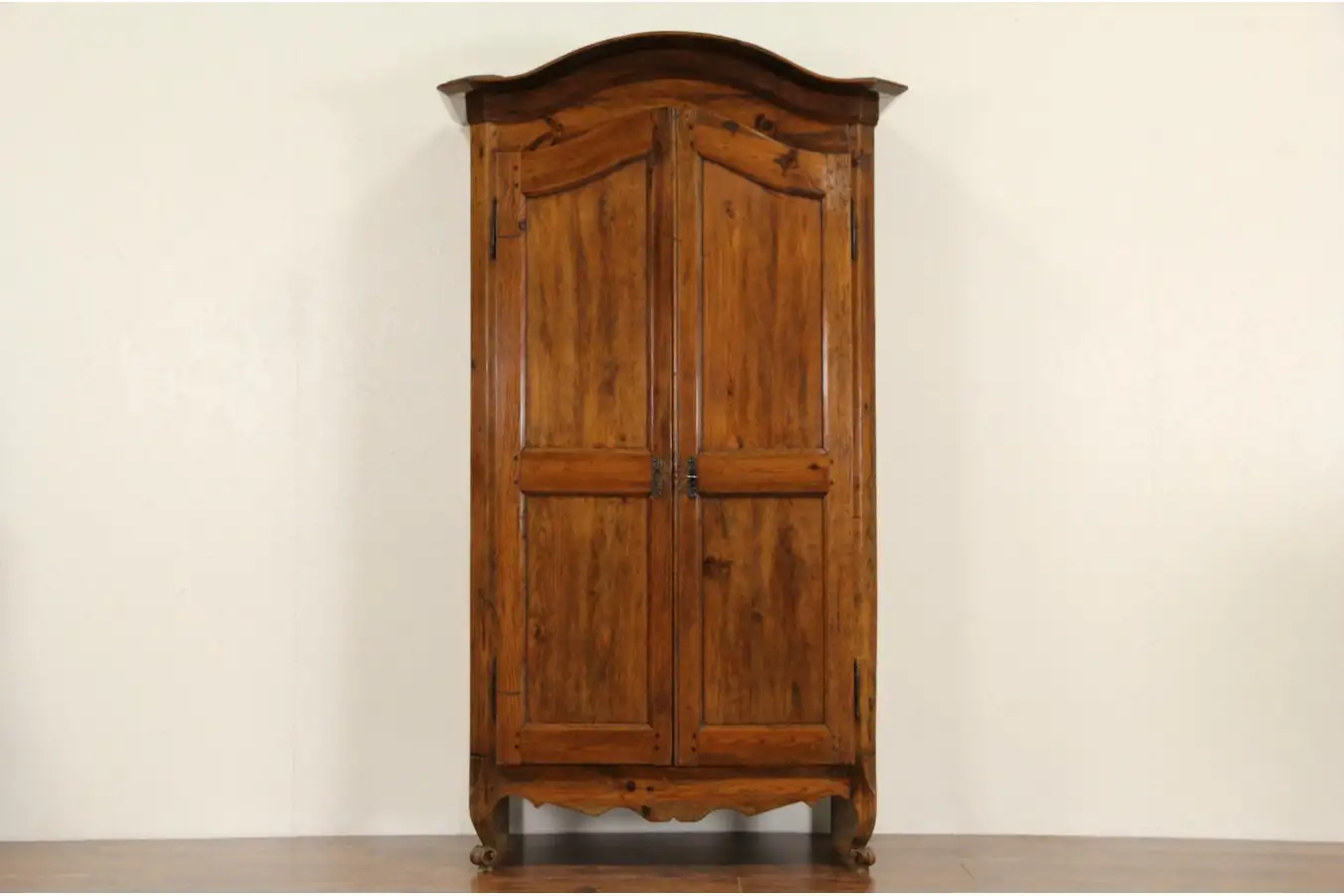 A wonderful country pine French Provincial armoire was entirely hand hewn about 1800. Every surface shows tool marks of a master rural carpenter. Joints have carved wooden pegs and hand cut nailheads are visible on this historic furniture from France. The old finish is in very fine condition with exceptionally warm antique patina. Waxed and buffed, all that is needed to maintain the soft luster is an occasional wipe with a soft dry cloth. Shelves are removable, the giant iron lock still works and lift off iron hinges are original. The crown is removable for easier transport. Measurements are 47 1/2" wide at the crown, 42" wide in the body, 23" deep and 7' 1" tall, the interior is over 17" deep. See 25 photos on Harp Gallery website that enlarge to full screen size.