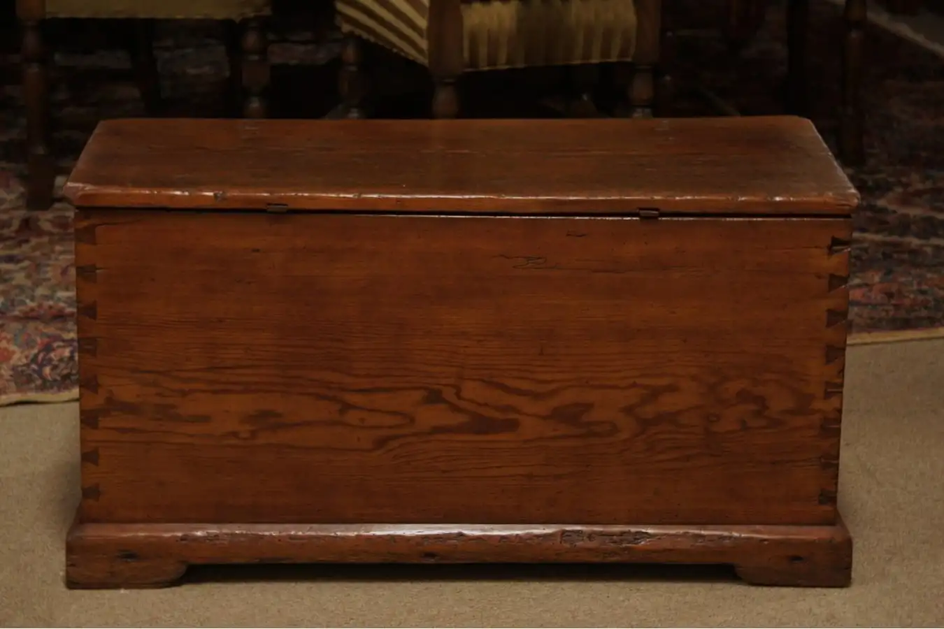 Hinges are hand-wrought iron, and inside is a little compartment for keepsakes. On the underside of the top, the skilled country carpenter has dovetailed two cross pieces into the top to prevent splitting or warping.