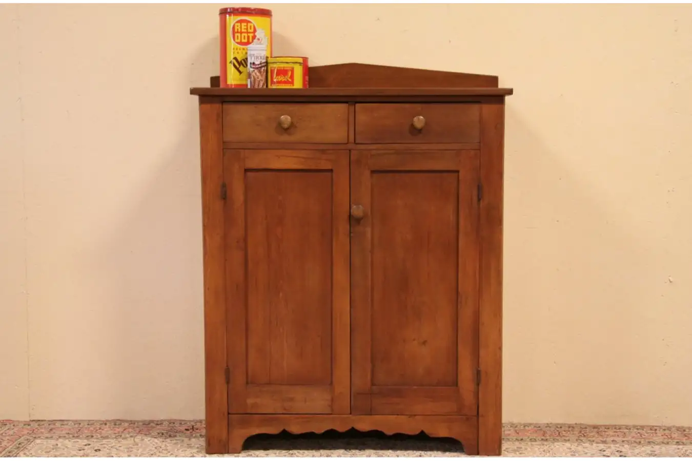This very rugged country furniture was designed to hold the entire jam and jelly supply from the fall harvest for the rest of the year. There was always a lock to reduce "shrinkage" from hungry children on these nostalgic cabinets, the lock was behind the knob and is missing, perhaps jimmied by a hungry teenager. Drawers have hand cut dovetails, the sign of an expert country cabinetmaker.