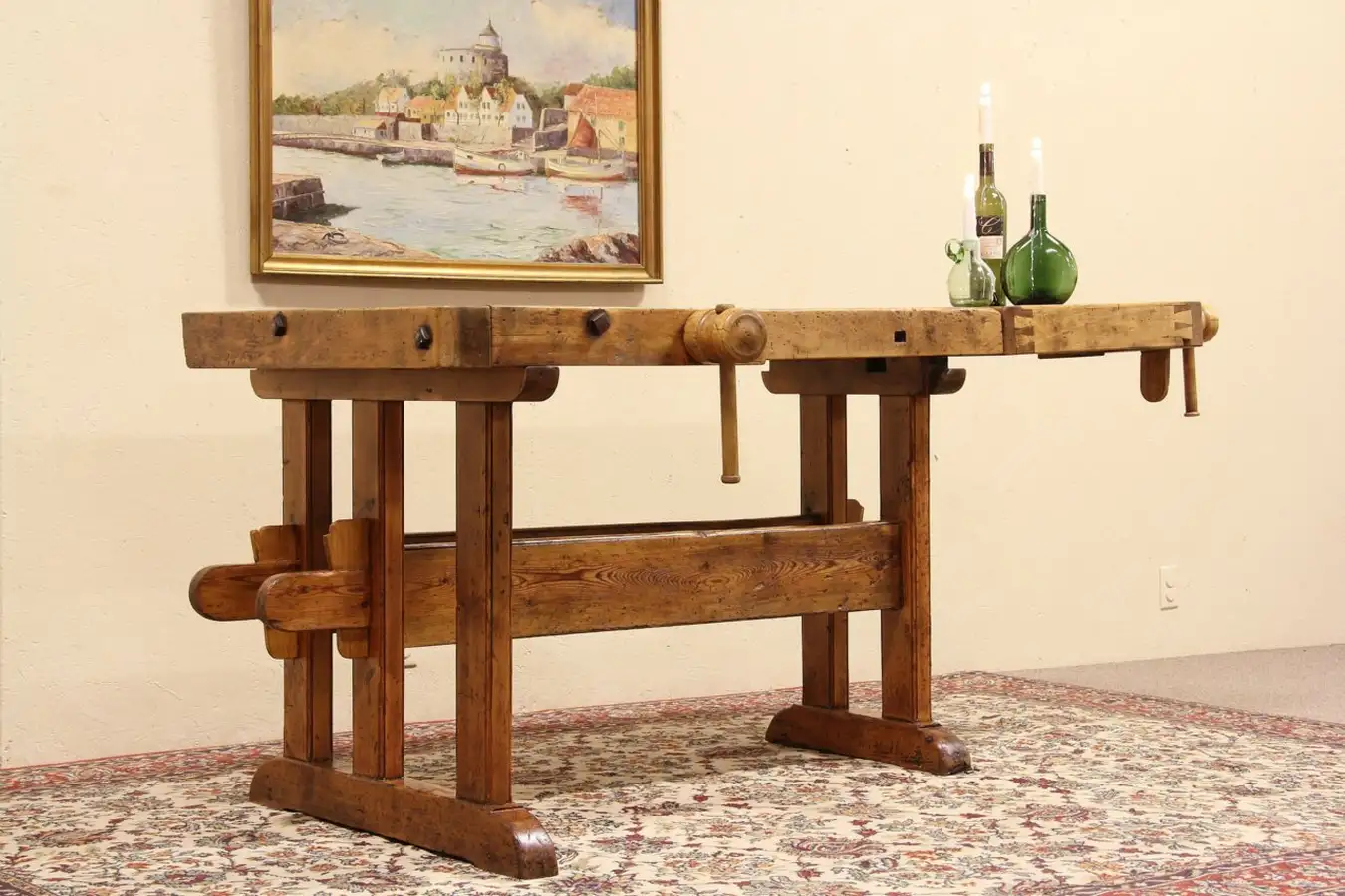 Solid hard maple and oak, there are 2 working vises or clamps with huge wooden screws. A recessed tray originally held tools on this American country furniture from about 1900. Hand cut dovetails and mortise and tenon joints secure the frame together.