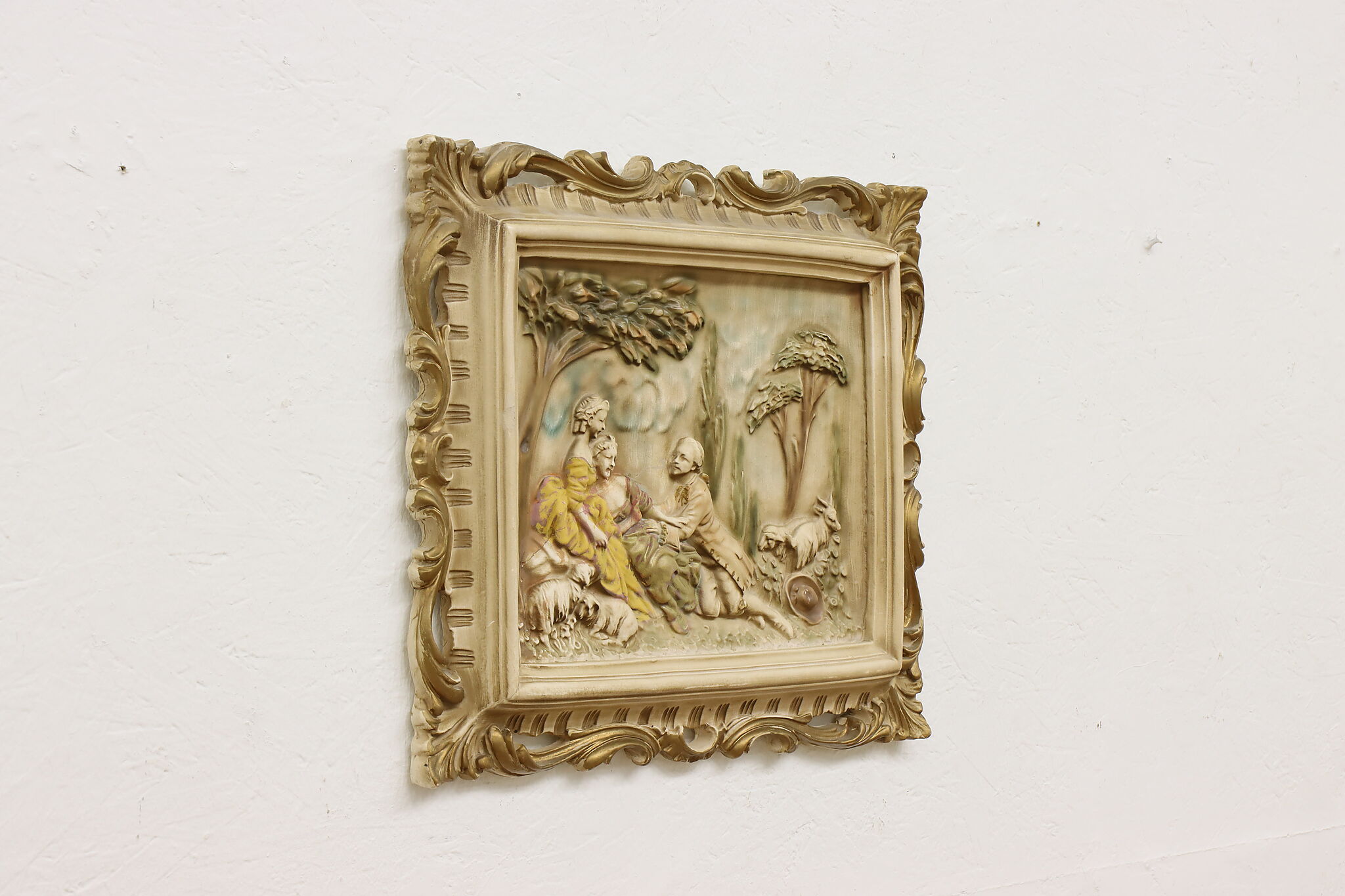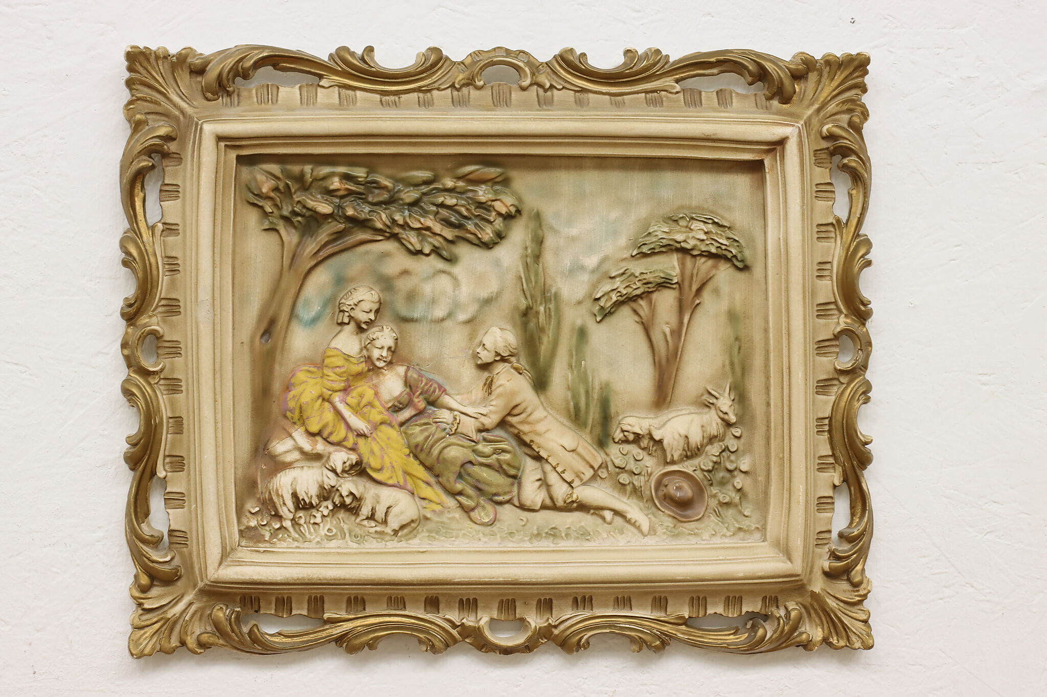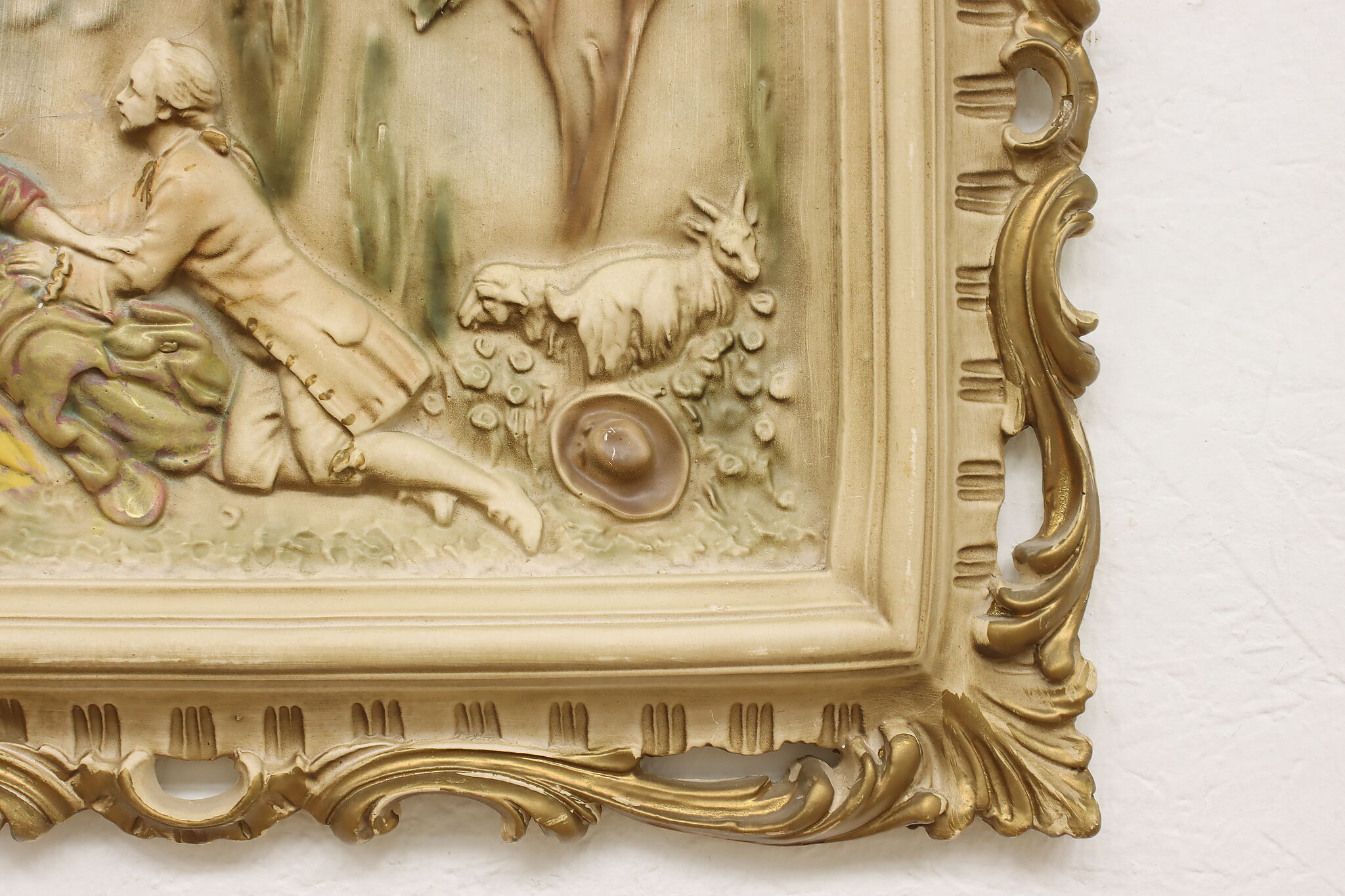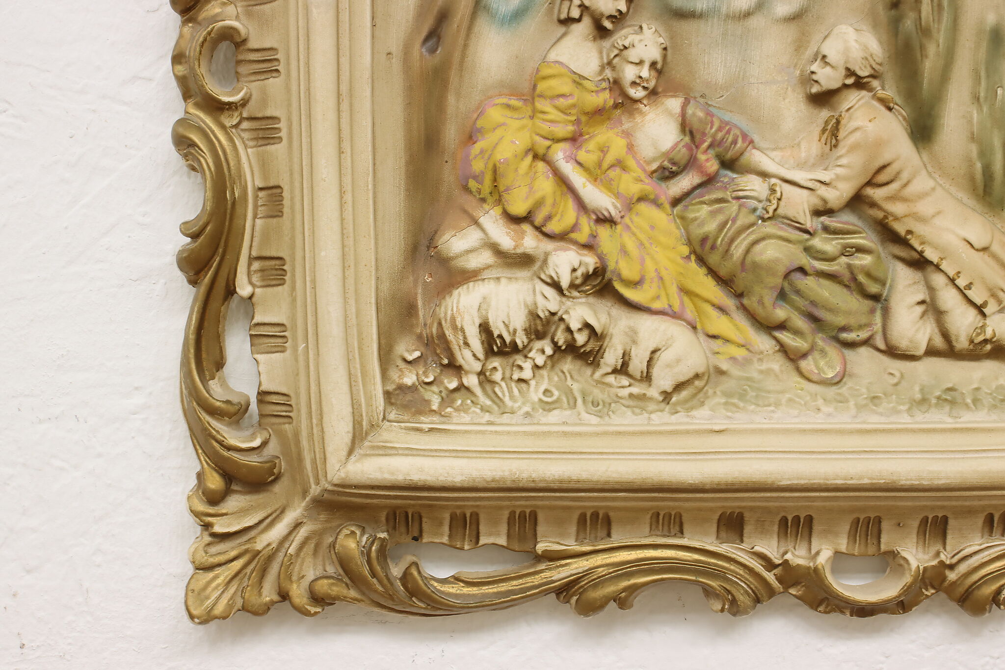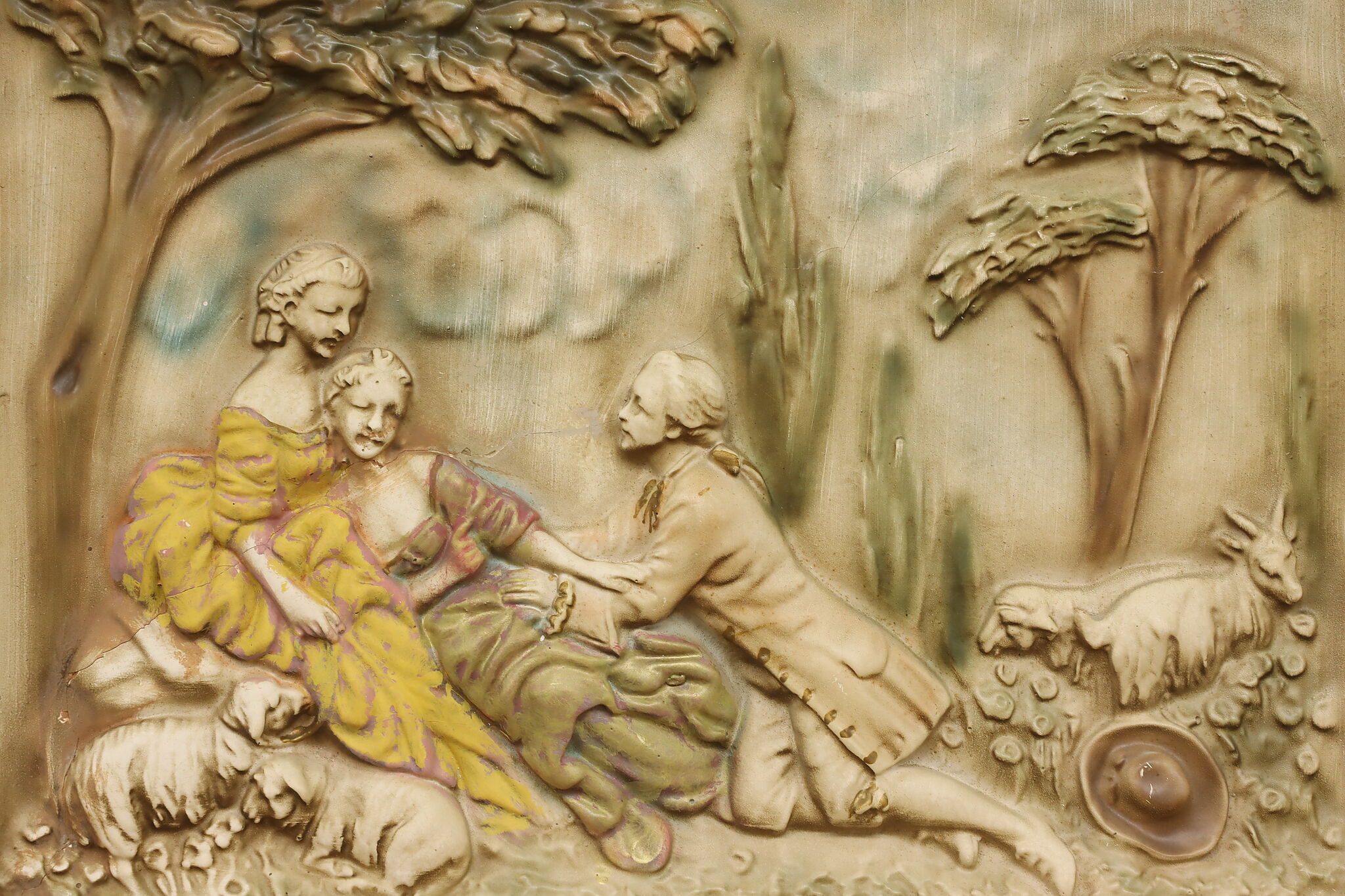 This wall plaque has a fantastic pastoral scene with a man courting a pair of ladies.
