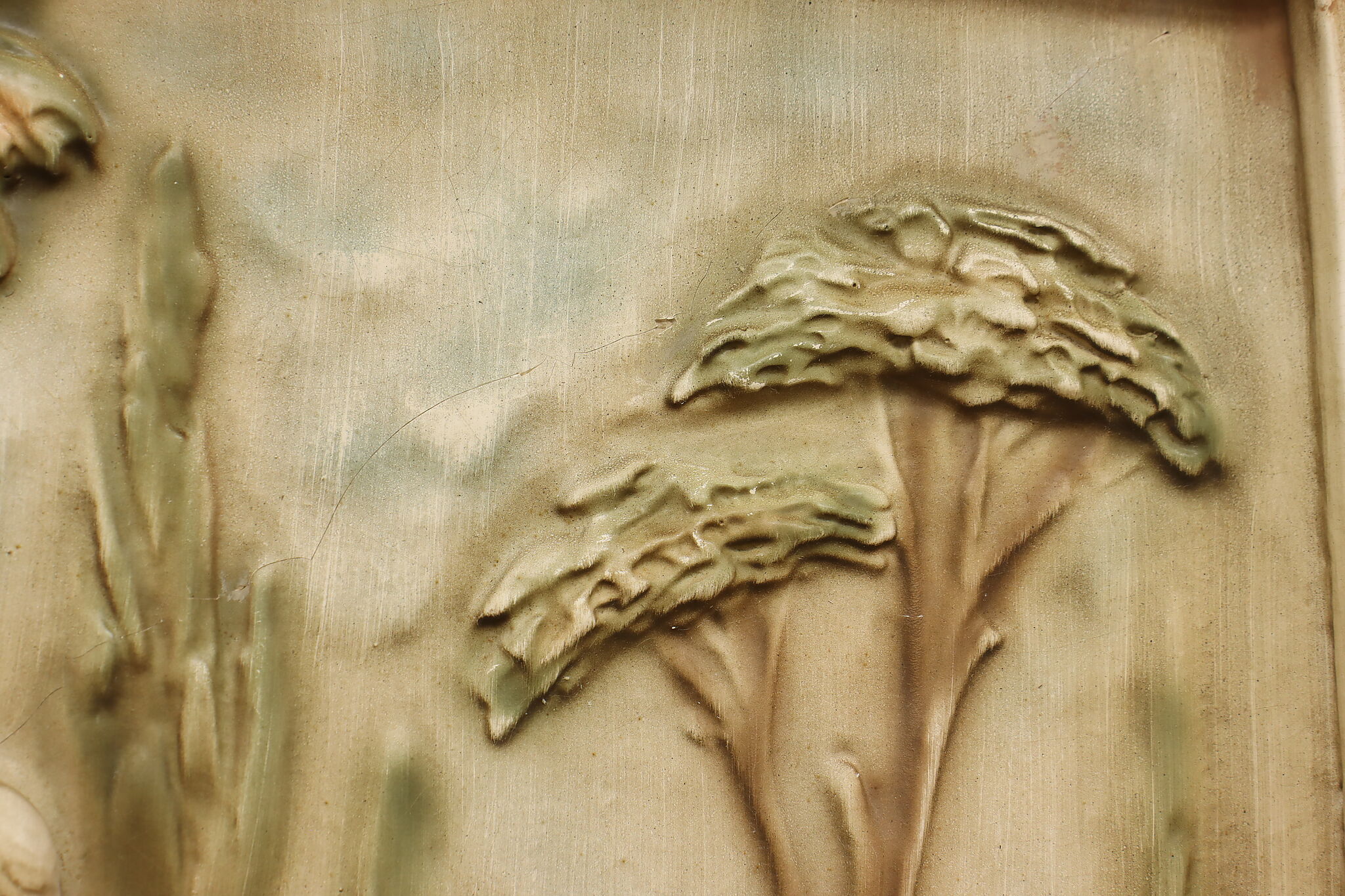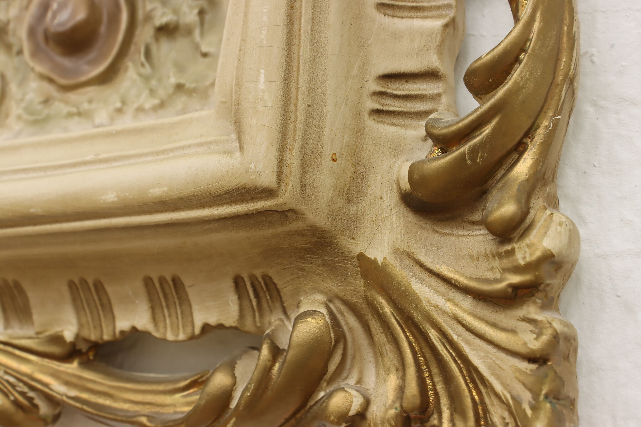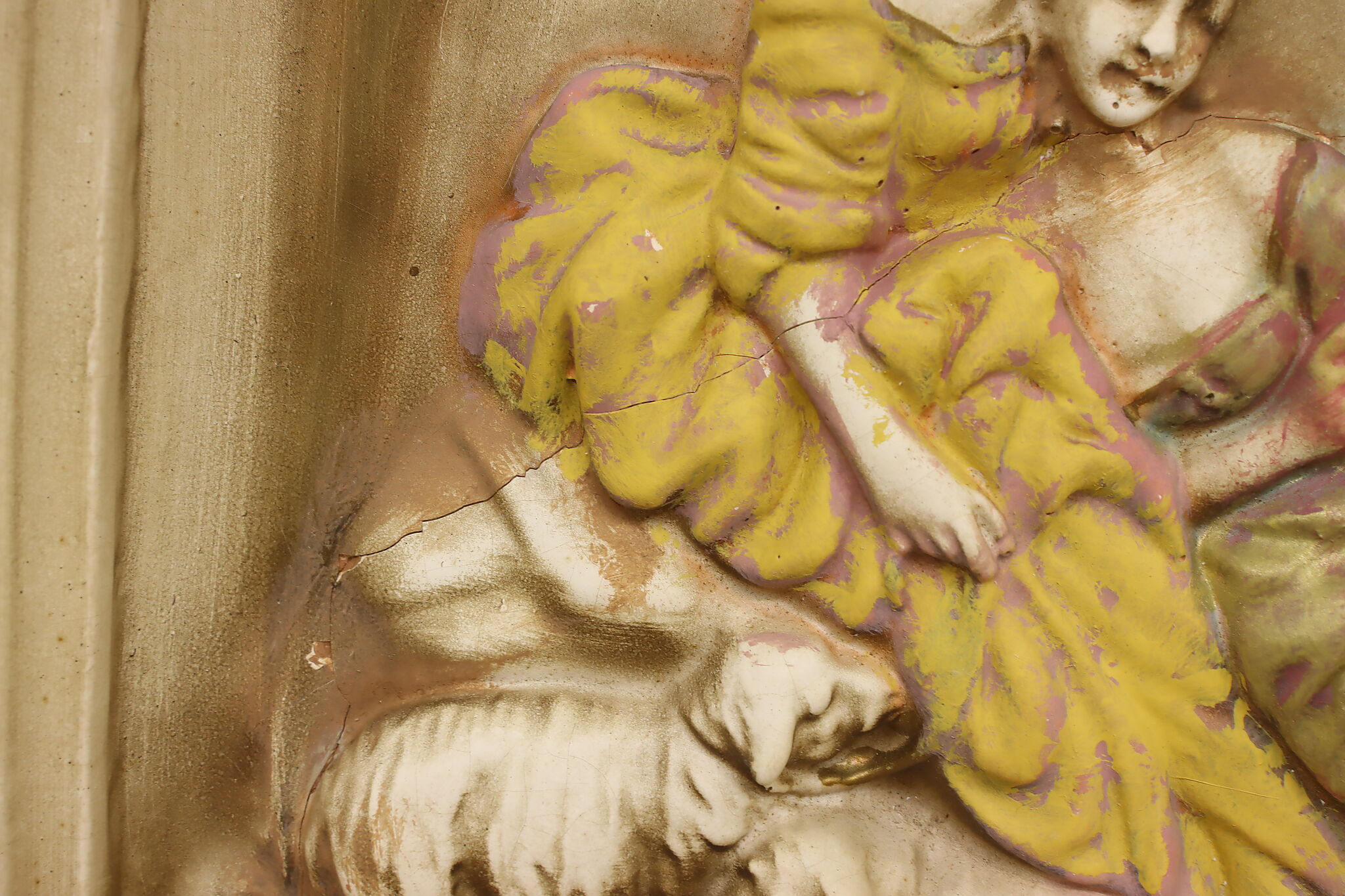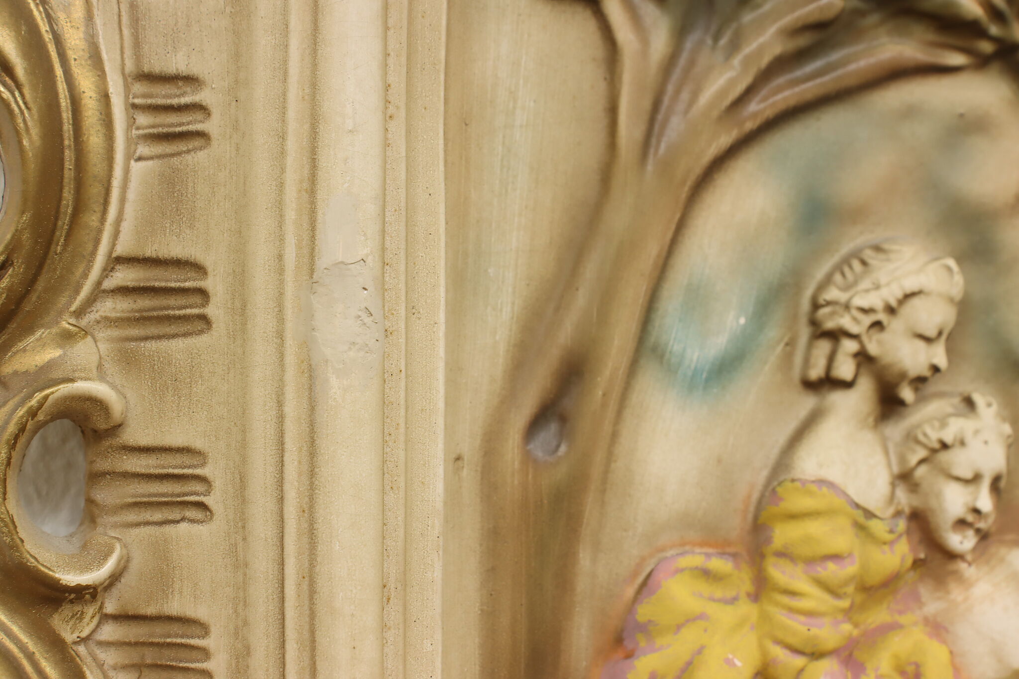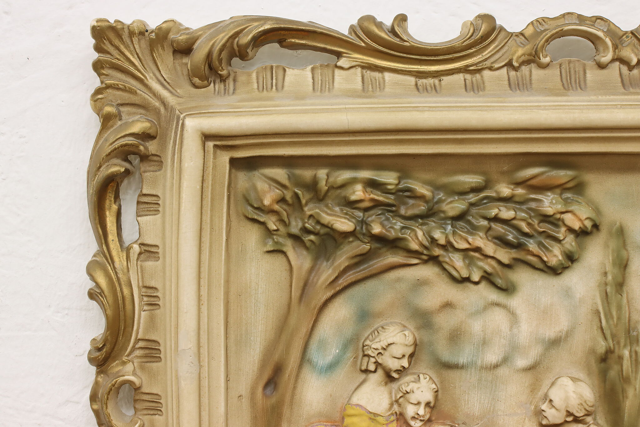 This wall plaque has a fantastic pastoral scene with a man courting a pair of ladies.
