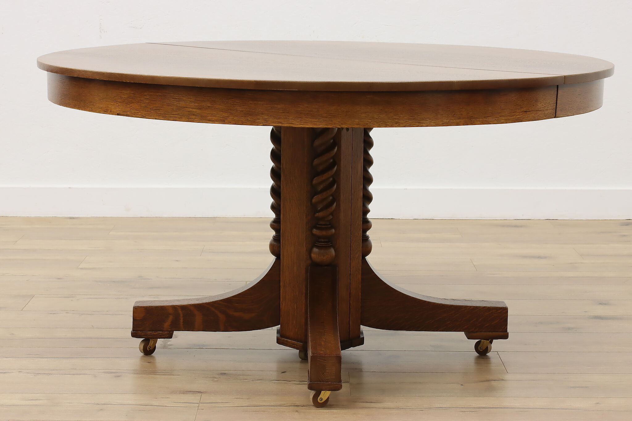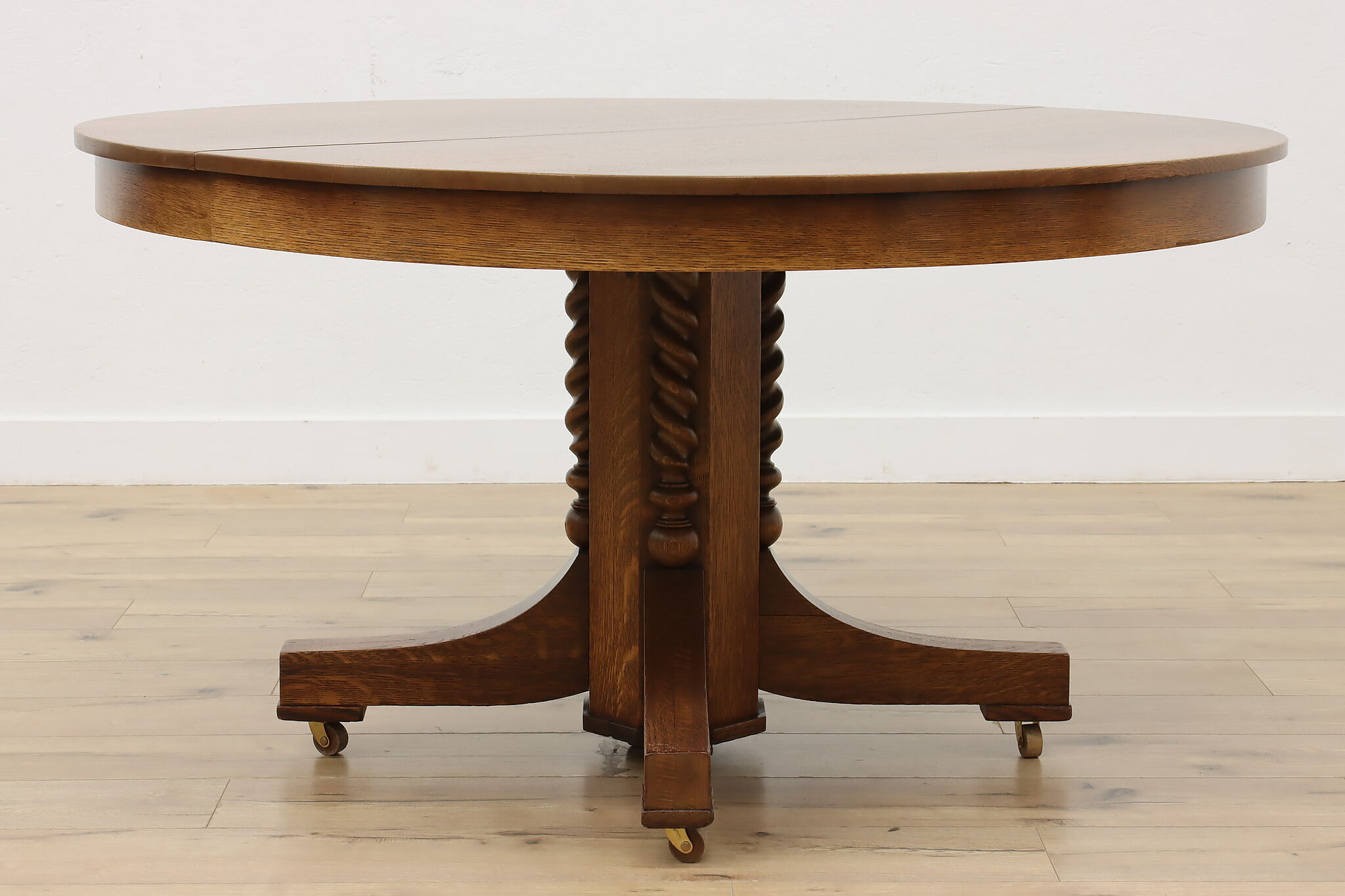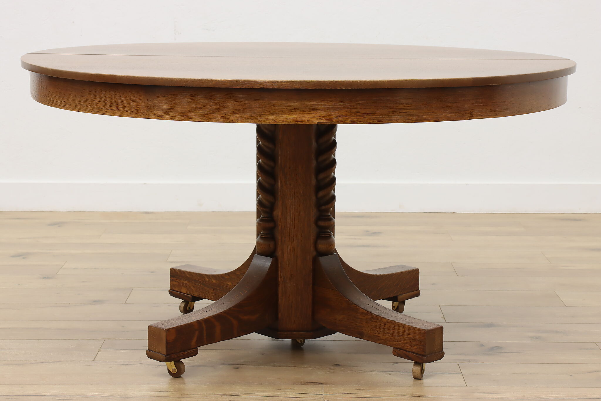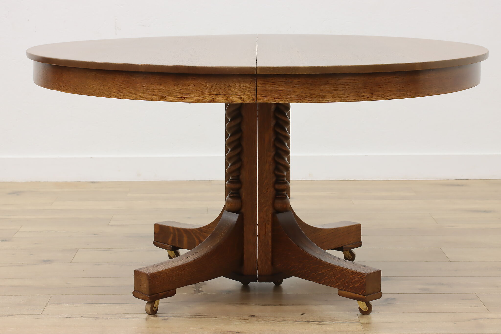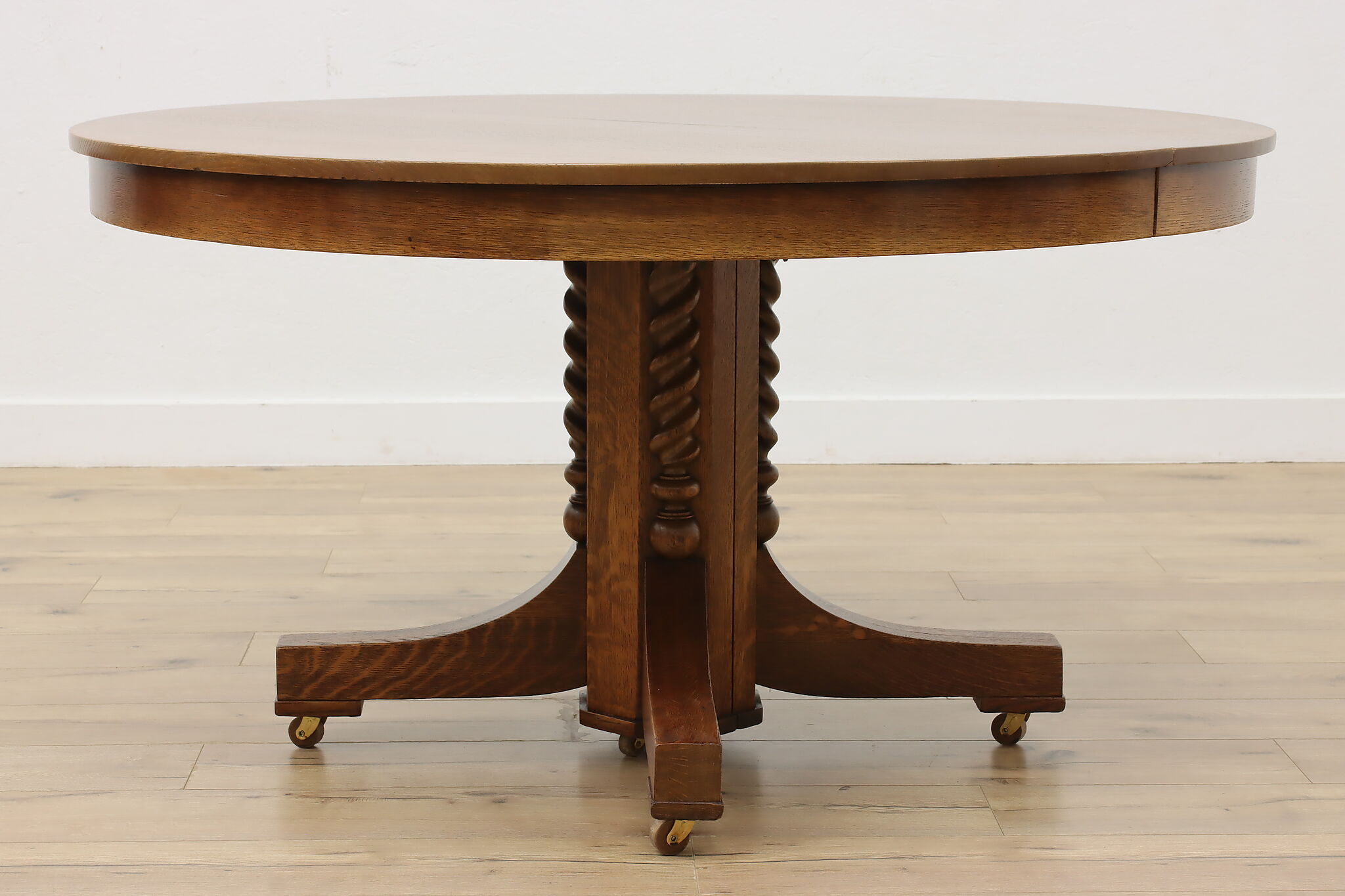 This round oak dining table has carved twist columns on the pedestal, an uncommon feature for the simple designs of the Arts & Crafts period.