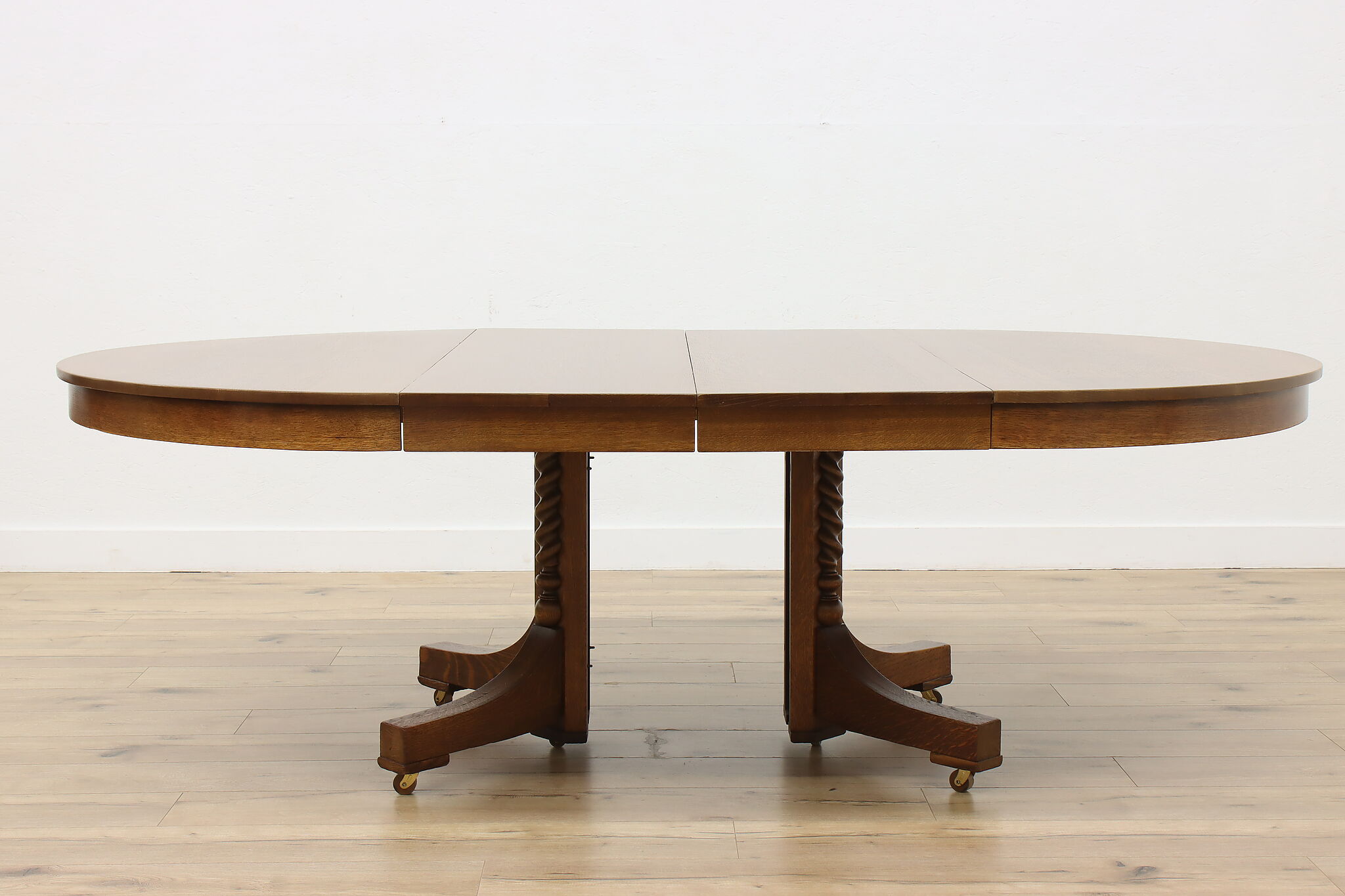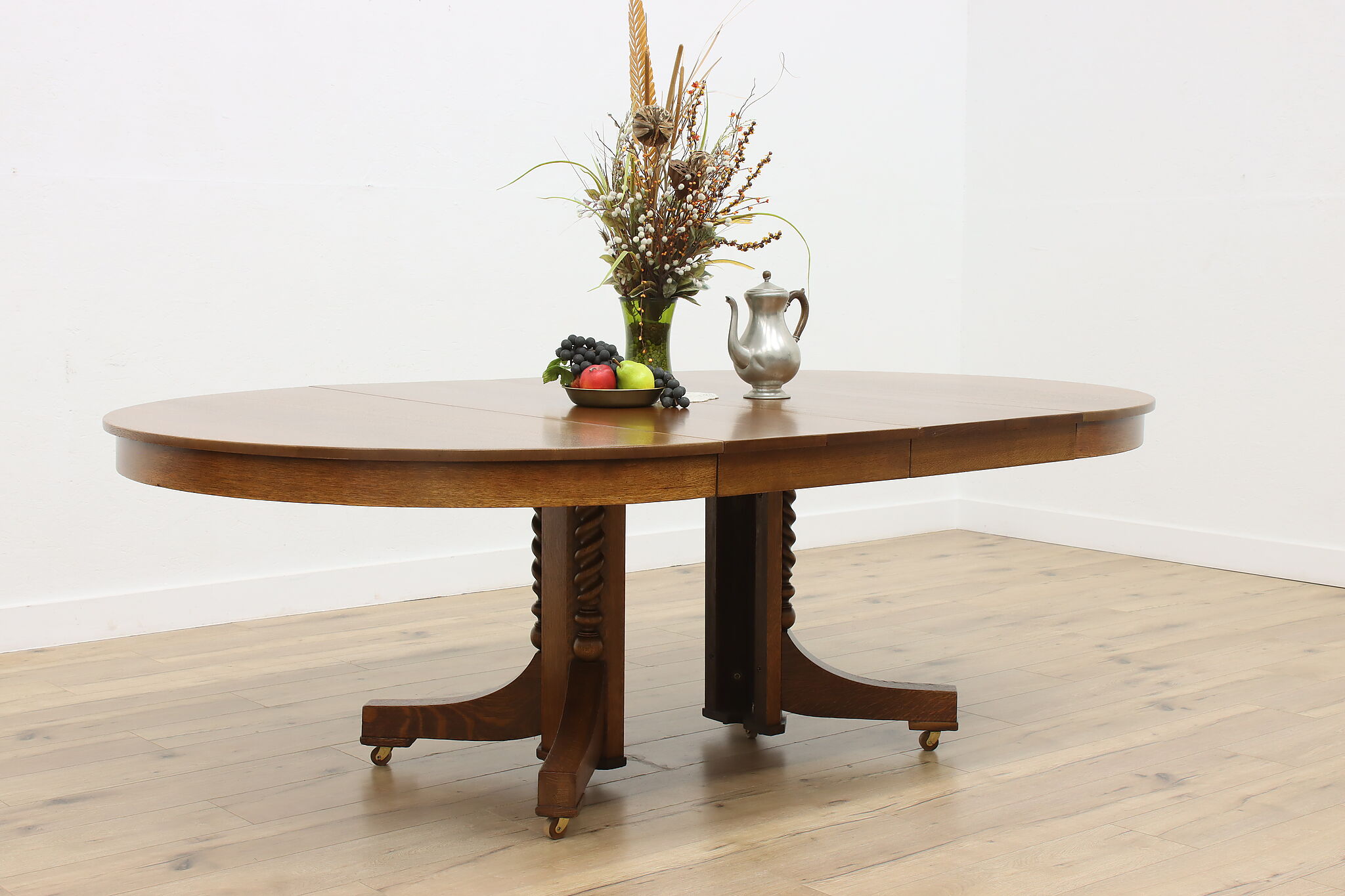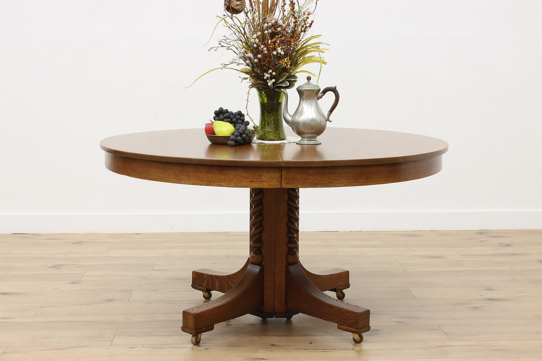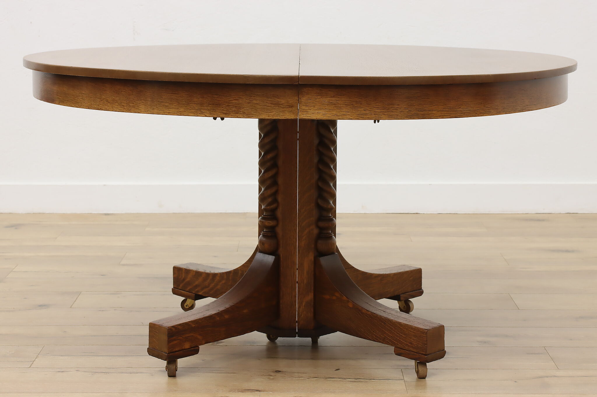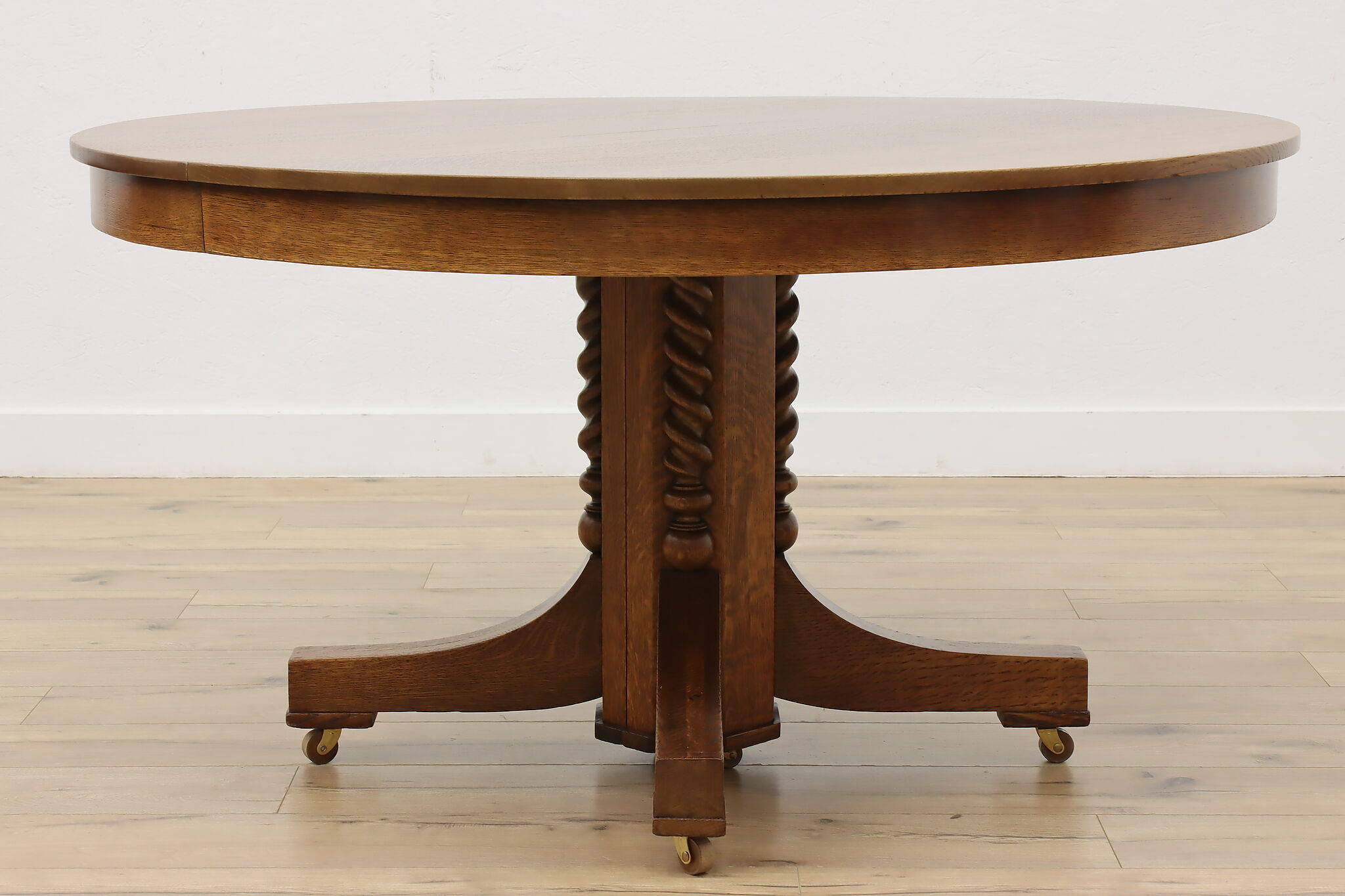 This round oak dining table has carved twist columns on the pedestal, an uncommon feature for the simple designs of the Arts & Crafts period.
