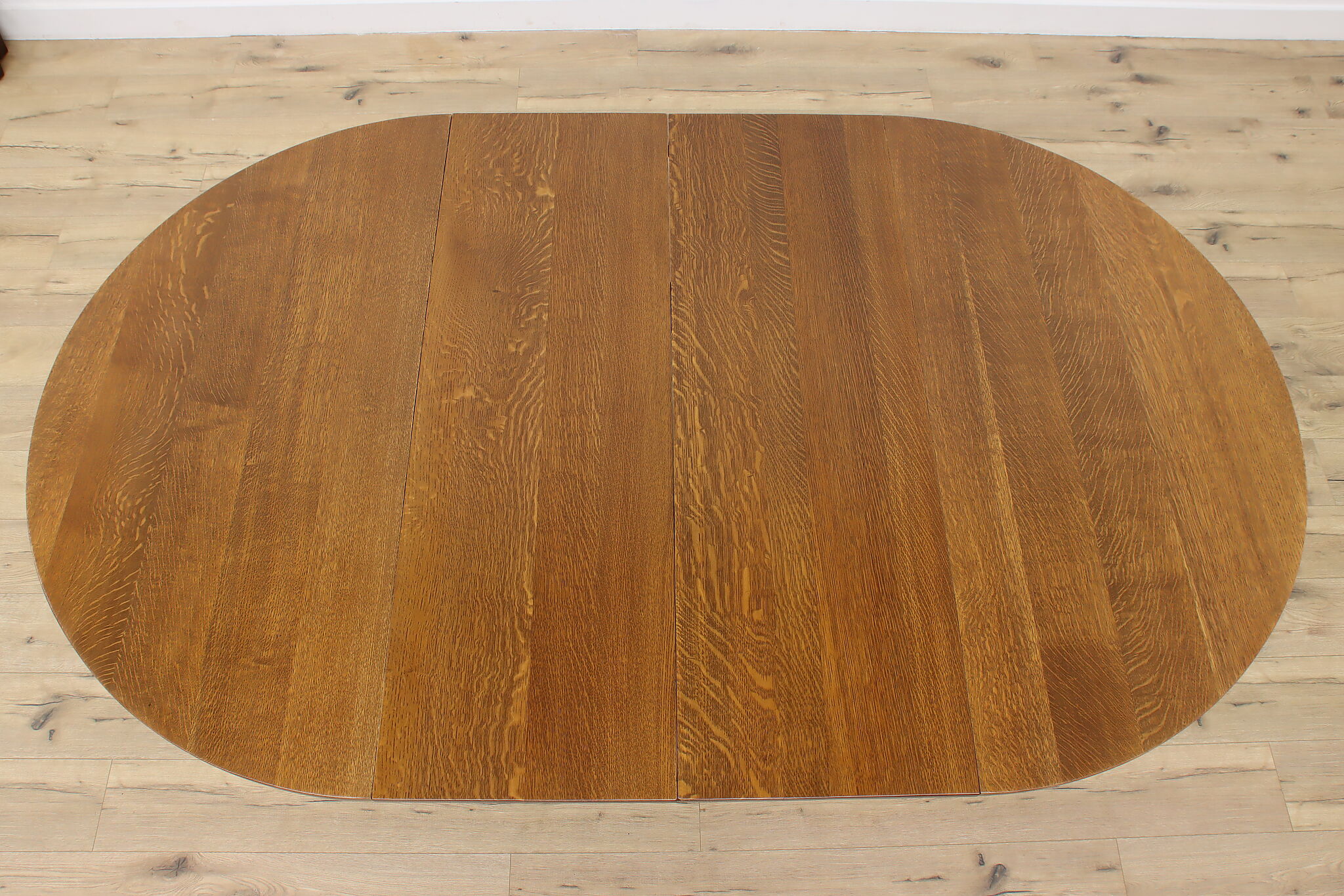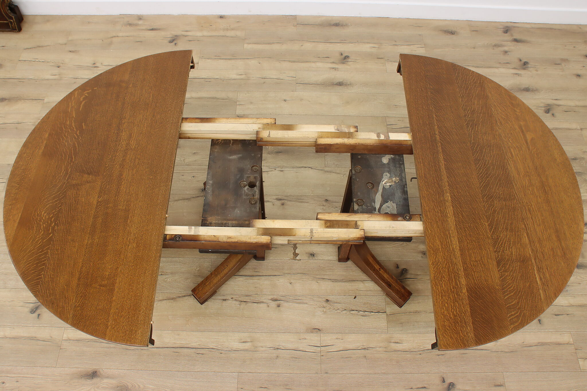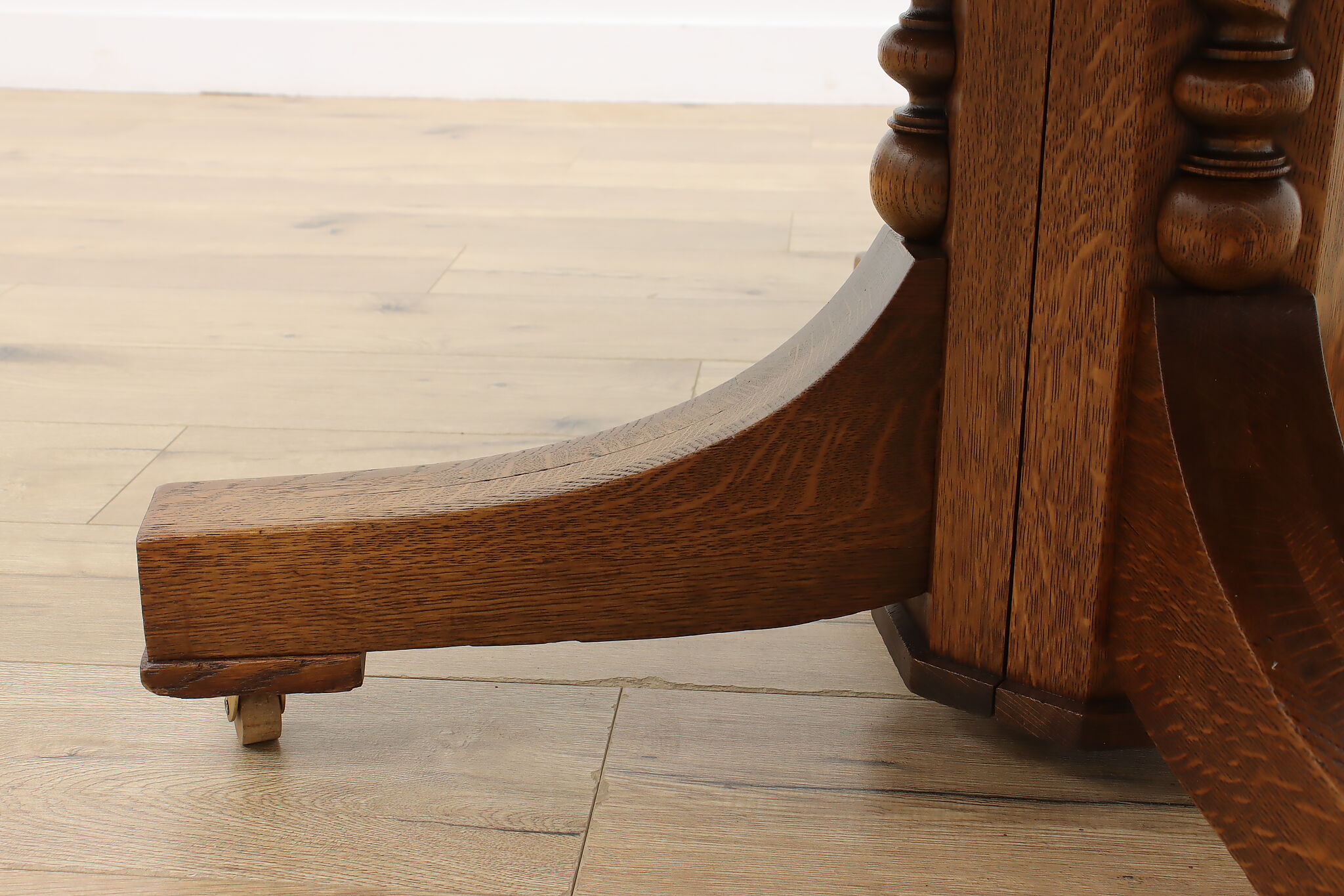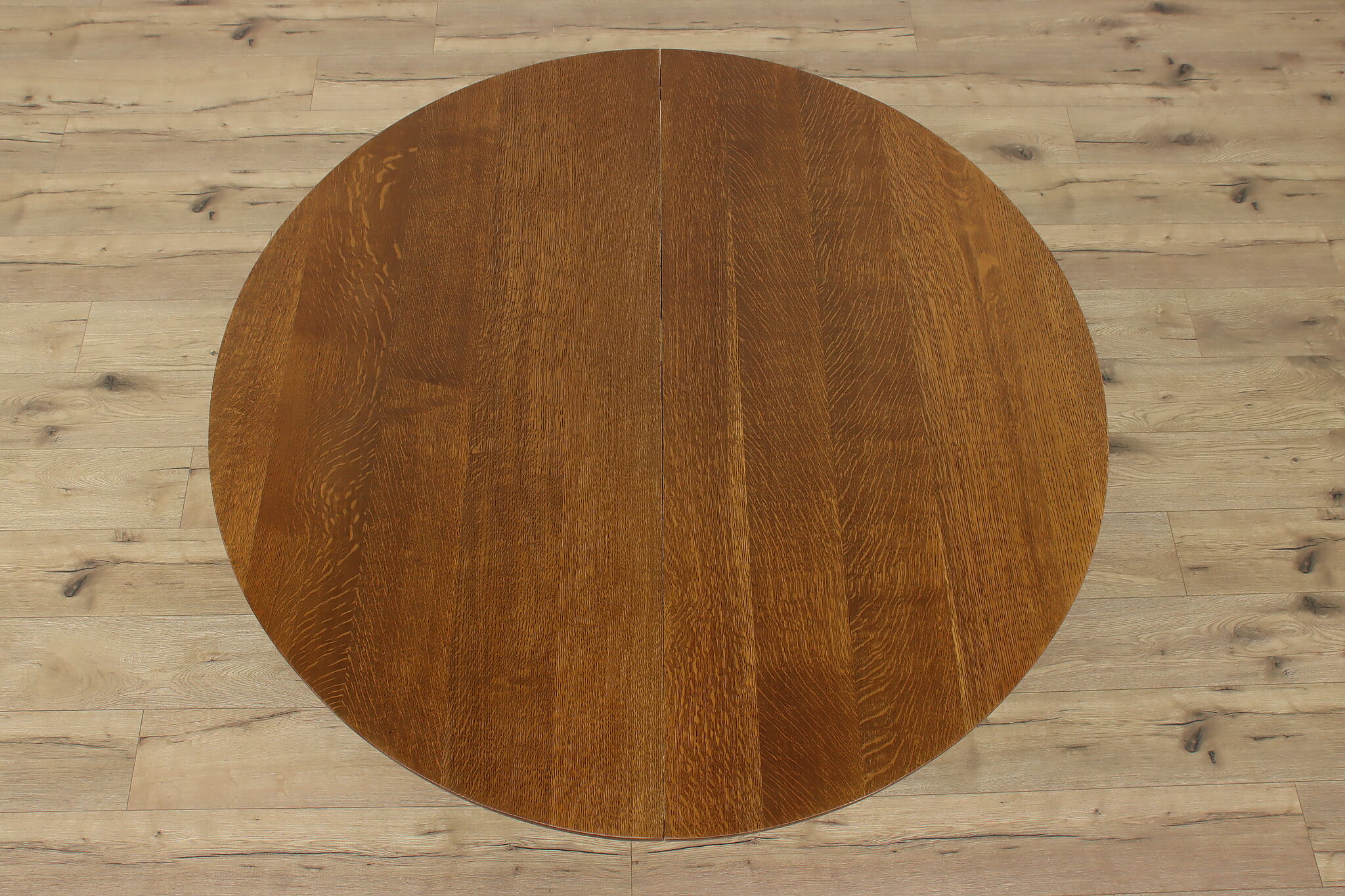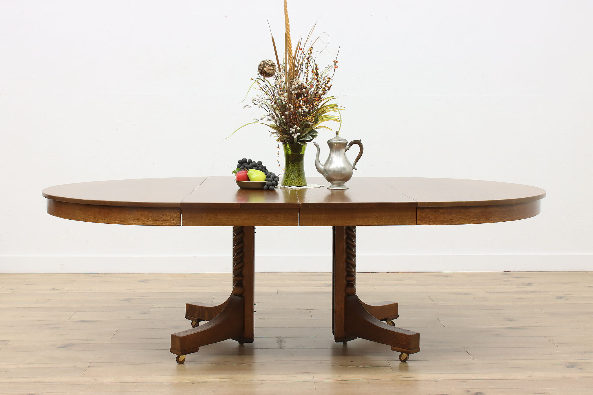 This round oak dining table has carved twist columns on the pedestal, an uncommon feature for the simple designs of the Arts & Crafts period.
