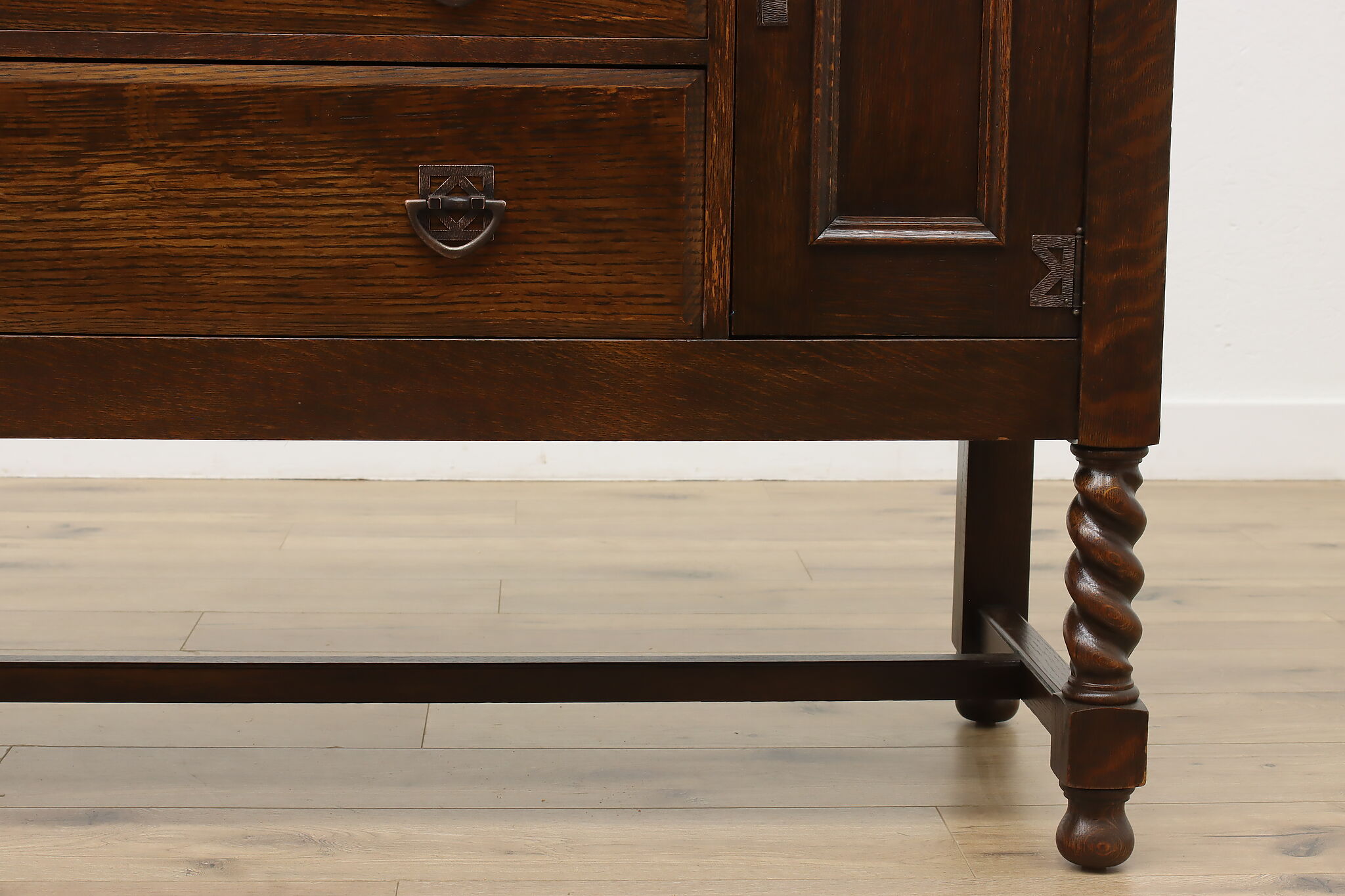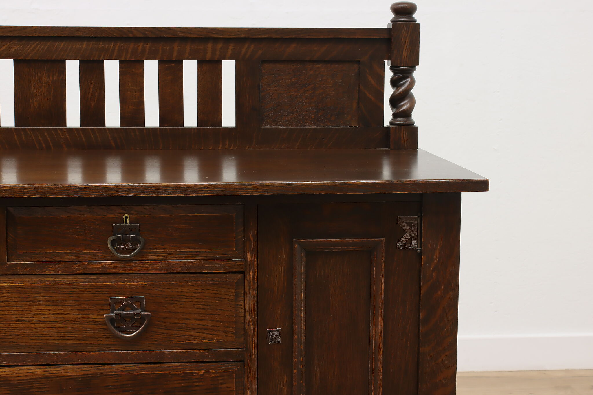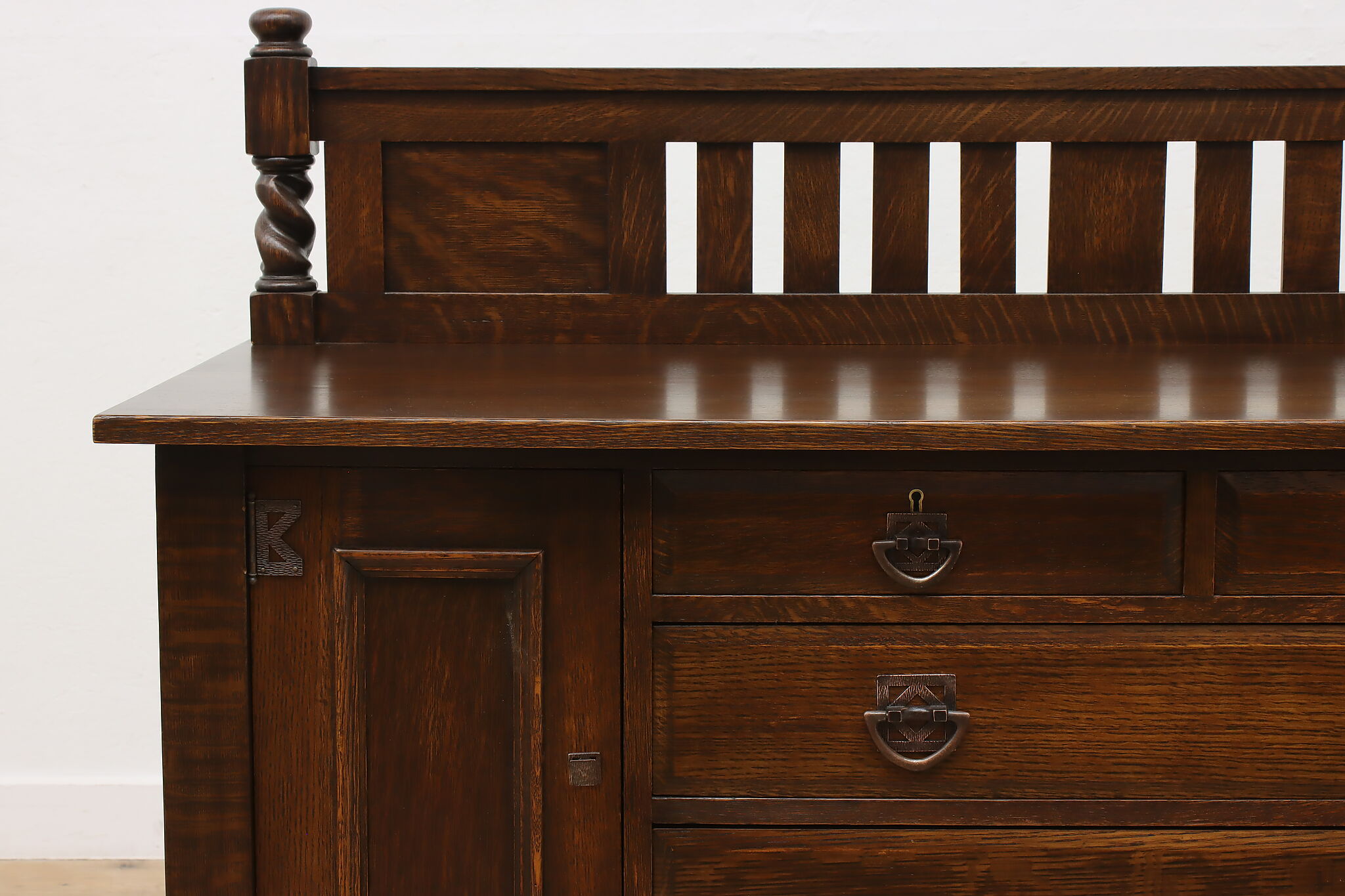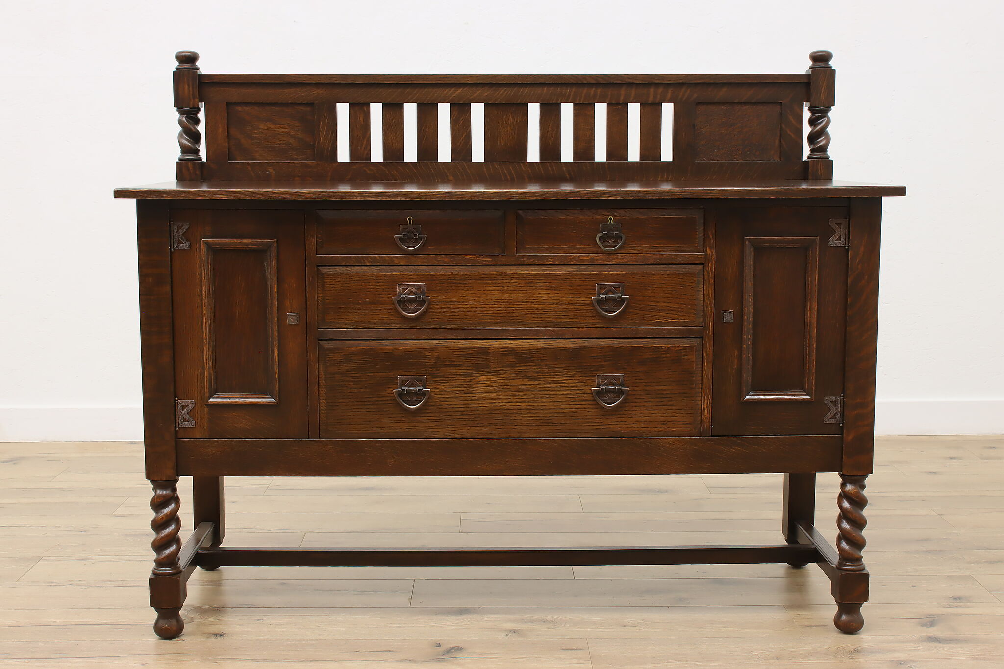 During the Arts & Crafts Mission period, there was an English Tudor revival that created pieces with both style designs. This sideboard, buffet or bar is an excellent example of the era with its twist columns and Craftsman hardware.