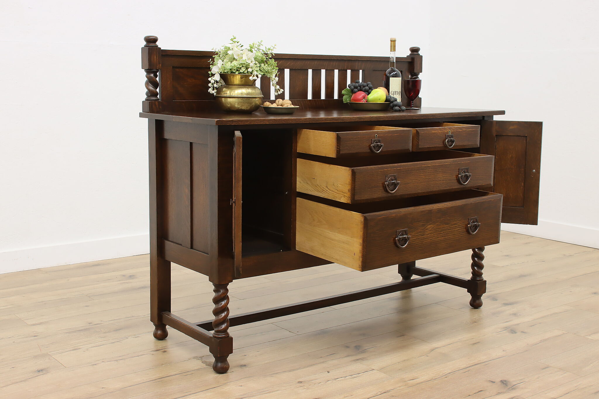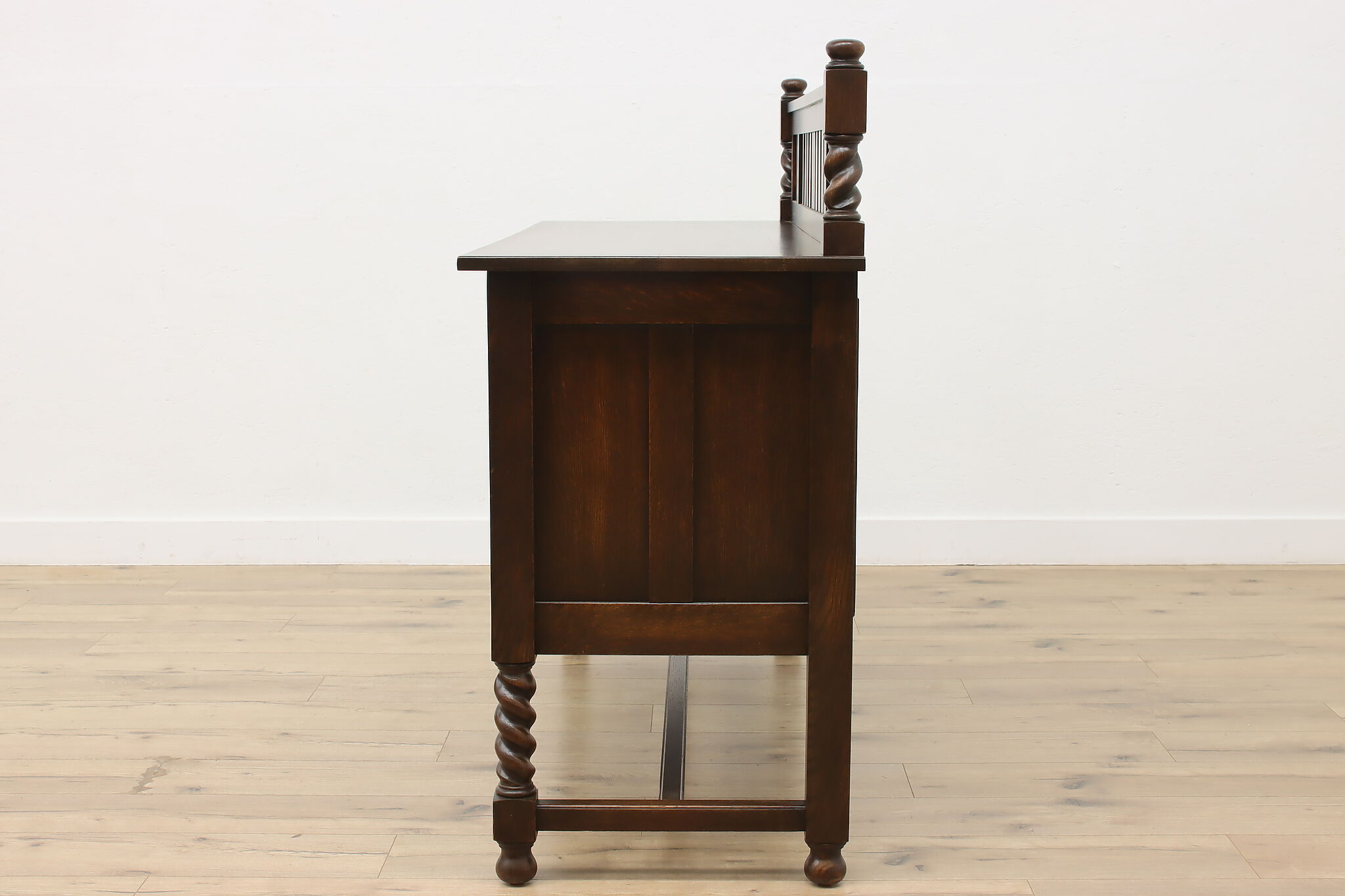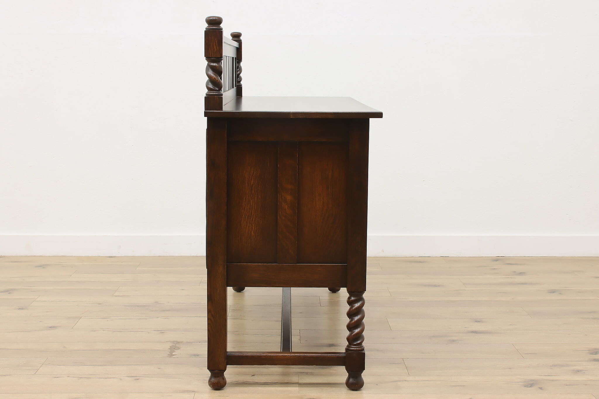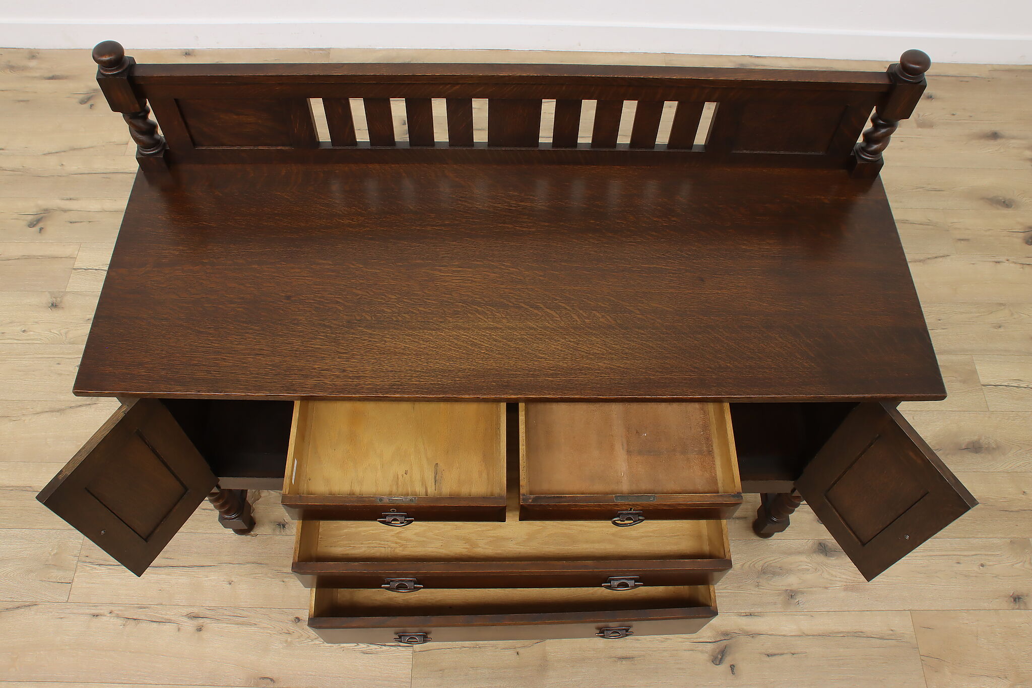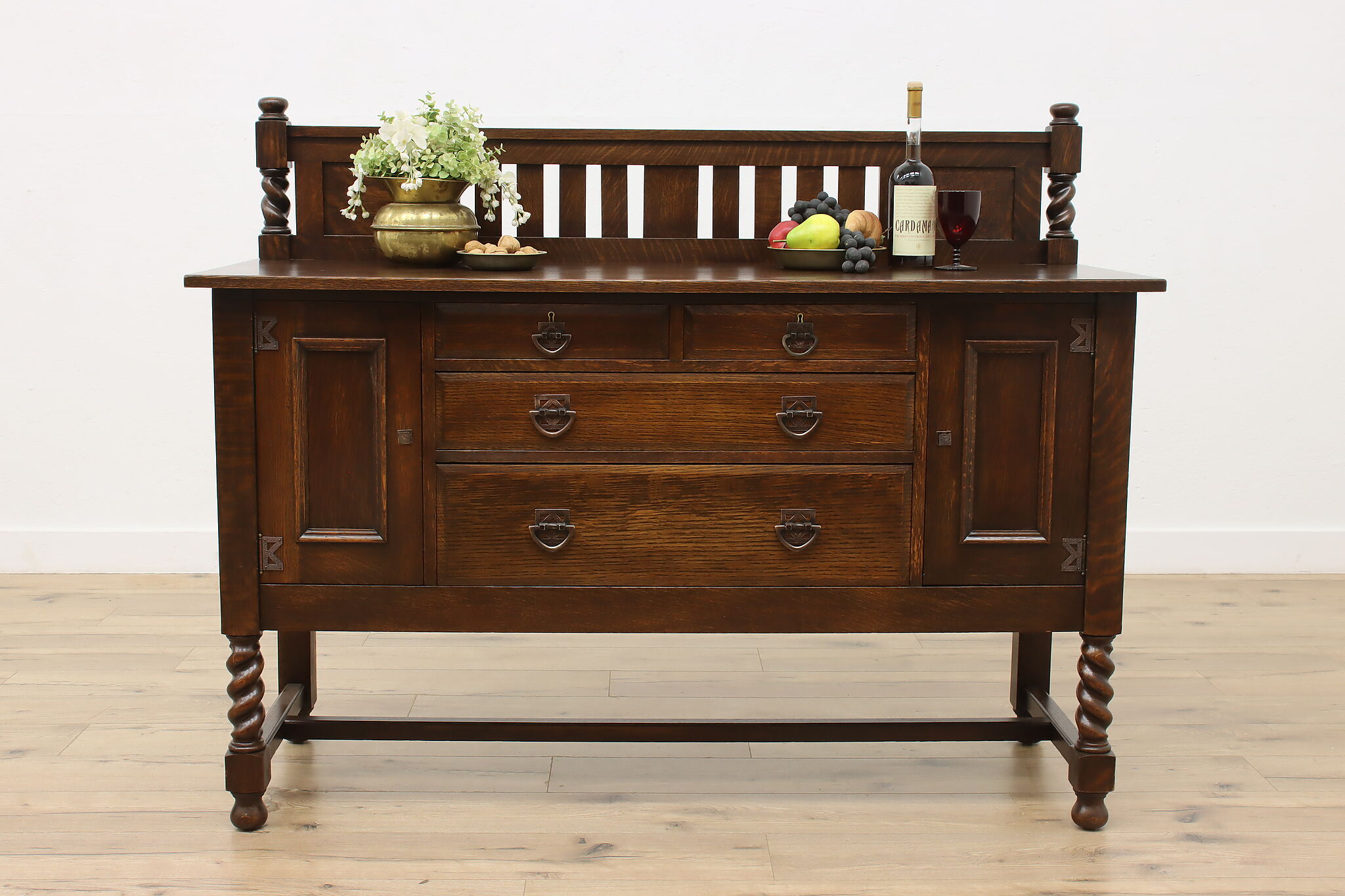During the Arts & Crafts Mission period, there was an English Tudor revival that created pieces with both style designs. This sideboard, buffet or bar is an excellent example of the era with its twist columns and Craftsman hardware.