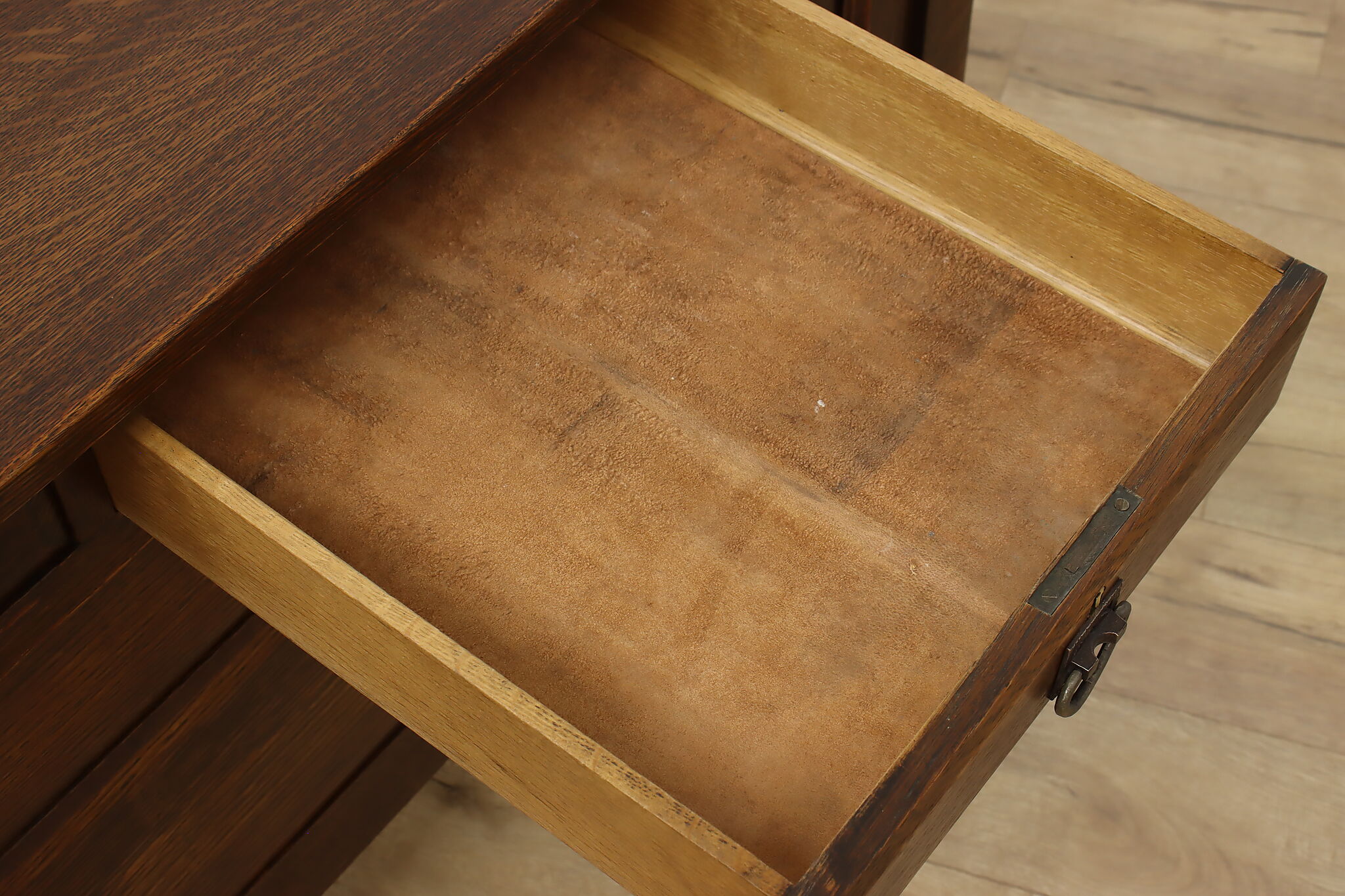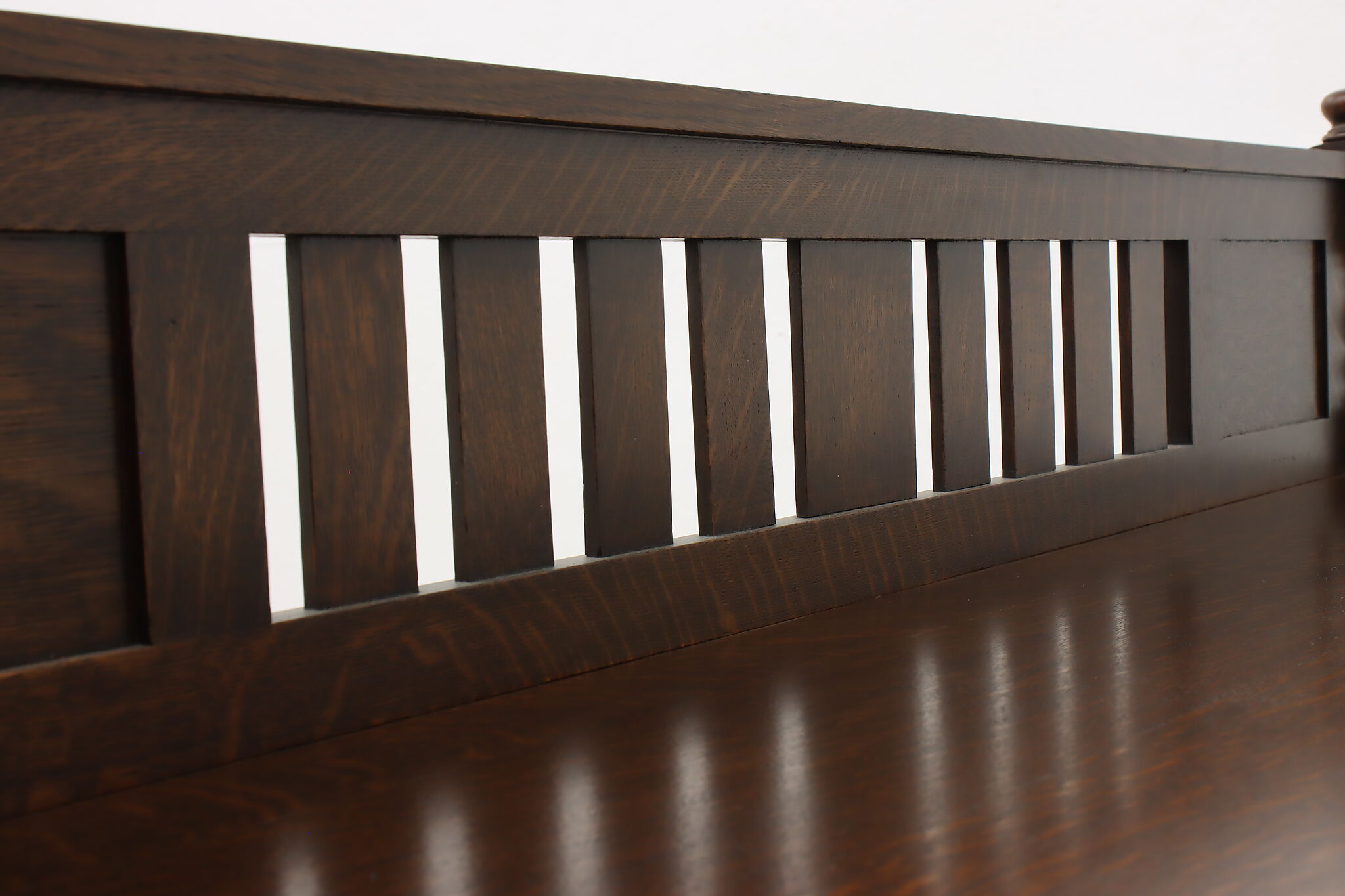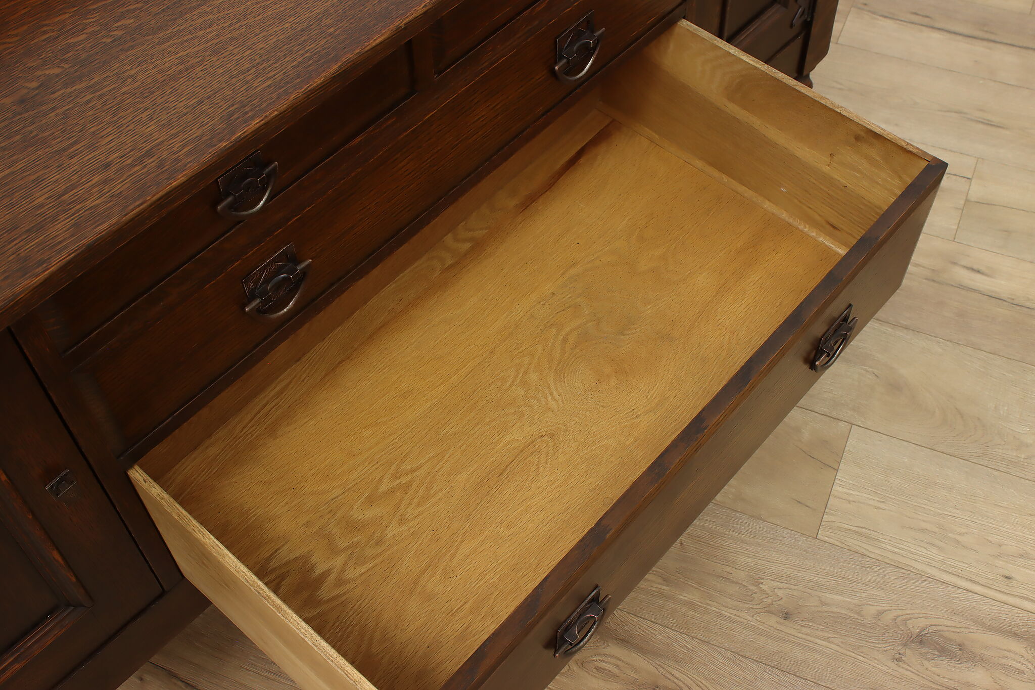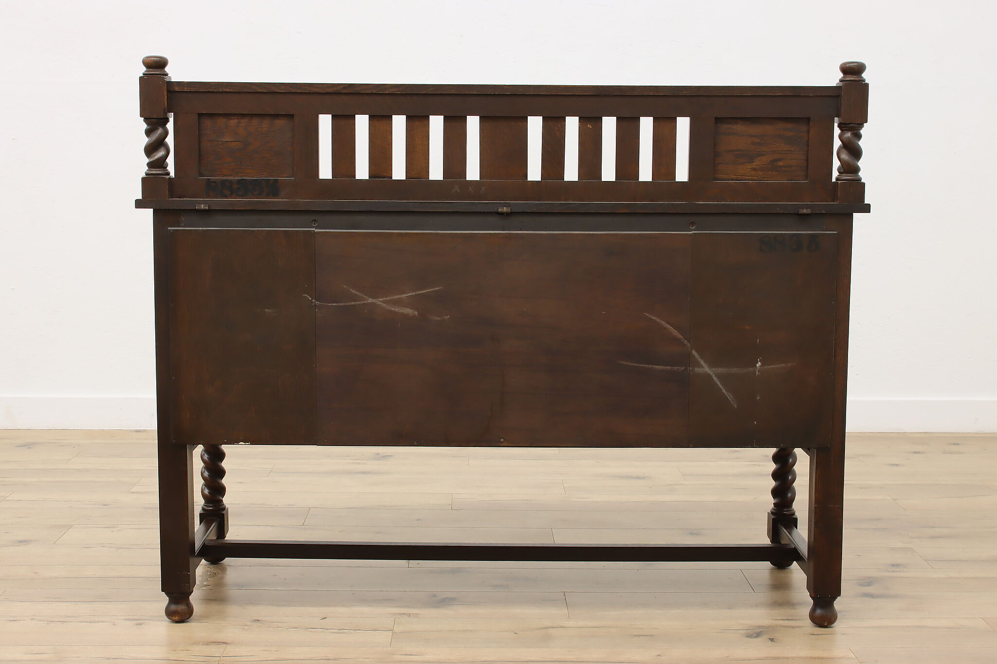 During the Arts & Crafts Mission period, there was an English Tudor revival that created pieces with both style designs. This sideboard, buffet or bar is an excellent example of the era with its twist columns and Craftsman hardware.