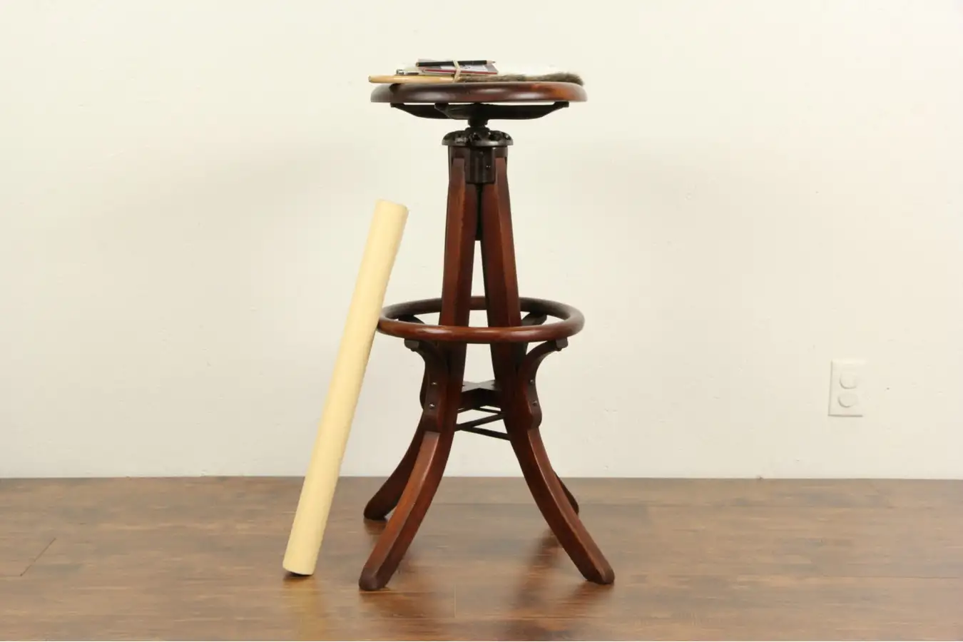 American made antique Craftsman furniture, this rugged stool is commercial grade, reglued to serve another generation. The iron revolving mechanism has a ring to adjust height, one iron arm is missing but the stool remains solid and durable. The top is sculpted for comfort, there is a foot rest ring around the base.