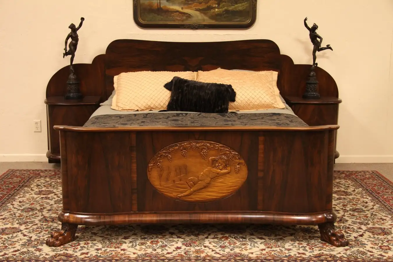 A carved Cupid panel adorns a dramatic rosewood queen size bed with attached nightstands or bedside tables. Sweeping graceful Art Deco curves are expressed in matched rosewood, supported by lion paw feet.