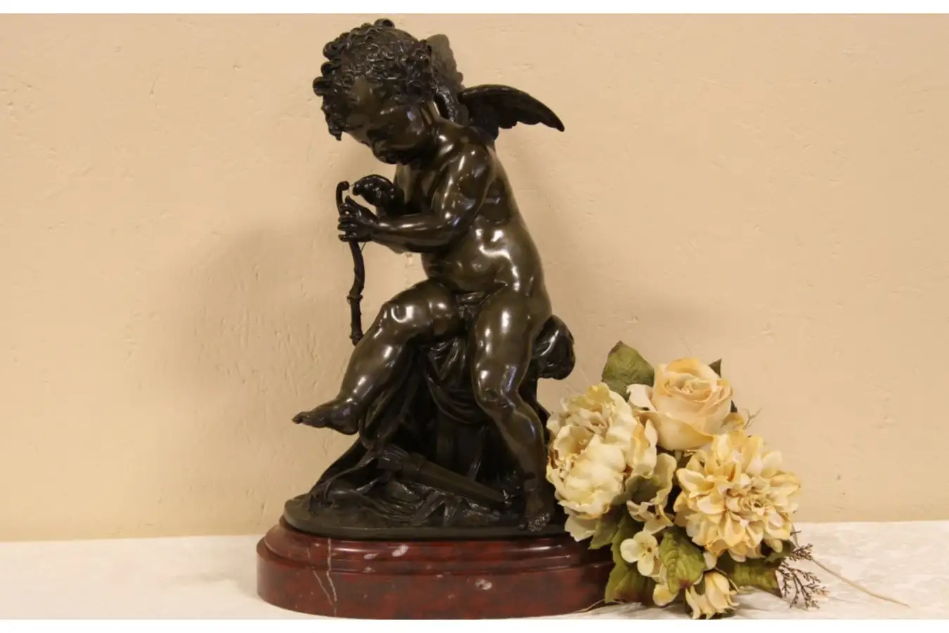 This antique statue dates from about 1900, and is mounted on a red marble base. Embossed into the base is Clodion's signature. His dates are 1738-1814, and is especially well known for Rococo figures like this - cupids in playful but sophisticated scenes, done with exquisite skill and insight. One of his later works is on the Arc de Triomphe in Paris.