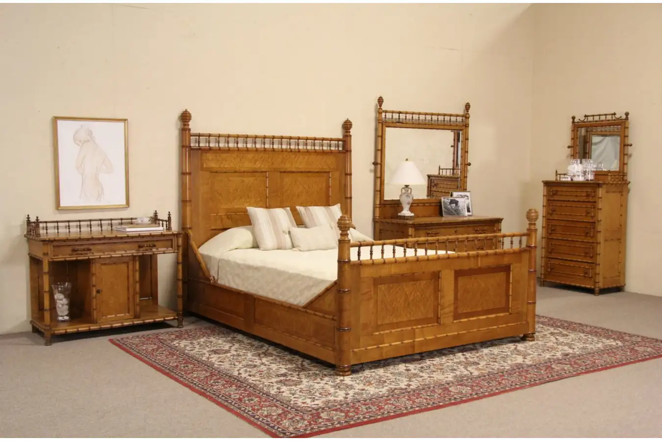 A spectacular 1870's bedroom set is curly or "birdseye" maple, and includes a queen size bed, high boy or tall sidelock chest, dresser and washstand.