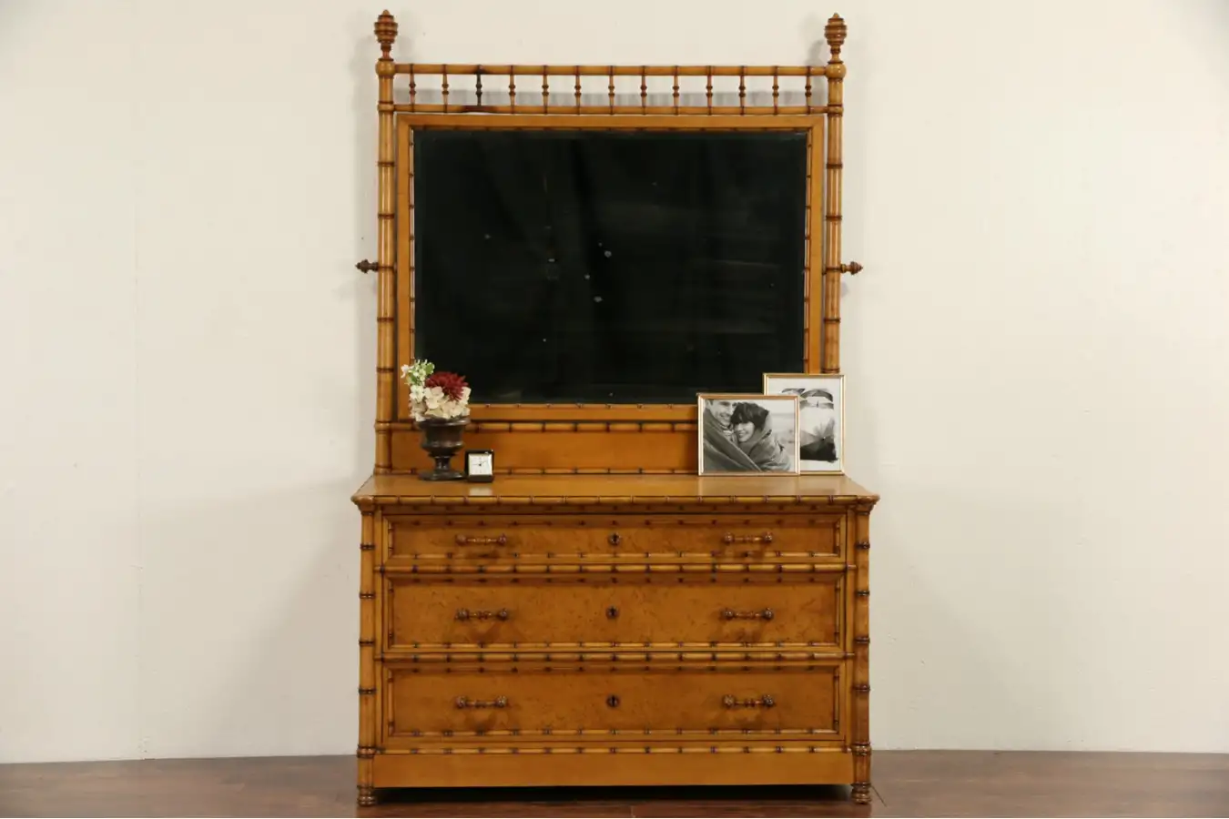A spectacular 1870's chest or dresser with mirror is curly or "birdseye" maple.