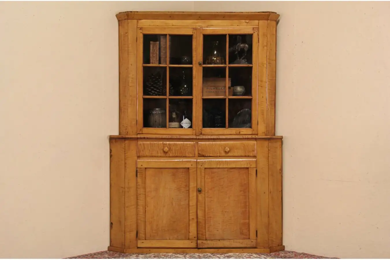 A wonderful corner cupboard was hand crafted about 1830 of solid curly or tiger grain maple, and is said to be from New England.