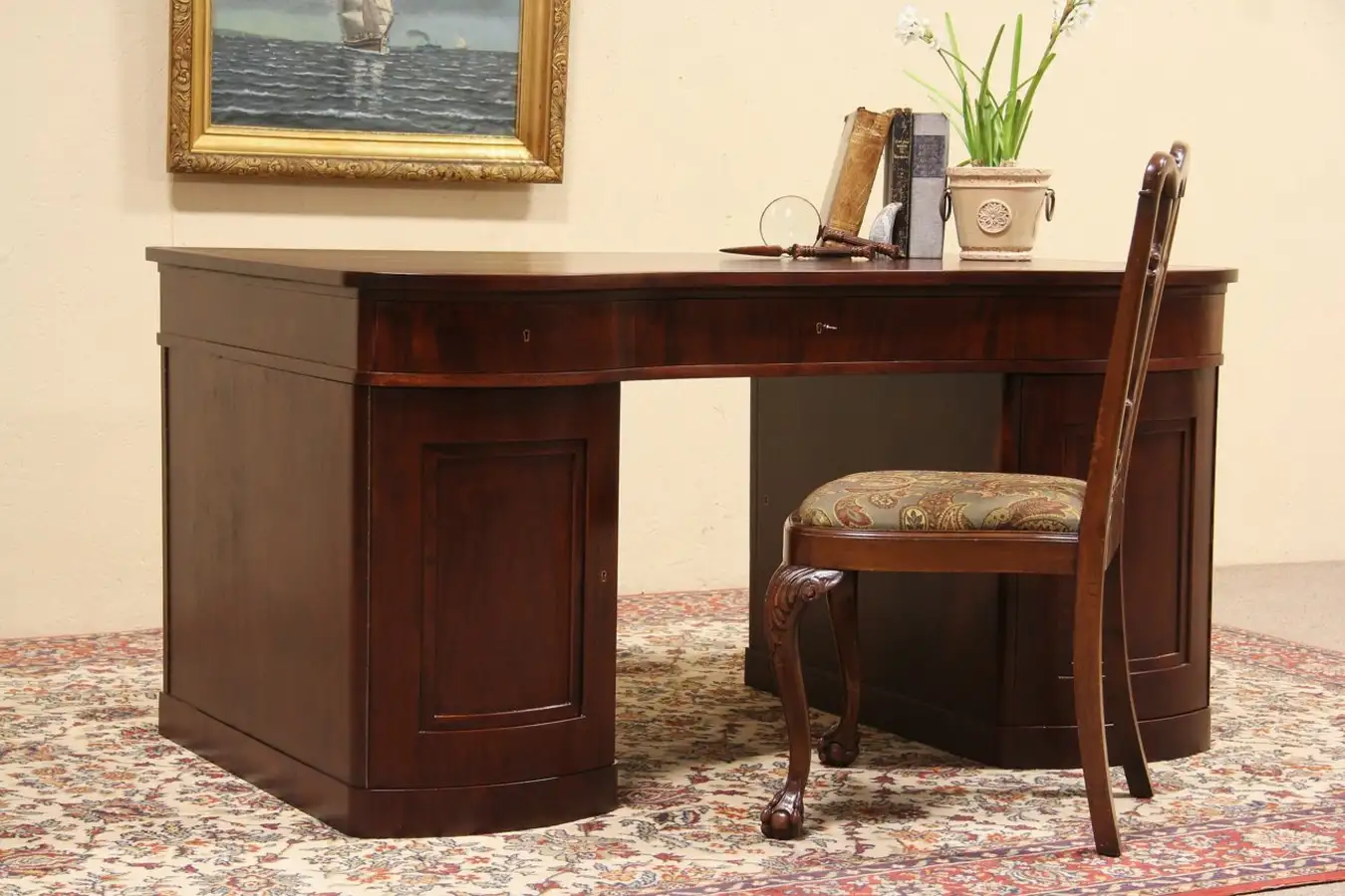 Measurements of this sophisticated and understated antique furniture are 5' long, 33" deep, 30" tall and the knee hole is 24" high.