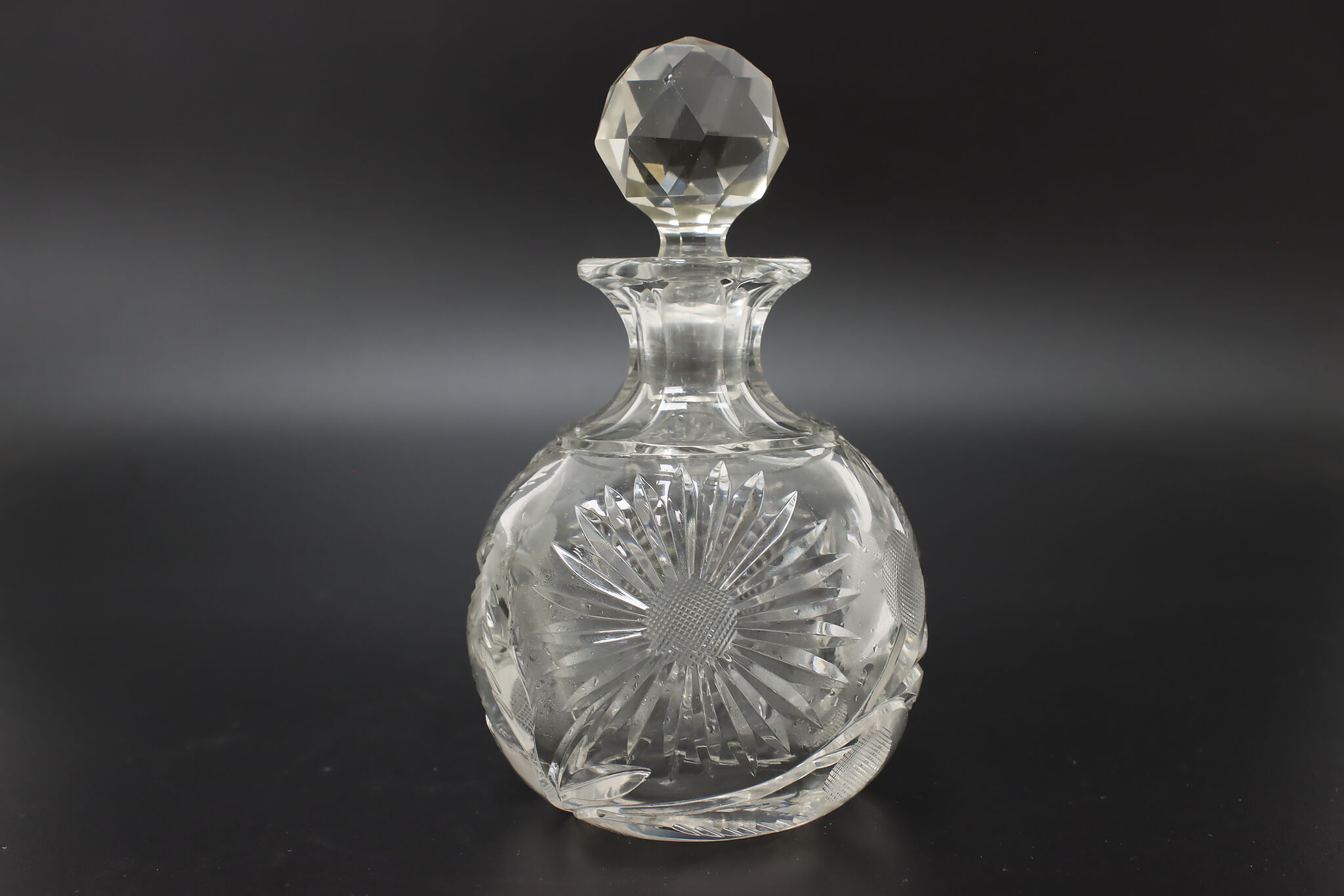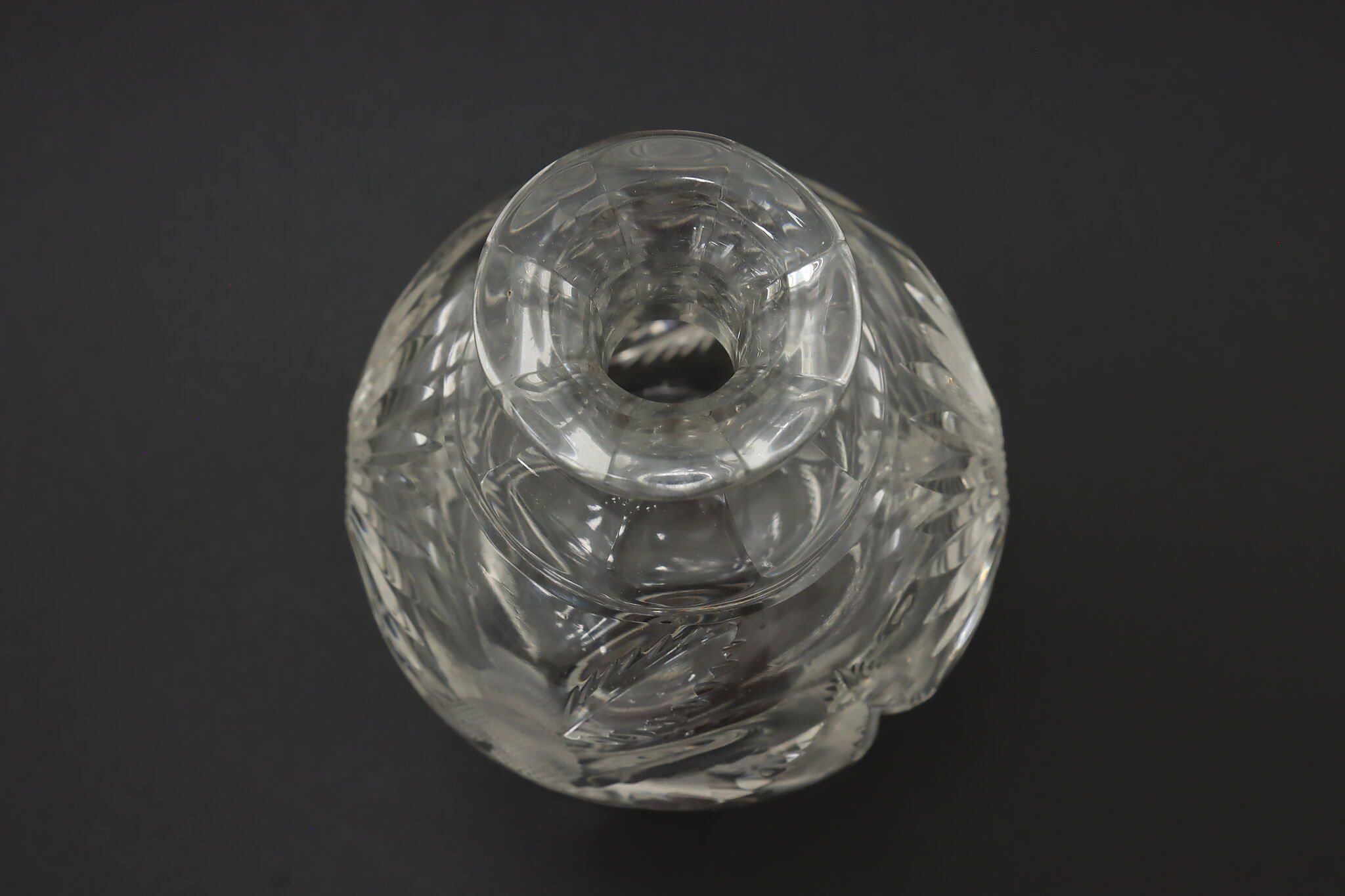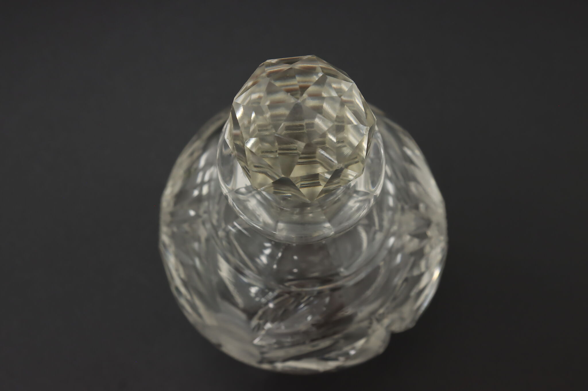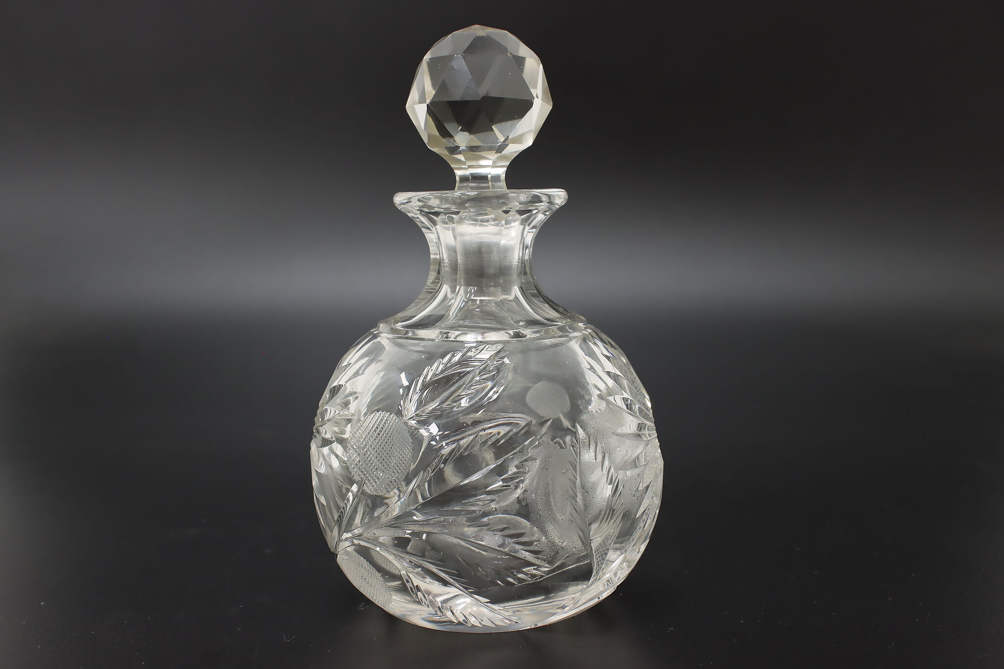 This beautiful perfume, cologne or scent bottle has lovely cut floral motifs, making it a charming addition to your boudoir dresser or vanity.