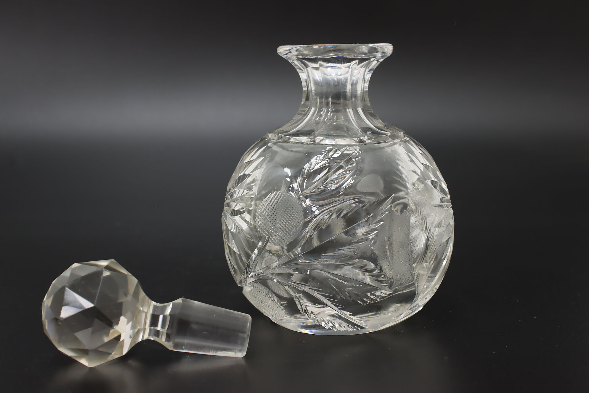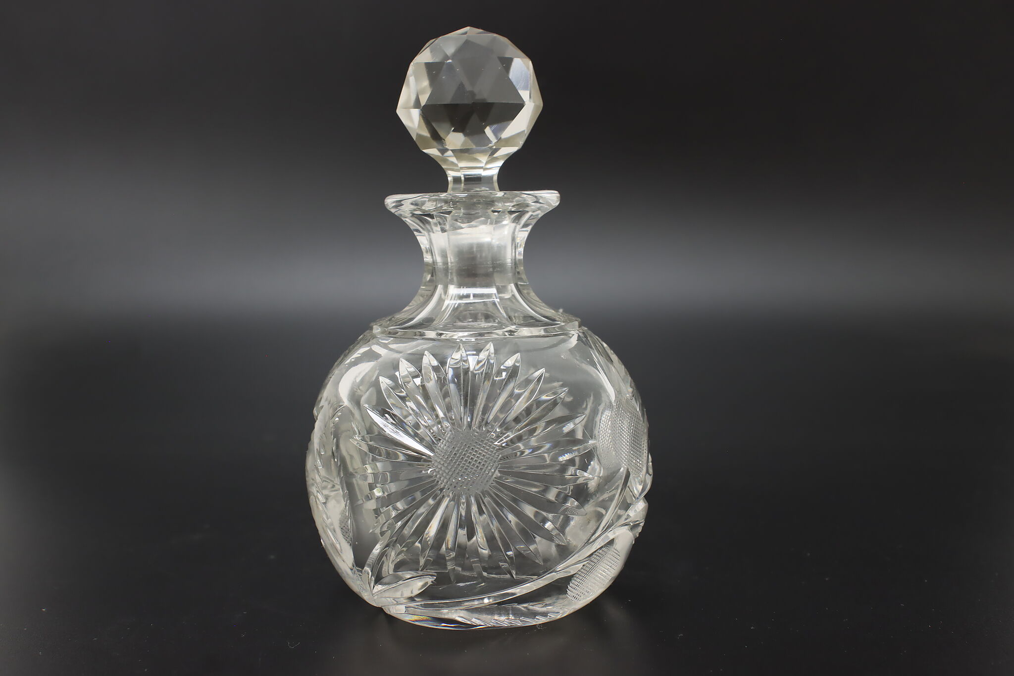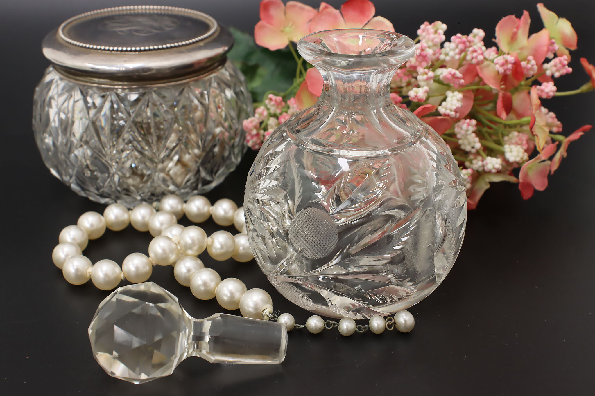 This beautiful perfume, cologne or scent bottle has lovely cut floral motifs, making it a charming addition to your boudoir dresser or vanity.
