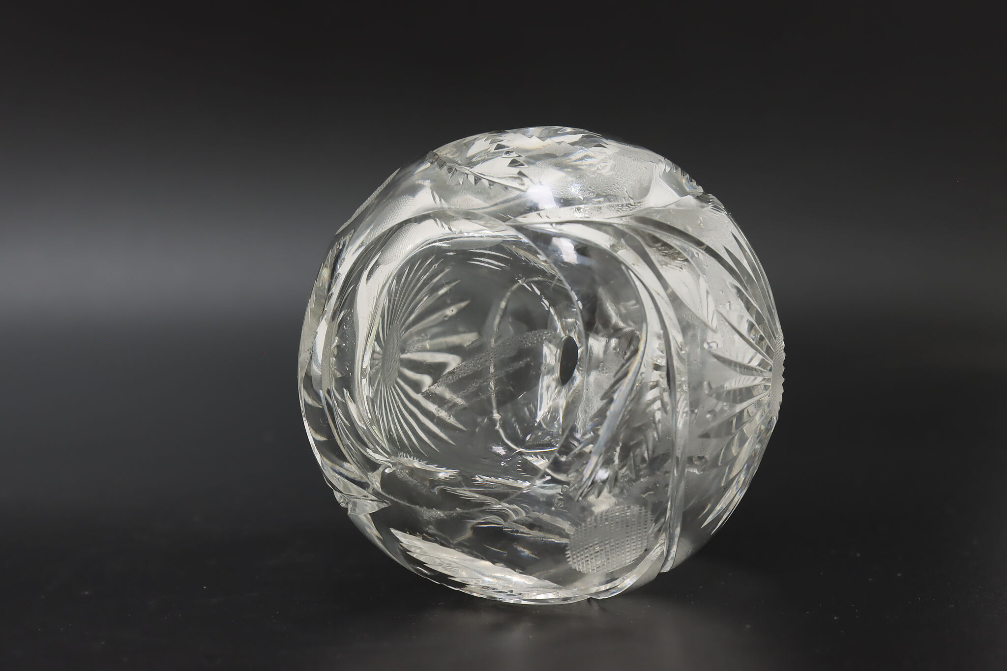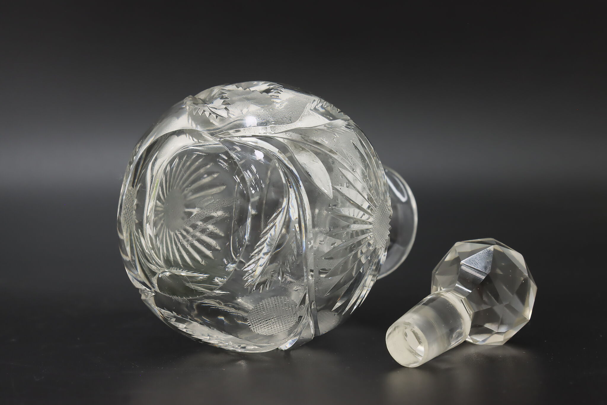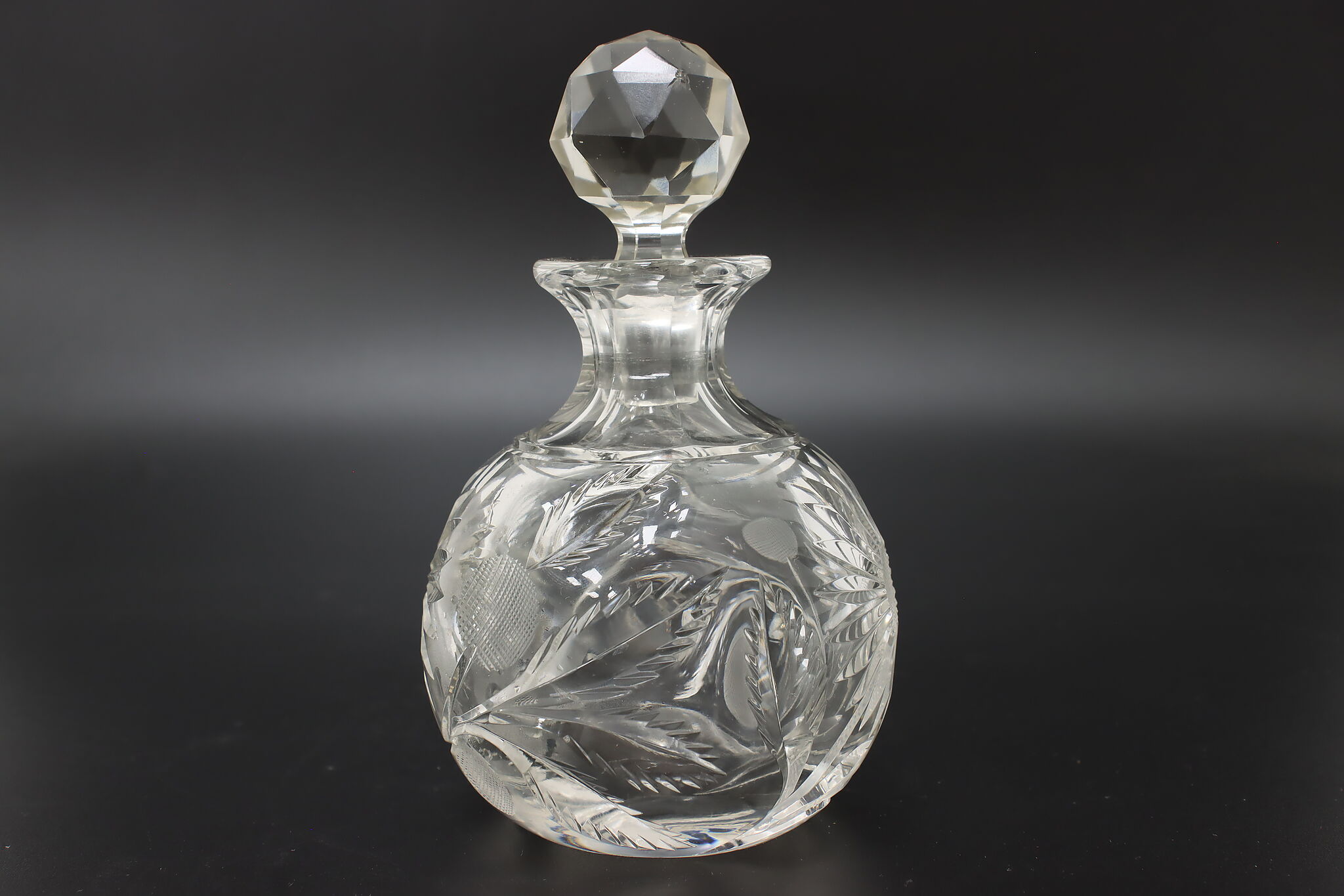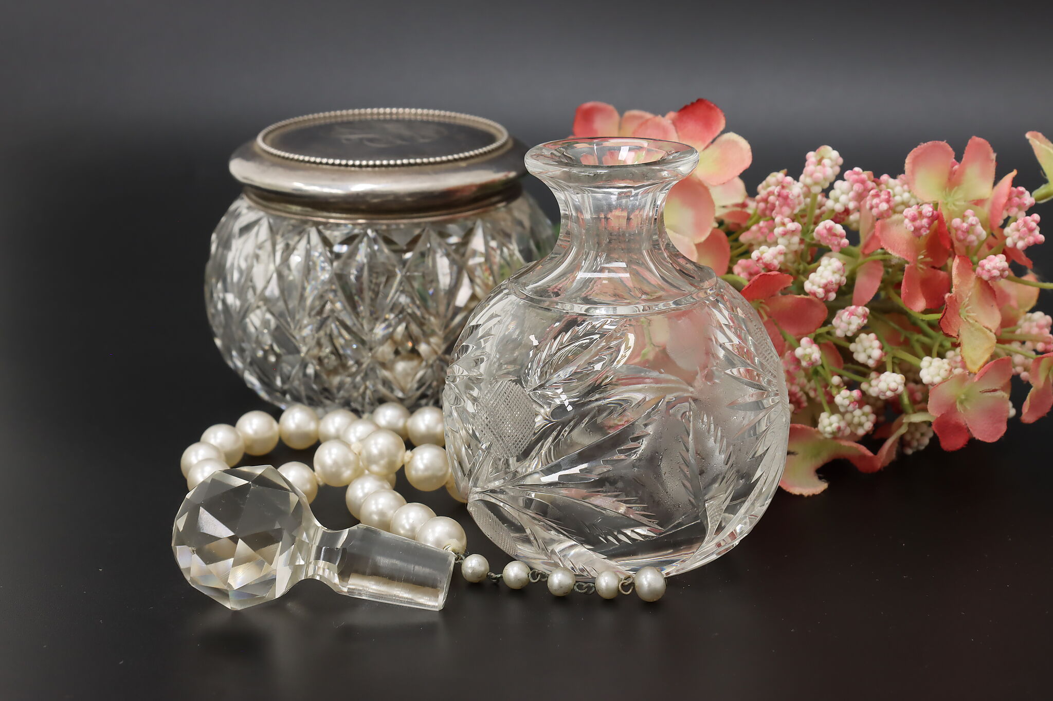 This beautiful perfume, cologne or scent bottle has lovely cut floral motifs, making it a charming addition to your boudoir dresser or vanity.