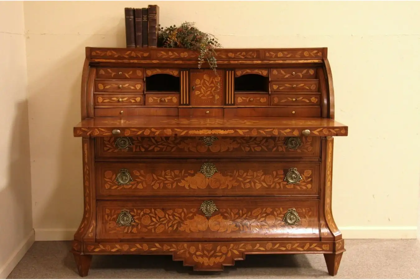 With considerable antique "character," there are mars, shrinkage separations and touchups, see photos. When the desk is opened, there are "secret" drawers inside, plus a large swivel tray for inkwells and pens. Large lower drawers have solid oak sides and chamfered bottoms with hand cut dovetail joinery. Brass hardware with cupid heads appears original. The sleek and elegant design is magnificent on this historic furniture, recalling an age when Holland was a world power.