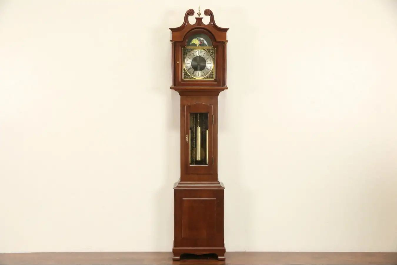 Signed "Daneker," this "grandmother" size long case clock has a solid cherry case and is about 60 years old. The movement has been professionally cleaned and oiled and keeps excellent time. The brass movement counts the hours and plays Westminster on the quarter and half hours. The case has an excellent finish on this vintage American made furniture. This clock needs to be "set up" when delivered - weights and pendulum attached and the case leveled. Most of our customers can do this as we walk them through the fairly simple steps by phone. The process is not very difficult, and it is also nice to know how to do this again whenever the clock needs to be moved for cleaning, painting or whatever. A few customers prefer to hire a local clockmaker at their own expense to make a house-call and set up the clock, which is usually not very expensive, depending on your location. Measurements are 17" wide, 10" deep and 73" tall. See 25 photos on Harp Gallery website that enlarge to full screen size.