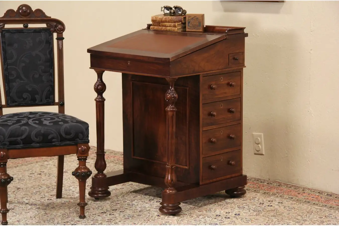 A marvelous example of a Victorian period "ship captain's" or Davenport desk from England, this 1870's secretary makes remarkably efficient use of space. Richly figured mahogany wood has an excellent finish, preserving lots of mars and dings for antique character.