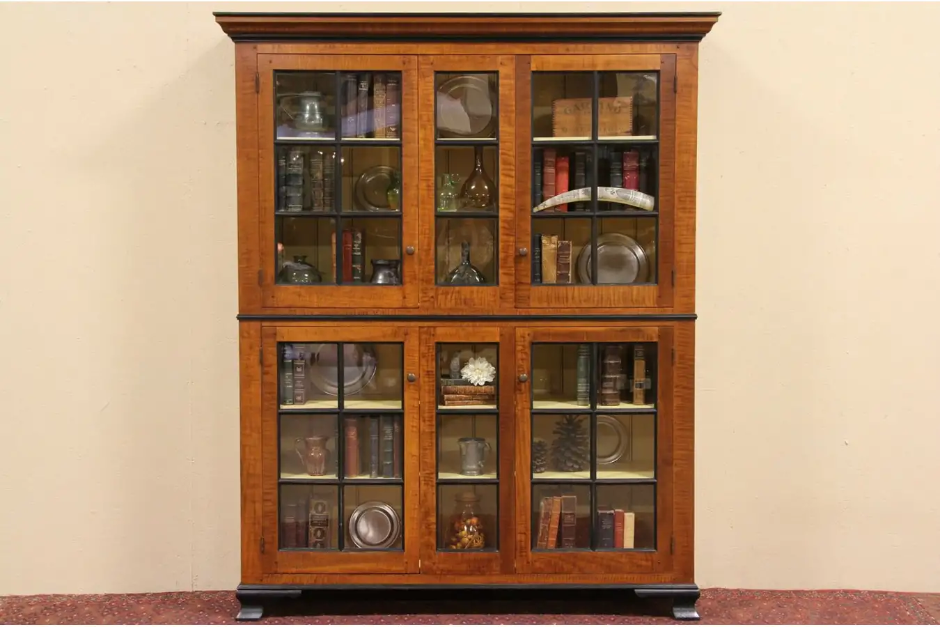 Wavy glass panes, beaded ship lap back boards, hand painted tiger maple grain and black-green moldings all show the master craftsmanship and attention to detail this beloved maker is known for.