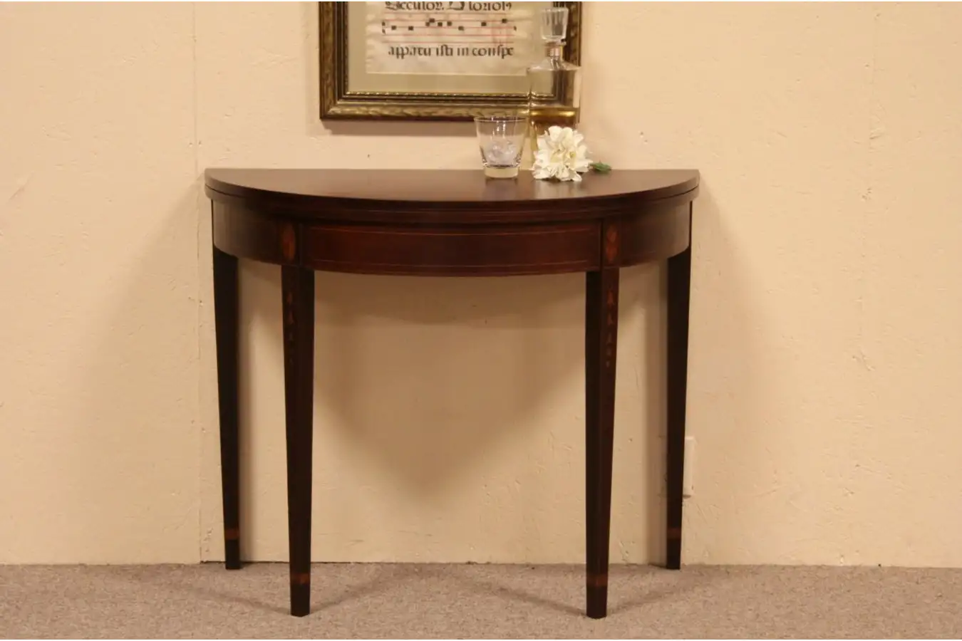 This elegant Hepplewhite design demilune or half round console table from the 1920's opens to a round game table.
