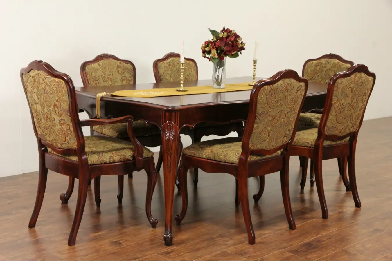 Gracefully carved in the French manner, this 1940's dining set comprises a table with three leaves and six chairs - all newly upholstered.