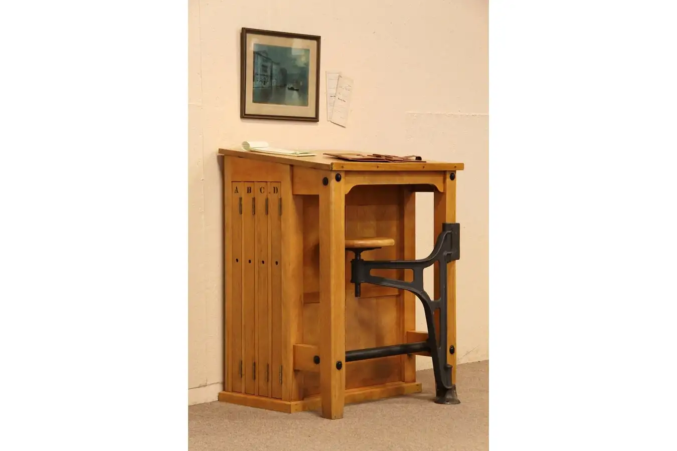 This slant top drafting or drawing desk was originally used in art and architectural drawing classes, and would be useful to many artists. Solid birch and maple, the top slopes. Used either standing or with the stool, there is an iron foot rest. The swivel stool has adjustable height and is removable.