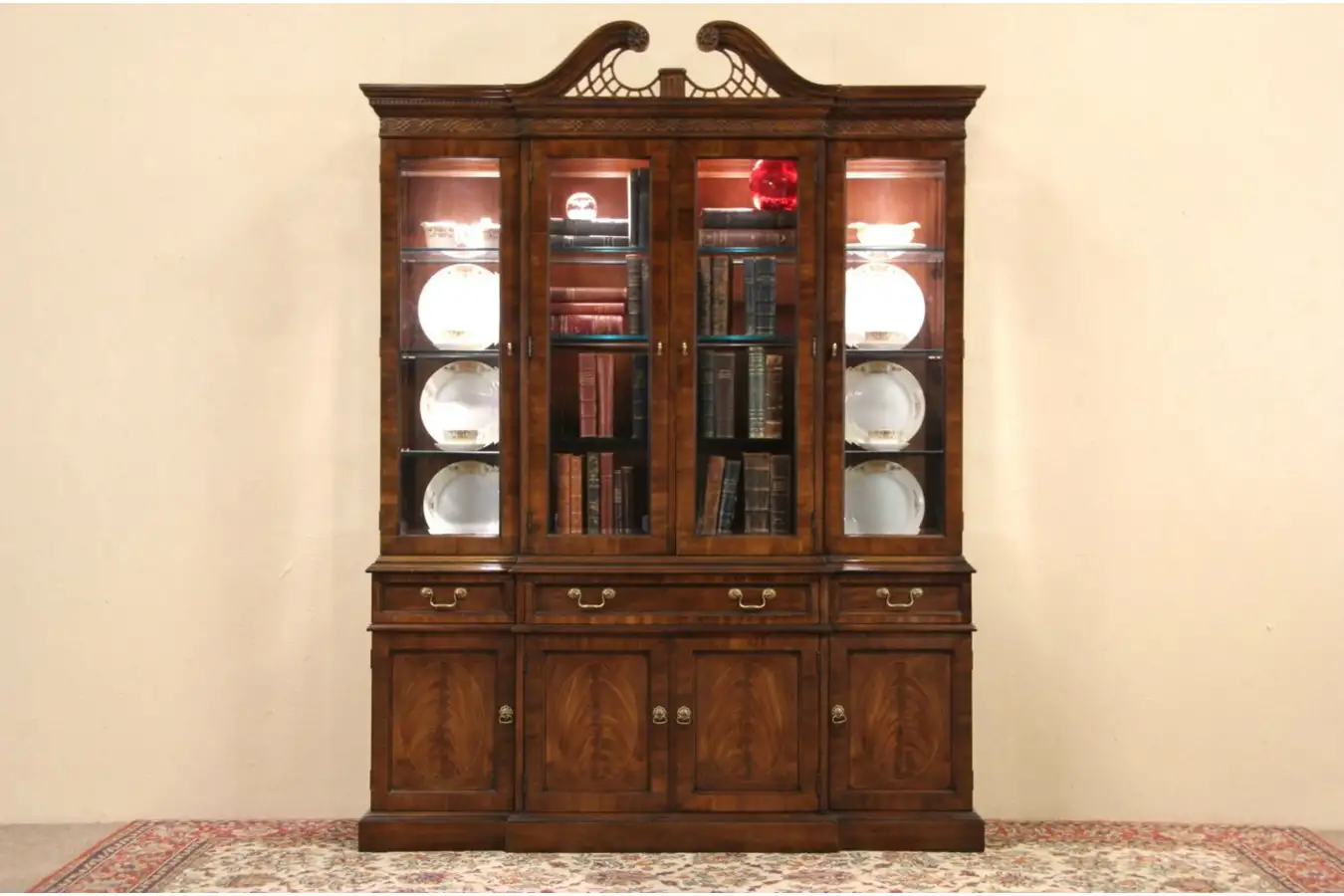 The interior is lighted, books should be kept away from the top mounted bulbs. Three separate banks of adjustable thick plate glass shelves have carved grooves to display plates, if desired. Drawers have dovetailed solid oak sides, there is a removable Pacific cloth silverware caddy.