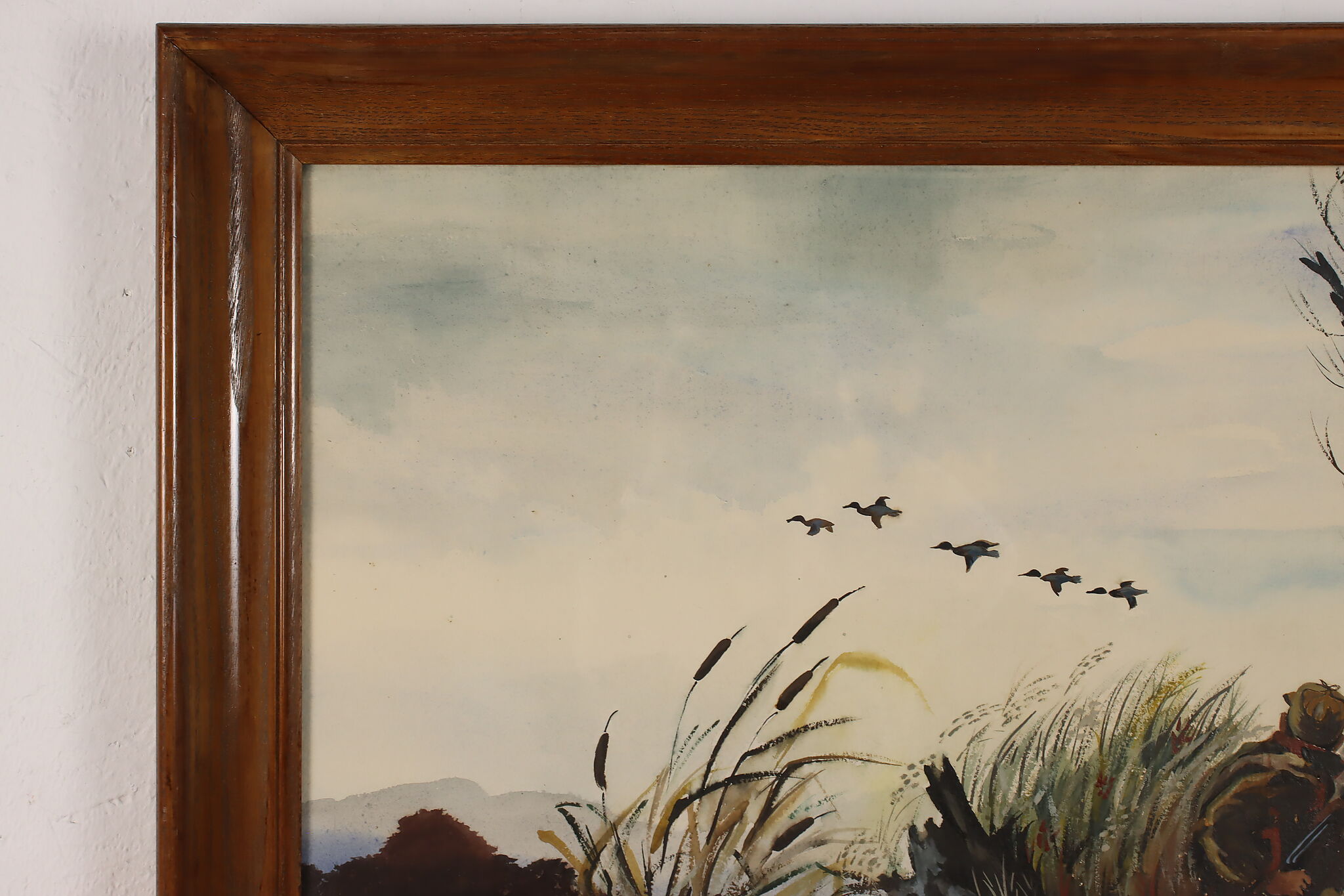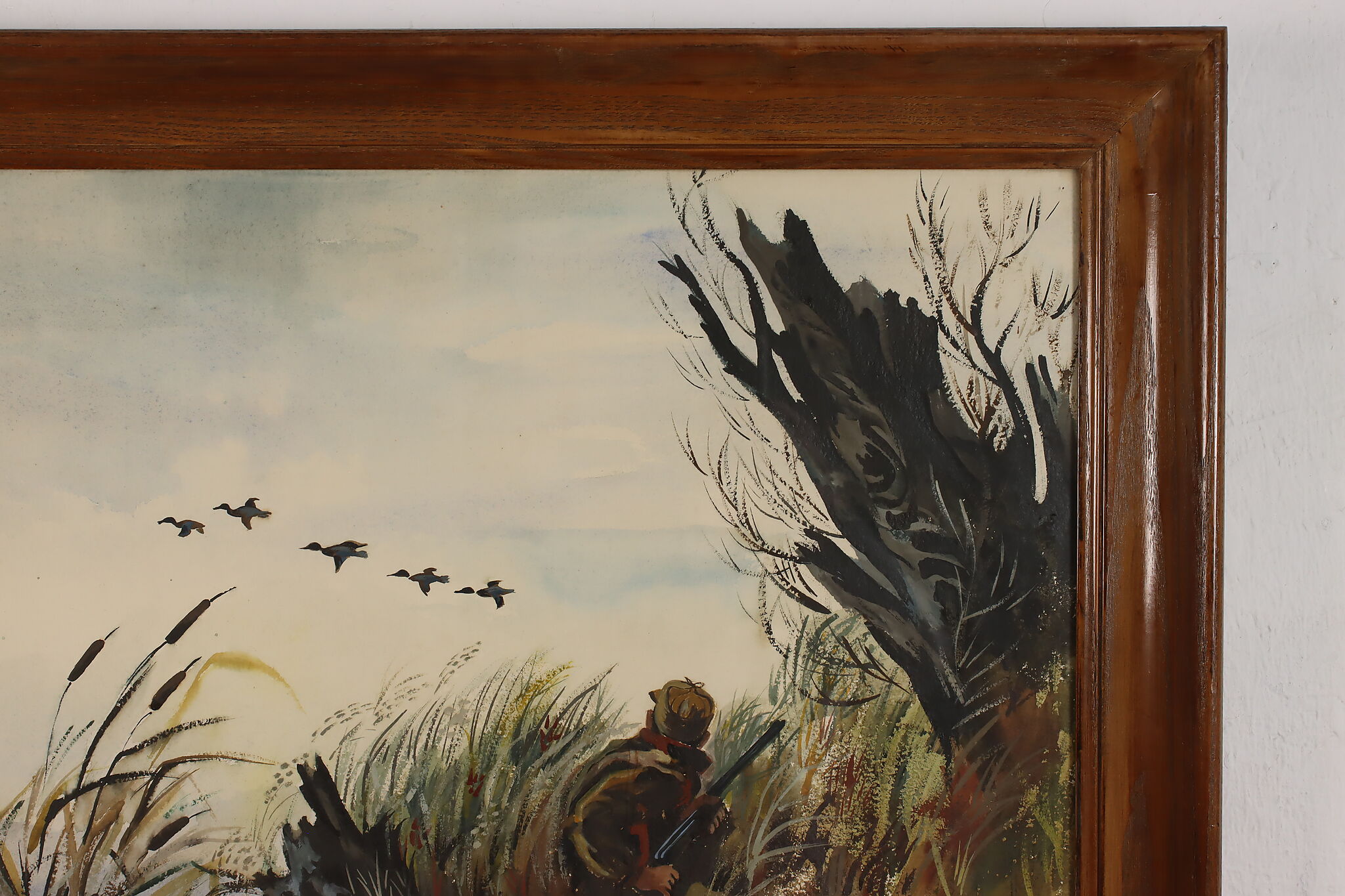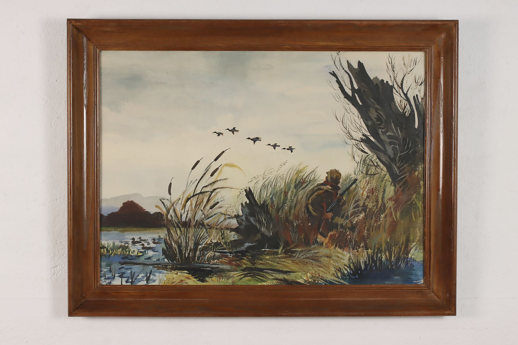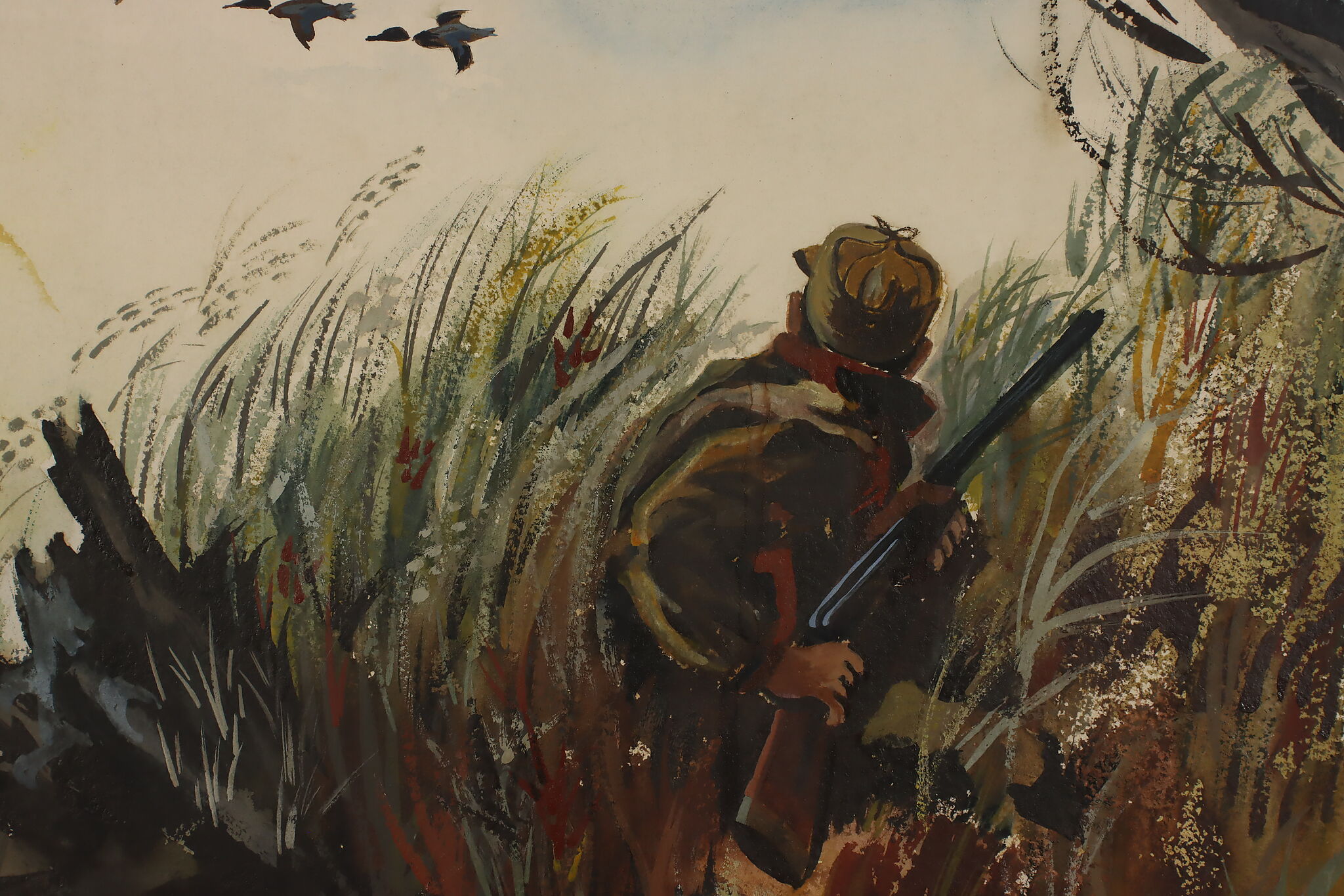 The patient hunter waits for the ducks to fly over him in this fantastic painting.