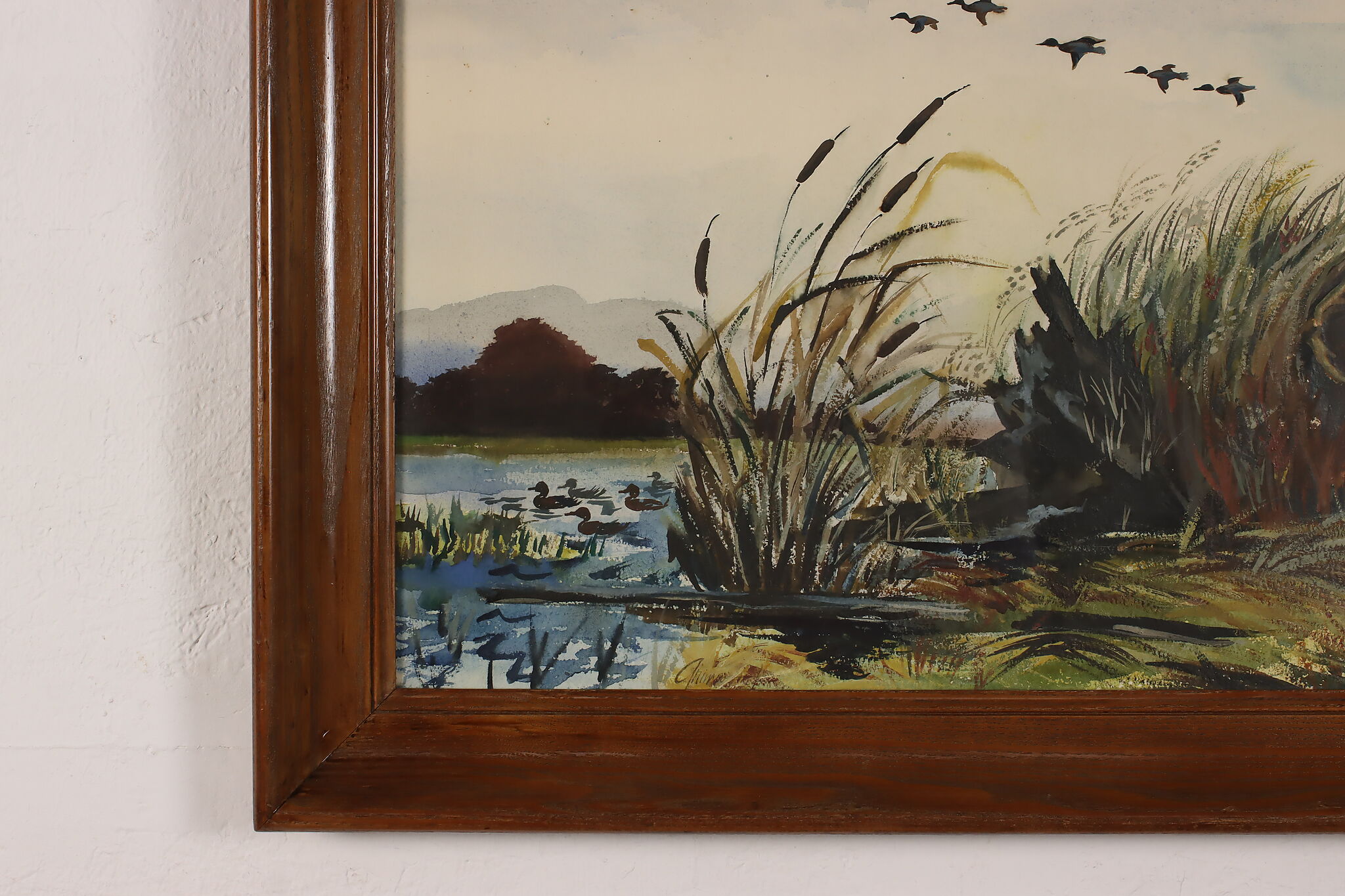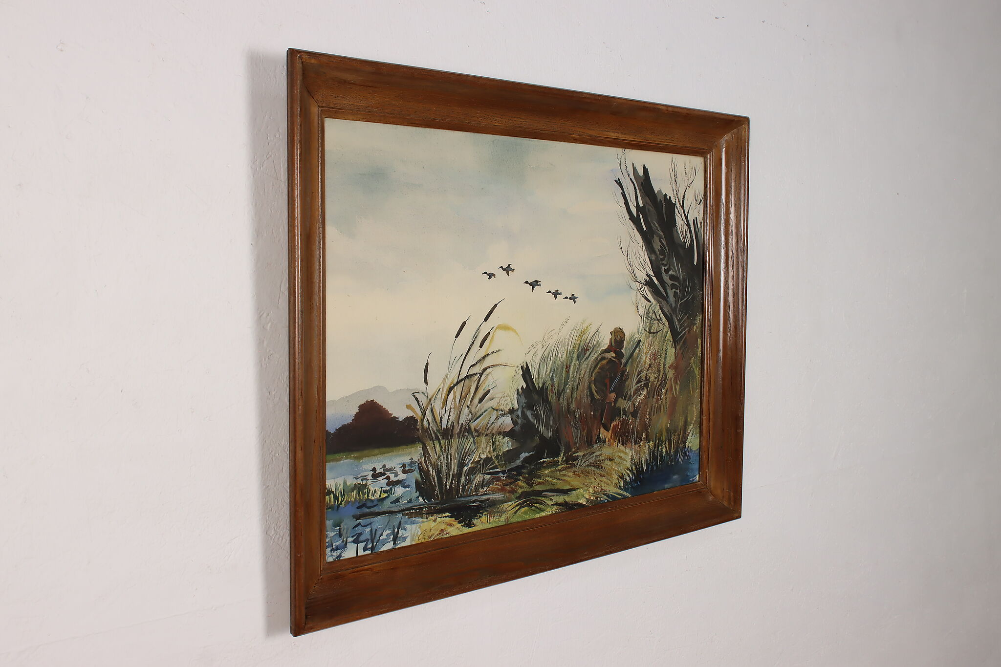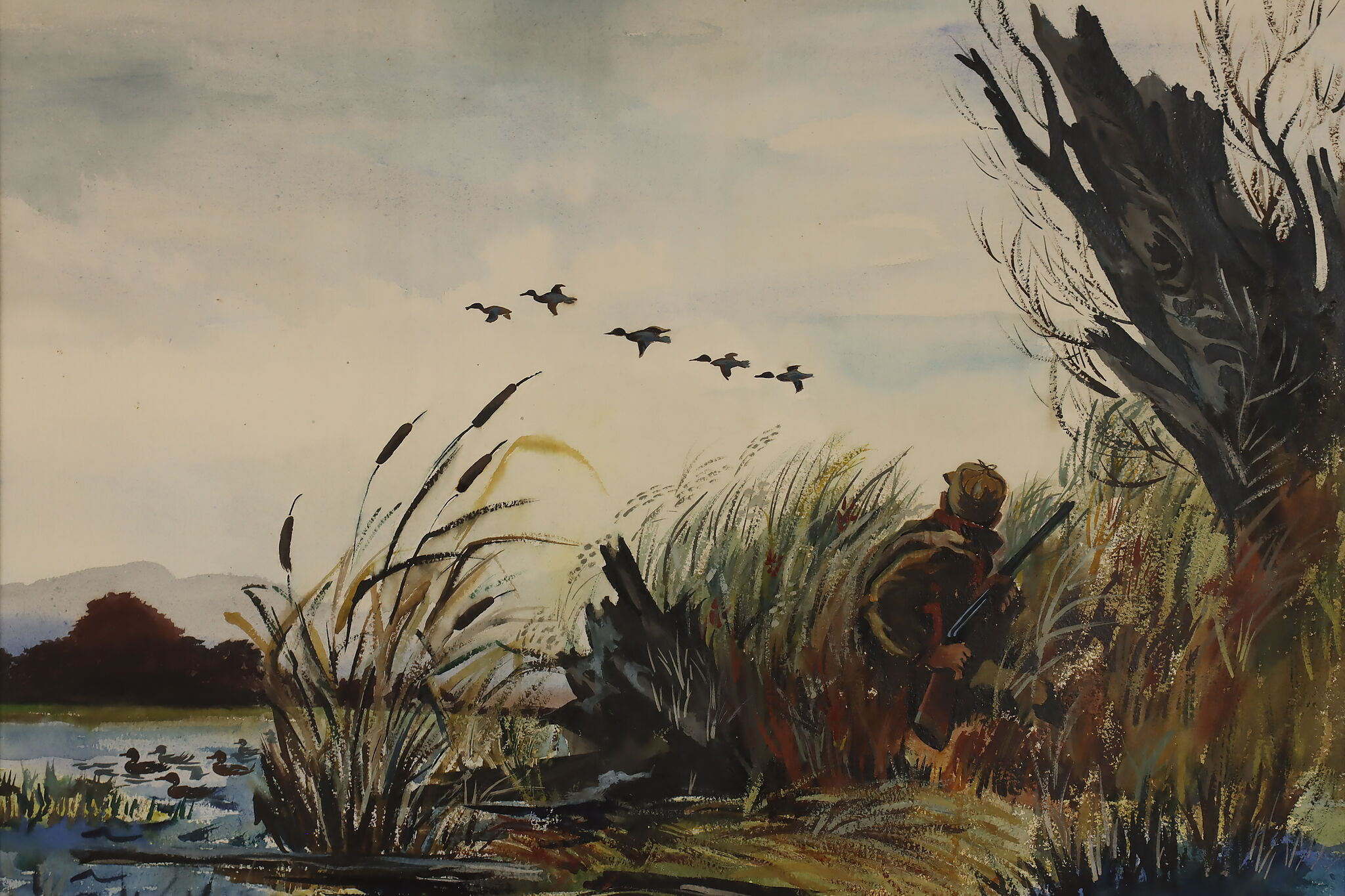 The patient hunter waits for the ducks to fly over him in this fantastic painting.