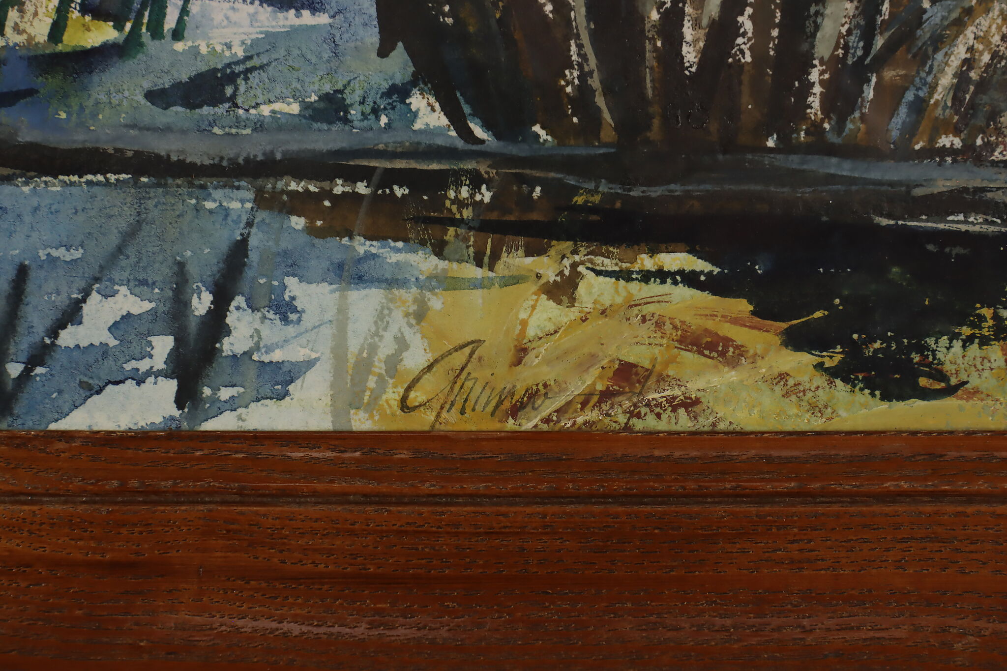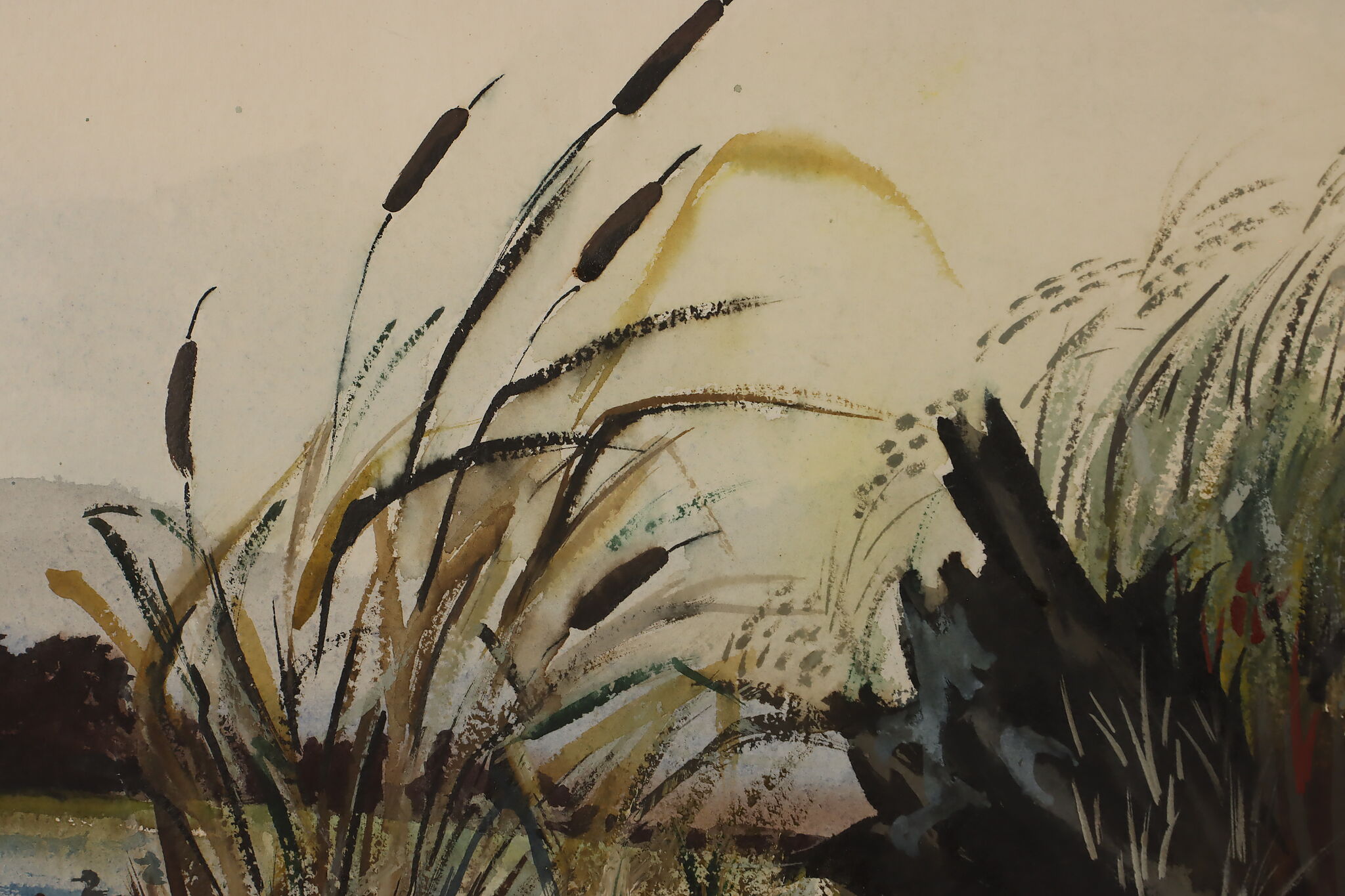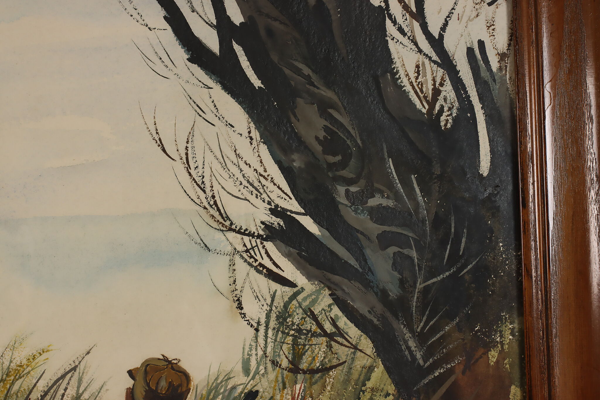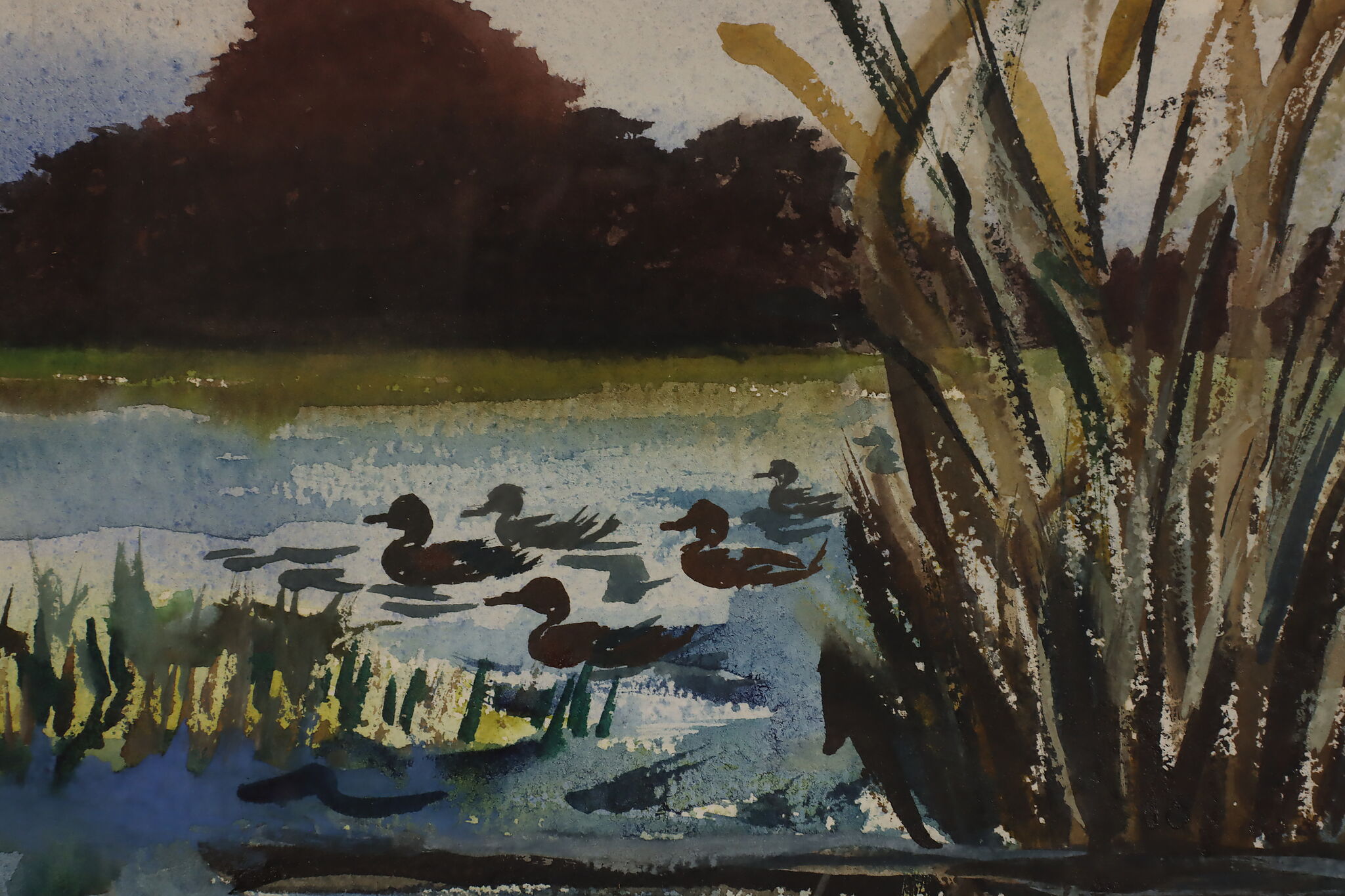 The patient hunter waits for the ducks to fly over him in this fantastic painting.