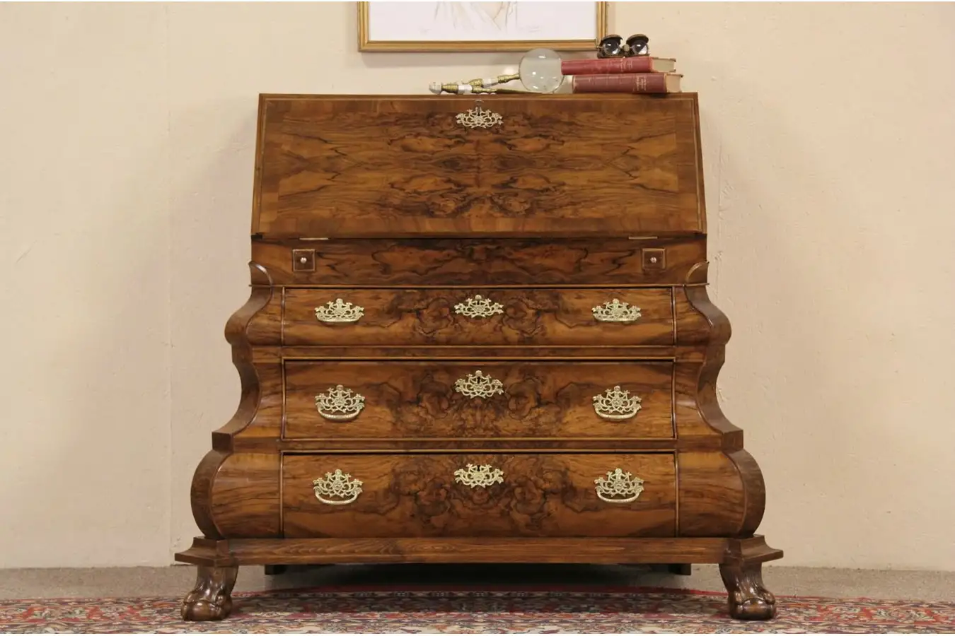 A classic Dutch Baroque secretary desk has convex "bombe" sides and carved ball and claw feet. Expertly crafted in Holland in the 1940's, the warm finish is in excellent condition on intricate matched walnut burl with banding.